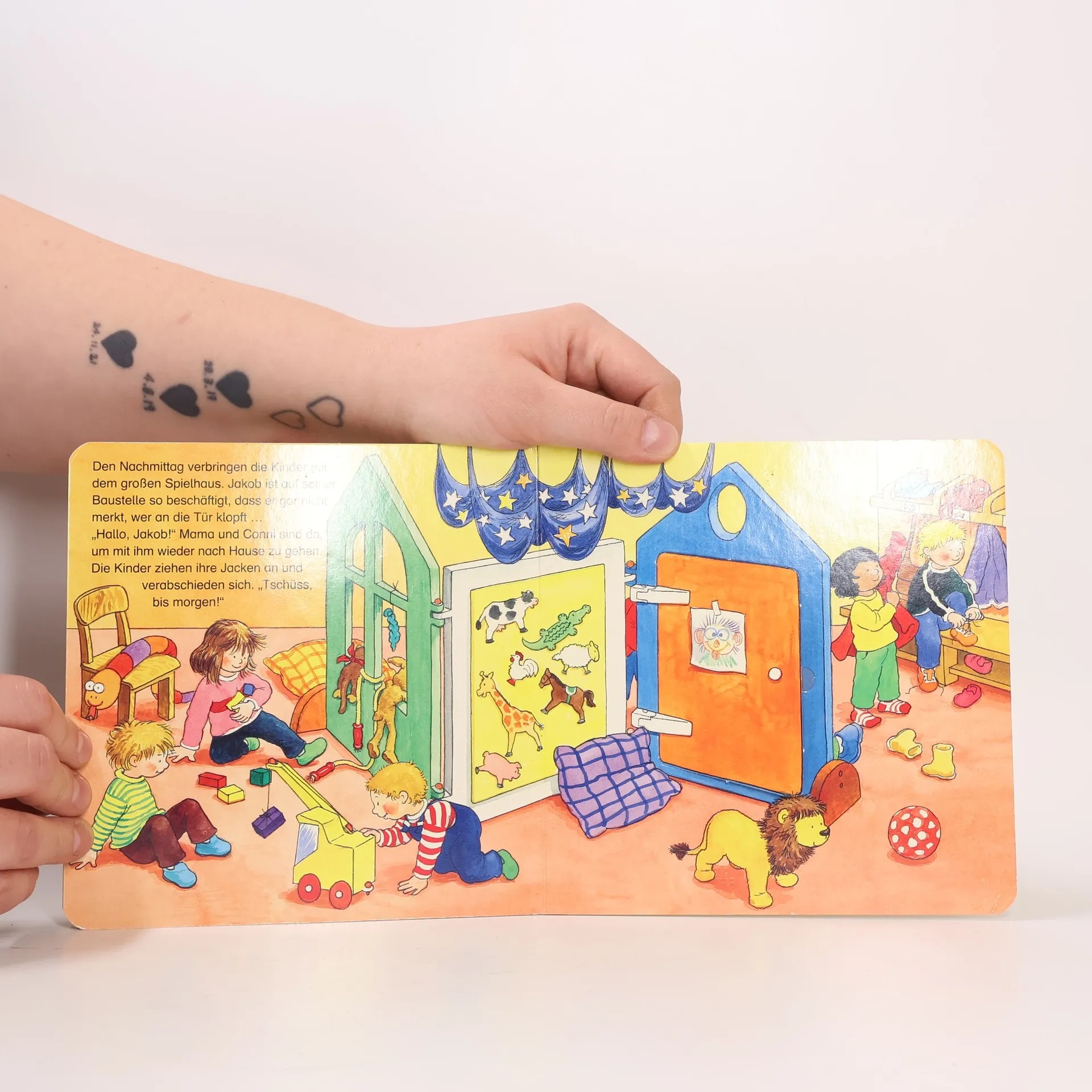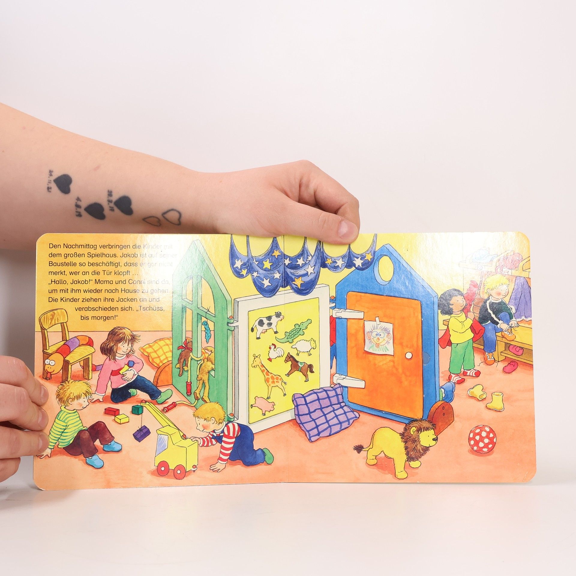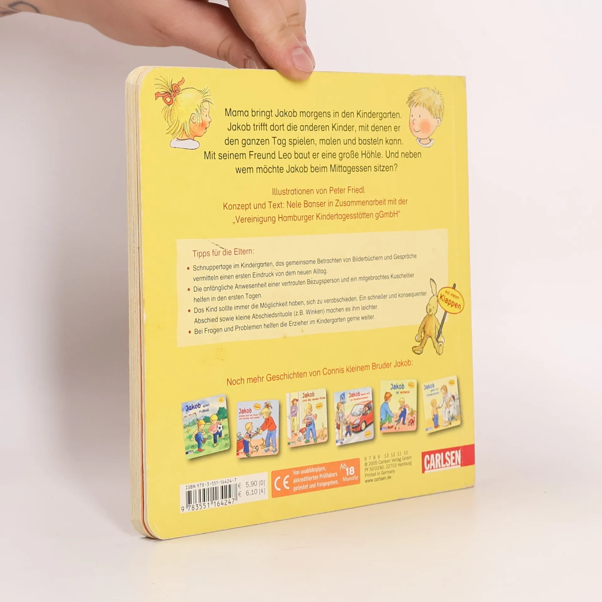 Jakob freut sich auf den Kindergarten, weil er dort viel Zeit mit seinem besten Freund Alex verbringen kann. Und natürlich auch mit all den anderen Kindern. Sie spielen, essen zu Mittag, machen einen Mittagsschlaf, und haben viel Spaß zusammen.