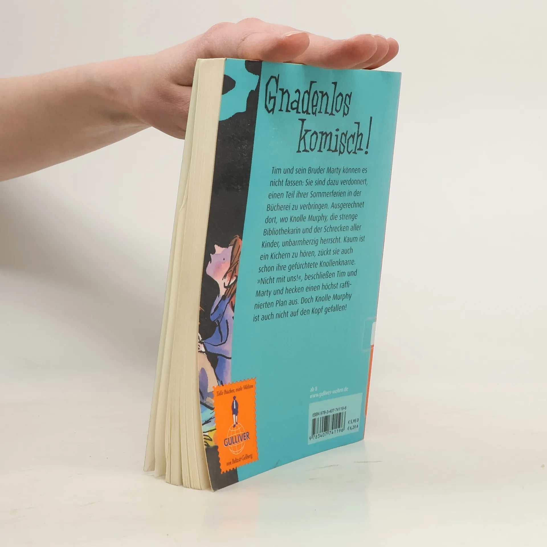 »Gnadenlos komisch!« DB mobil Tim und sein Bruder Marty werden dazu verdonnert, einen Teil der Sommerferien in der Bücherei zu verbringen. Ausgerechnet dort, wo Knolle Murphy, strenge Bibliothekarin und Schrecken aller Kinder, unbarmherzig herrscht. Kaum ist ein Kichern zu hören, zückt sie schon ihre gefürchtete Knollenknarre. “Nicht mit uns!”, beschließen die beiden Rabauken und hecken einen raffinierten Plan aus. Aber Knolle Murphy ist nicht auf den Kopf gefallen. Eine meisterhaft erzählte, höchst komische Geschichte mit vielen Bildern.