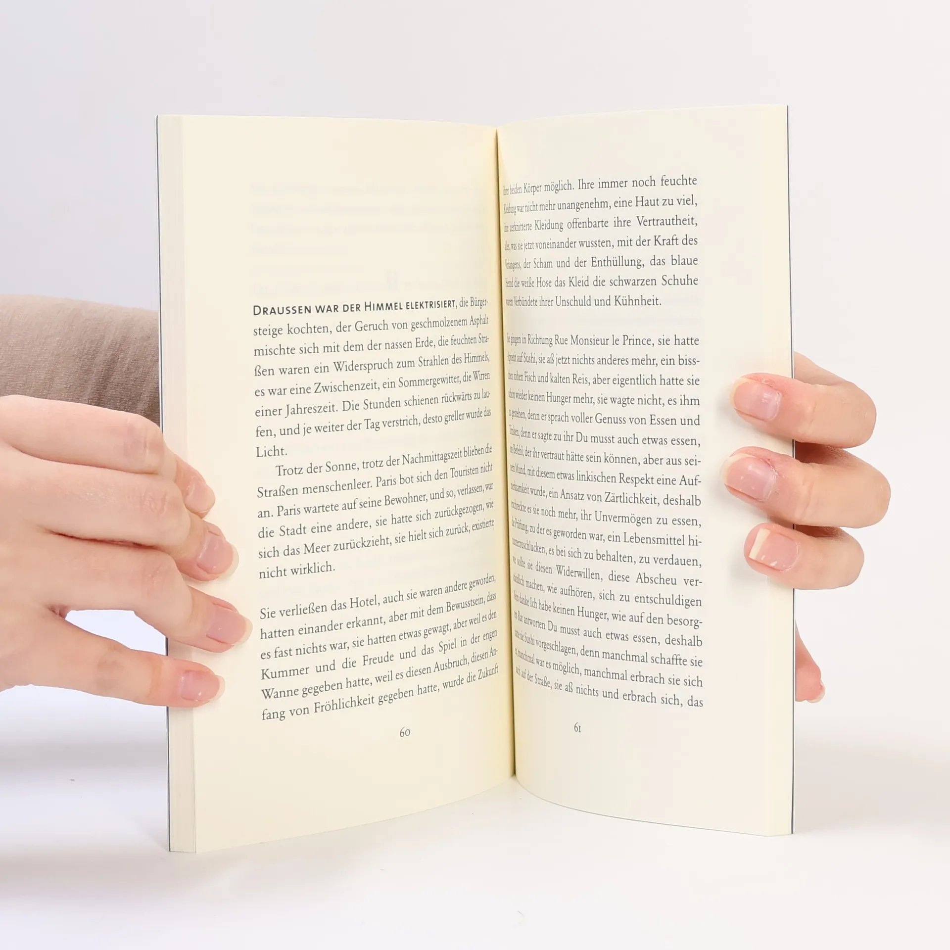 Zwei Menschen treffen sich in einem Pariser Café, spazieren bei Regen durch den Jardin du Luxembourg. Er hat sie früher schon begehrt, und sie hat es ignoriert. Aber jetzt nun hat sie ihn angerufen, obwohl sie sich kaum kennen. Doch die Begegnung ist aufgeladen vom ersten Moment an, jede Geste ein Versprechen. Sie und er: beide nicht mehr jung, nicht perfekt, von der Liebe verletzt, ein wenig misstrauisch. Ohne viele Worte gehen sie in ein nahes Hotel, verbringen den Nachmittag im Bett. Was nicht mehr sein soll als Sex, wird zu einem Grenzgang, einer Befreiung. Ein erotischer Roman mit einer verstörend präzisen Mischung von Härte und Sensibilität.