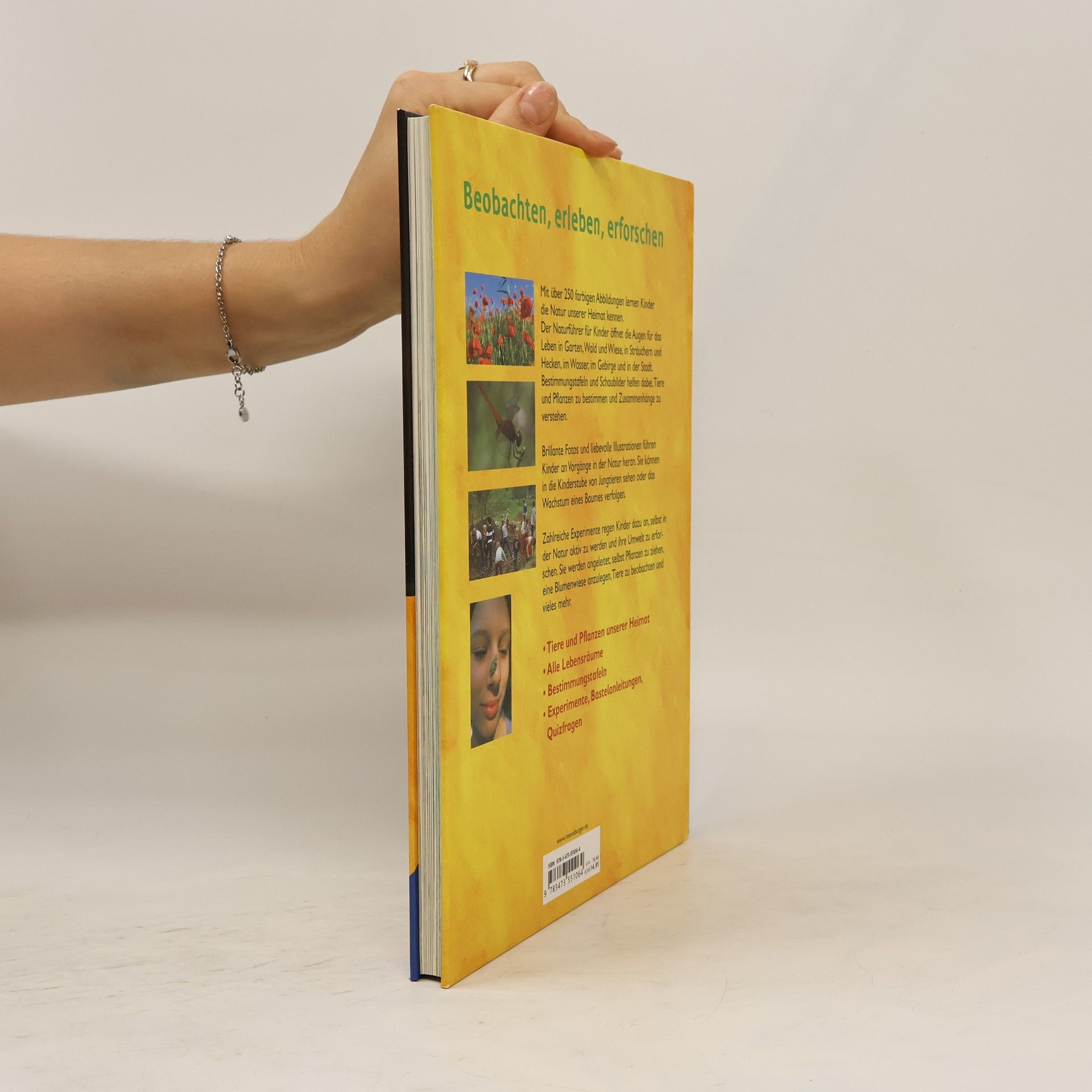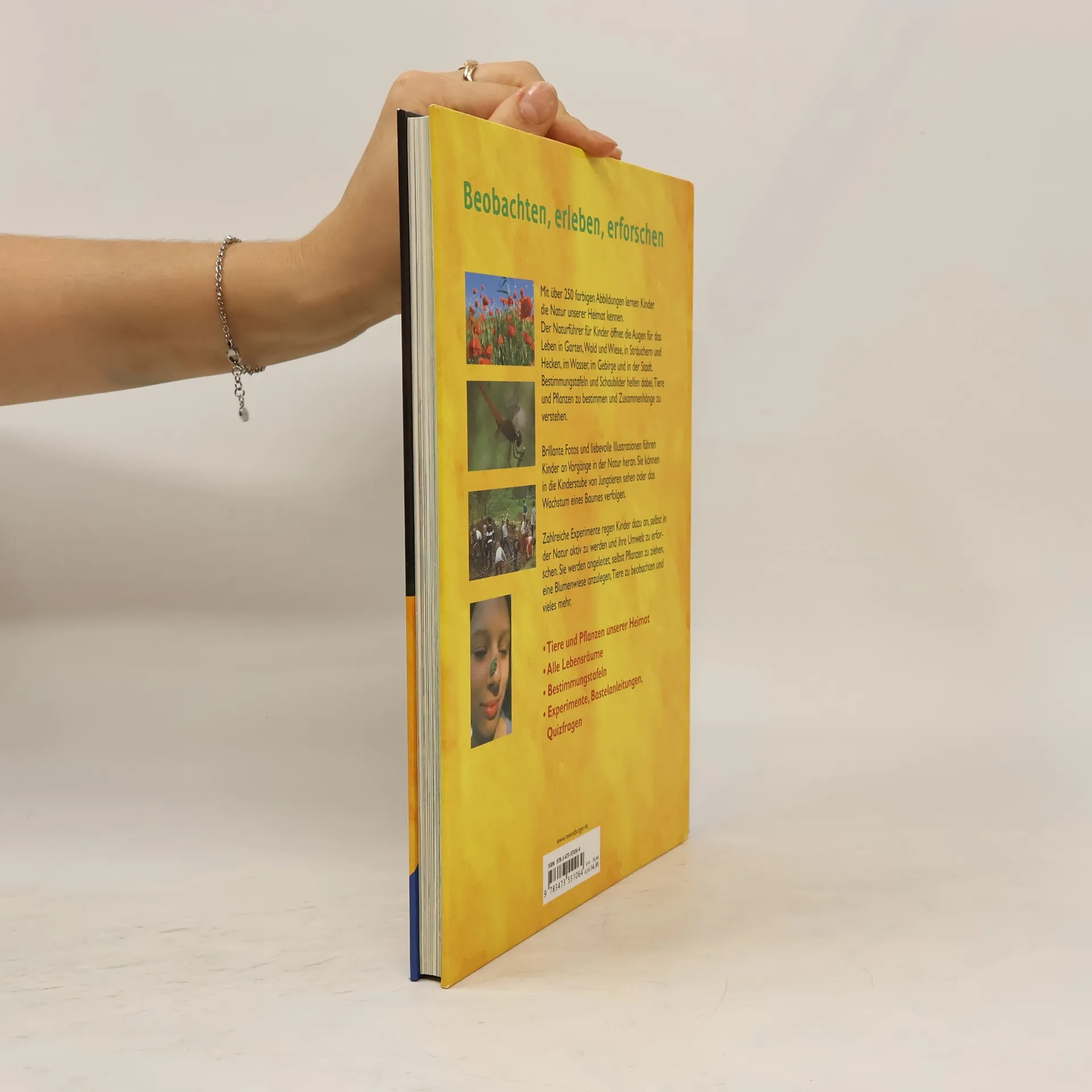 Bäume bestimmen, Blumen- und Tiernamen kennen, über die Abläufe der Natur Bescheid wissen: Mit diesem reich bebilderten ersten Naturführer erkunden Kinder die Natur ihrer Heimat. Brillante Fotos und liebevolle Illustrationen öffnen ihnen die Augen für das Leben in den Lebensräumen Garten, Wald und Wiese, Sträucher und Hecken, Wasser, Gebirge und Stadt. Der Praxisteil am Ende jeden Kapitels leitet Kinder dazu an, selbst Pflanzen zu ziehen, eine Wildblumenwiese oder einen Gartenteich anzulegen. Außerdem: Zahlreiche Tipps und Anleitungen für eigene Experimente rund um das Thema Natur.