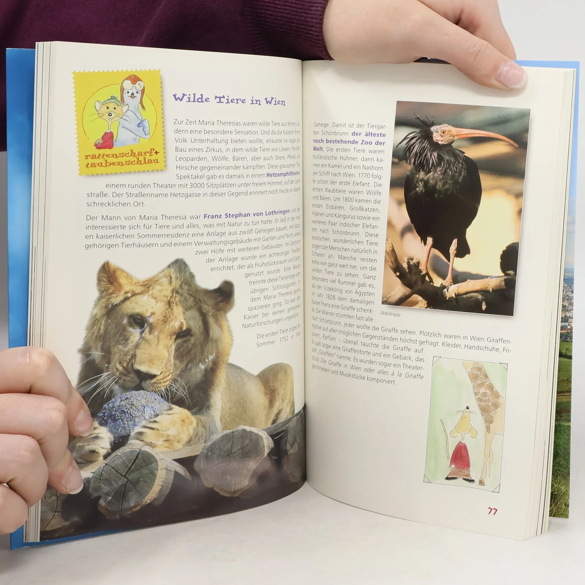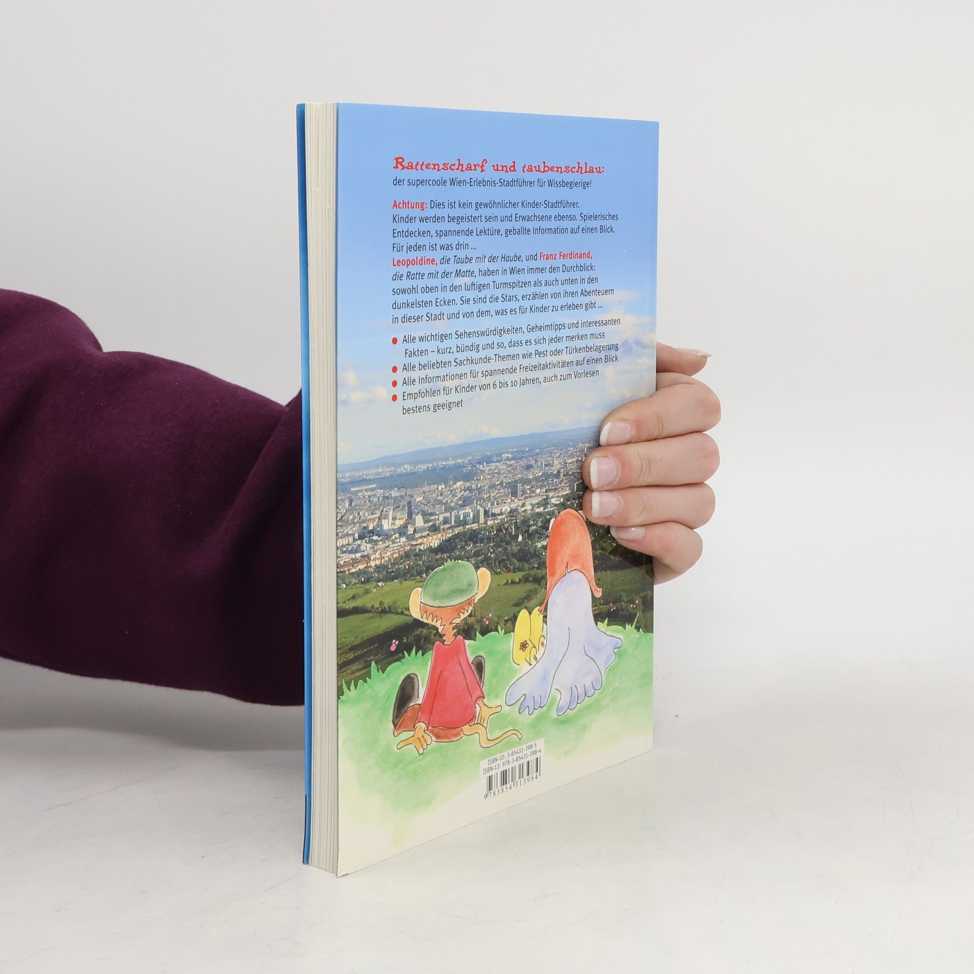 Rattenscharf und taubenschlau: der supercoole Wien-Erlebnis-Stadtführer für Wissbegierige! Achtung: Dies ist kein gewöhnlicher Kinder-Stadtführer. Kinder werden begeistert sein und Erwachsene ebenso. Denn die 176 Seiten funktionieren beinahe wie ein Überraschungs-Ei: spielerisches Entdecken, spannende Lektüre, geballte Information auf einen Blick. Für jeden ist was drin … Die beiden Helden haben in Wien immer den Durchblick: Leopoldine, die Taube mit der Haube, und Franz Ferdinand, die Ratte mit der Matte: sowohl oben in den luftigen Turmspitzen als auch unten in den dunkelsten Ecken. Sie sind die Stars, erzählen von ihren Abenteuern in dieser Stadt und von dem, was es für Kinder zu erleben gibt. Der Aufbau des Buches richtet sich dabei ganz nach deren Bedürfnissen: In welche Rolle möchte ich heute schlüpfen, was kann ich heute erleben? Bin ich heute Forscher auf Zeitreise oder interessiert mich z. B. eher, wie die U-Bahn funktioniert? Optimal unterstützt werden die Abenteuer von Leopoldine und Franz Ferdinand durch kindgerechte Illustrationen und Fotos.