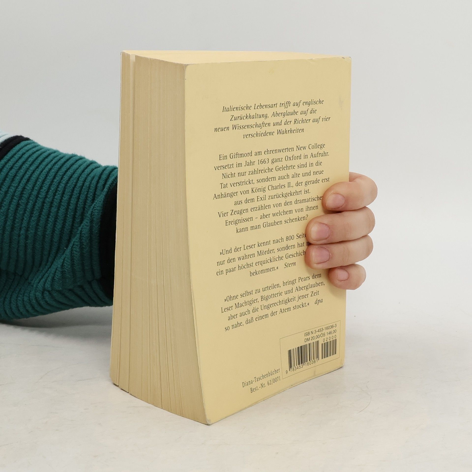 Oxford im Jahre 1663: Ein mysteriöser Giftmord am ehrenwerten New College hält die gesamte Stadt in Atem. Zahlreiche Gelehrte scheinen in die Tat verstrickt zu sein. Der Richter, der die Fäden entwirren soll, trifft auf vier verschiedene Wahrheiten. „Und der Leser. hat nebenbei ein paar höchst erquickliche Geschichtsstunden bekommen.“ STERN „Ohne selbst zu urteilen, bringt Pears dem Leser Machtgier, Bigotterie und Aberglauben, aber auch die Ungerechtigkeit jener Zeit so nahe, dass einem der Atem stockt.“ DPA