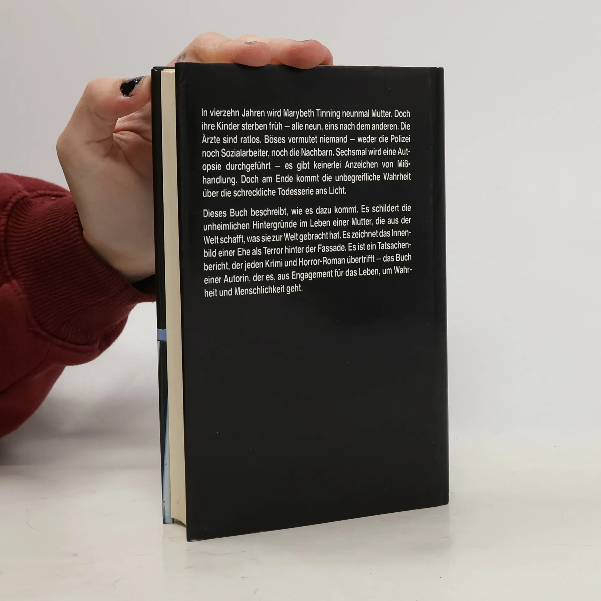 In vierzehn Jahren wird Marybeth Tinning neunmal Mutter. Doch ihre Kinder sterben früh - alle neun, eins nach dem anderen. Die Ärzte sind ratlos. Böses vermutet niemand - weder die Polizei noch Sozialarbeiter, noch die Nachbarn. Sechsmal wird eine Autopsie durchgeführt - es gibt keinerlei Anzeichen von Misshandlung. Doch am Ende kommt die unbegreifliche Wahrheit über die schreckliche Todesserie ans Licht. Dieses Buch bechreibt, wie es dazu kommt. Es schildert die unheimlichen Hintergründe im Leben einer Mutter, die aus der Welt schafft, was sie zur Welt gebracht hat. Es zeichnet das Innenbild einer Ehe als Terror hinter der Fassade.