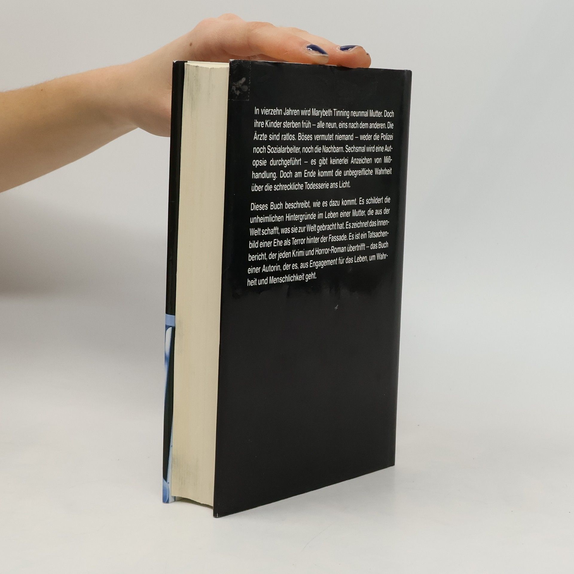 In vierzehn Jahren wird Marybeth Tinning neunmal Mutter. Doch ihre Kinder sterben früh - alle neun, eins nach dem anderen. Die Ärzte sind ratlos. Böses vermutet niemand - weder die Polizei noch Sozialarbeiter, noch die Nachbarn. Sechsmal wird eine Autopsie durchgeführt - es gibt keinerlei Anzeichen von Misshandlung. Doch am Ende kommt die unbegreifliche Wahrheit über die schreckliche Todesserie ans Licht. Dieses Buch bechreibt, wie es dazu kommt. Es schildert die unheimlichen Hintergründe im Leben einer Mutter, die aus der Welt schafft, was sie zur Welt gebracht hat. Es zeichnet das Innenbild einer Ehe als Terror hinter der Fassade.