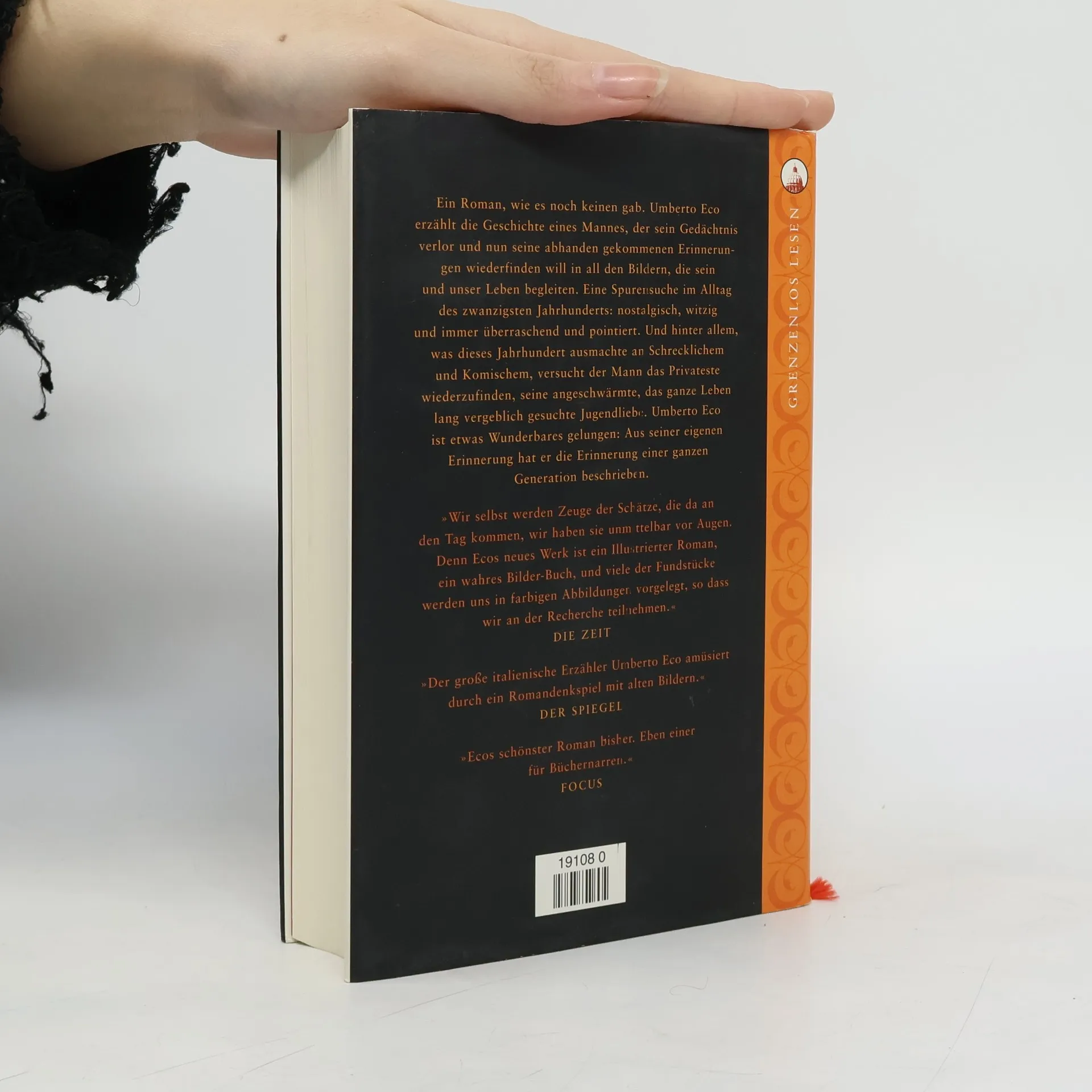 Giambattista Bodoni, Antiquar, erwacht aus dem Koma und hat einen Teil seines Gedächtnisses verloren. Auf der Suche nach seinen persönlichen Erinnerungen fährt er ins Haus seiner Kindheit und findet dort alles wieder: Bücher und Bilder, Comics und Kino, Pastadosen und Zigarettenschachteln. Was für Bodoni eine Reise der Wiederentdeckungen durch sein Leben und seine Lieben wird, gerät Eco zur Zeitreise durch das 20. Jahrhundert: witzig, nostalgisch und überraschend.