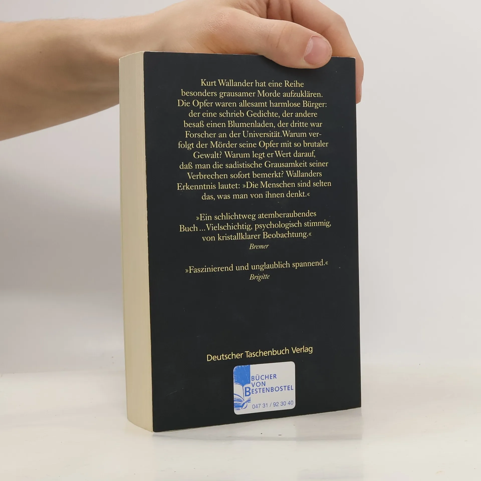 Wallander soll die brutalen Morde an fünf Männern – alles scheinbar achtbare Bürger – aufklären. Wallanders sechster Fall. Bei der Mordserie, die Kurt Wallander gerade aufzuklären hat, kann es selbst erfahrenen Polizisten kalt den Rücken hinunterlaufen: Einen alten Mann findet man in einer Pfahlgrube aufgespießt, einen anderen halbverhungert, beinahe nackt an einen Baum gebunden und erwürgt. Ein dritter wurde in einem mit Steinen beschwerten Sack in einem See ertränkt. Die Opfer scheinen auf den ersten Blick achtbare Bürger gewesen zu sein, doch stellt sich bei genaueren Nachforschungen sehr bald heraus, daß auch sie Frauen grausam mißhandelt haben. Wenn nun aber der Mord die Rache eines Opfers an Mördern und Vergewaltigern ist, muß Wallander sich beeilen, bevor das nächste, noch grausamere Verbrechen geschieht ...