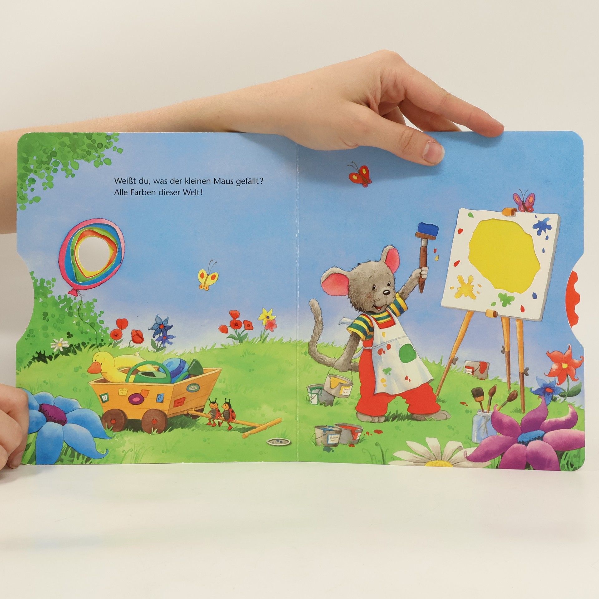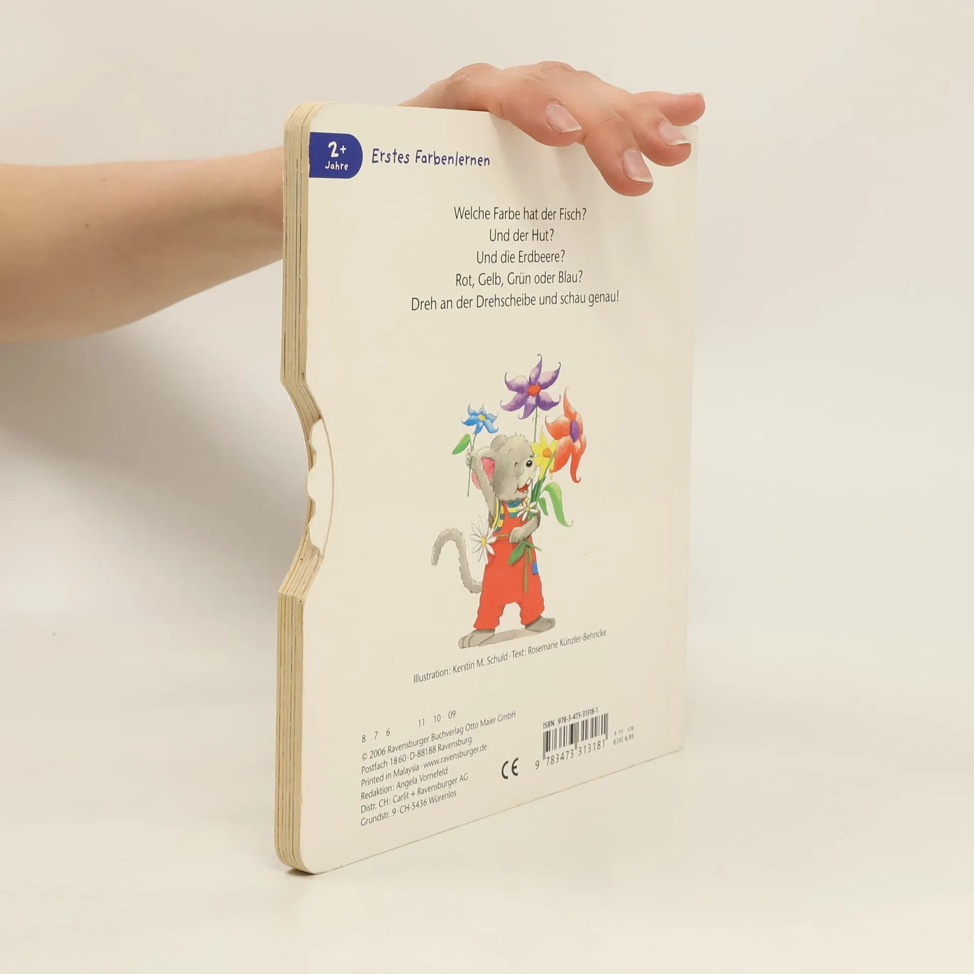 Welche Farbe hat der Fisch? Und die Erdbeere? Mit einer Drehscheibe können Kinder auf jeder Seite die richtigen Farben zuordnen.