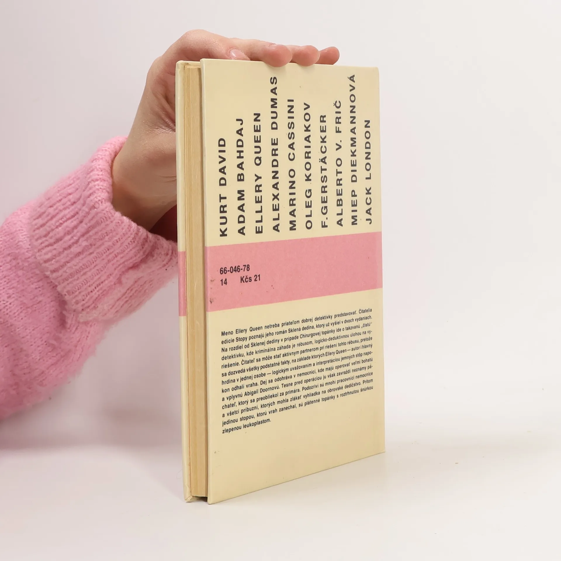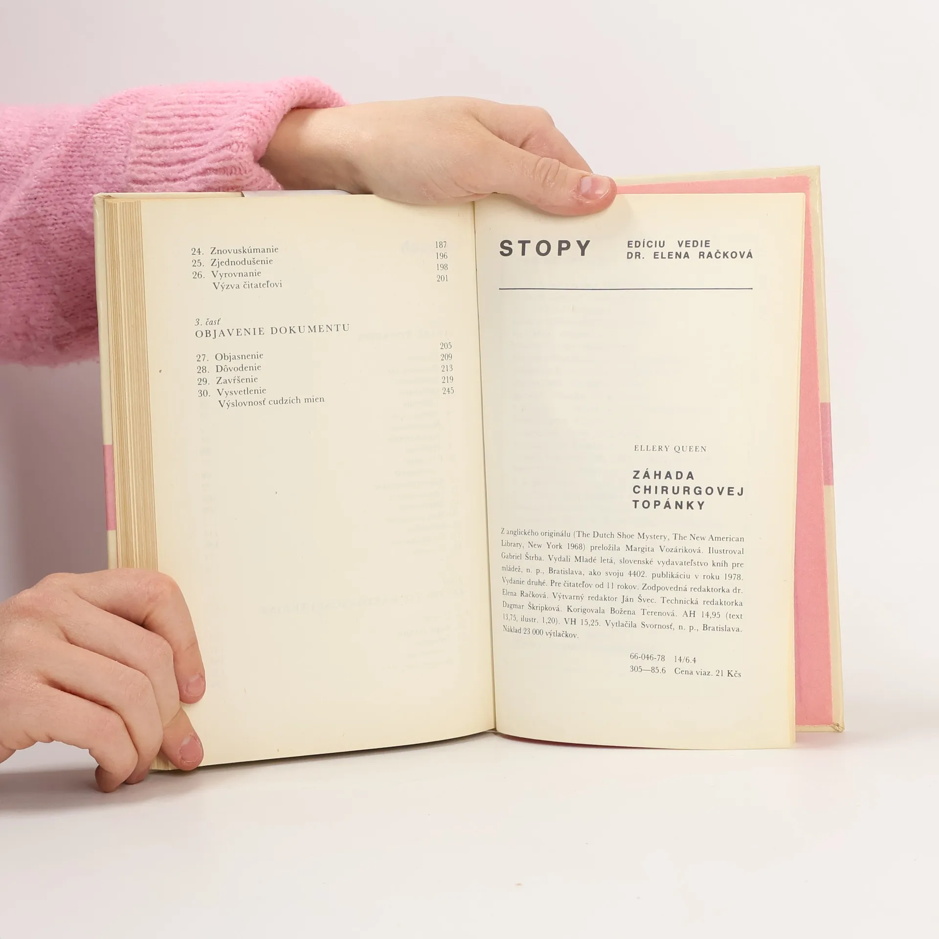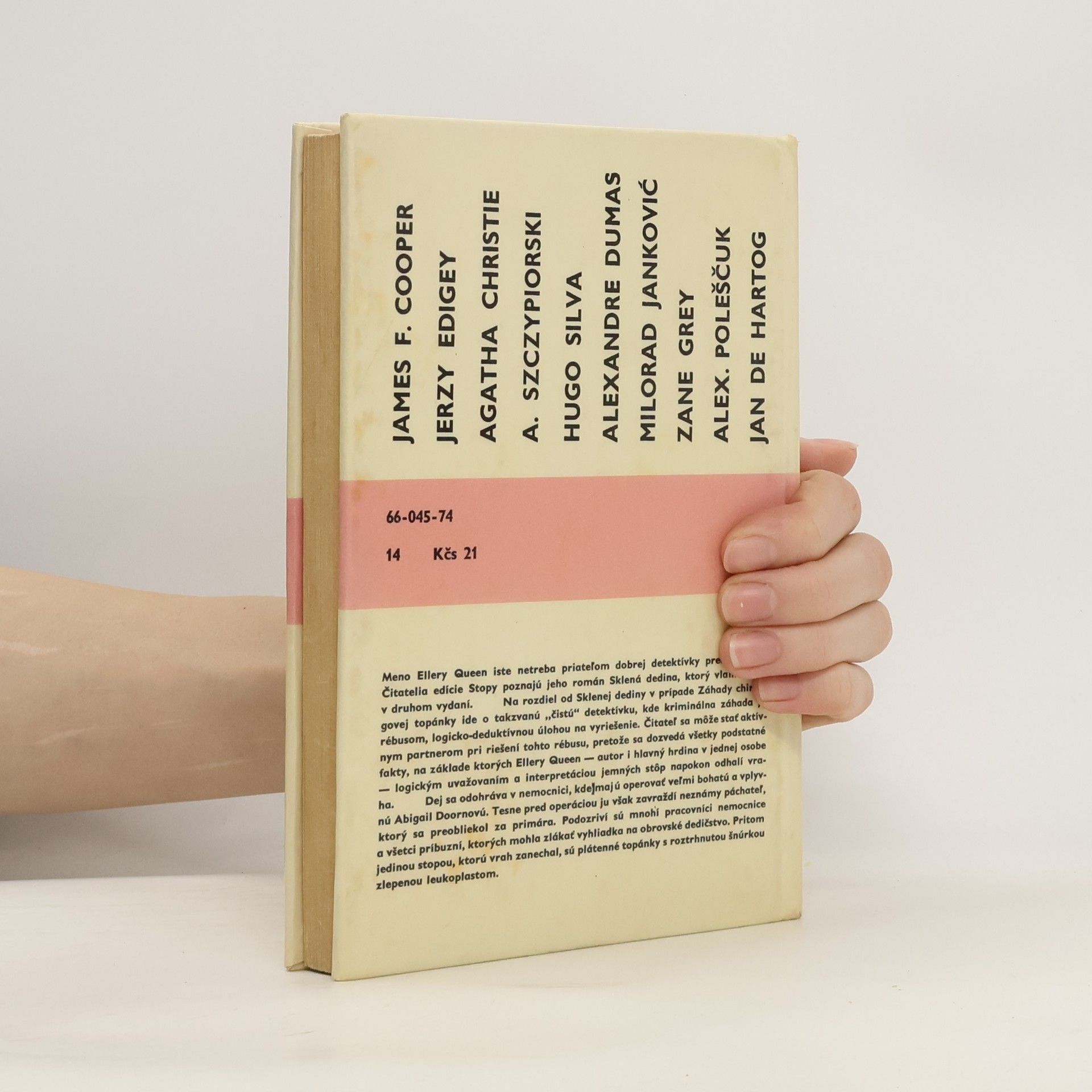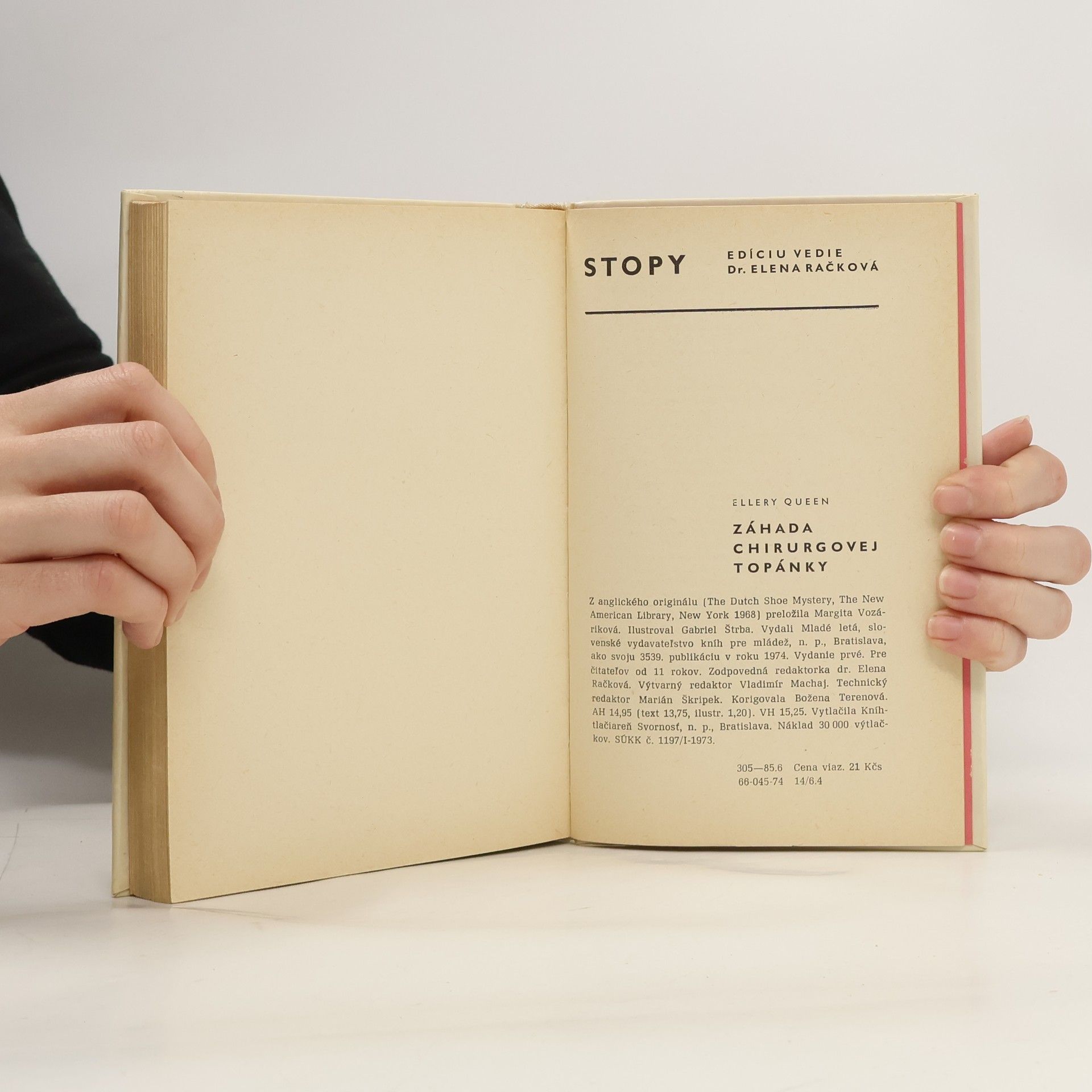 Meno Ellery Queen iste netreba priateľom dobrej detektívky predstavovať. Čitatelia edície Stopy poznajú jeho román Sklená dedina, ktorý vlani vyšiel v druhom vydaní. Na rozdiel od Sklenej dediny v prípade Záhady chirurgovej topánky ide o takzvanú „čistú“ detektivku, kde kriminálna záhada jerébusom, logicko-deduktívnou úlohou na vyriešenie. Čitateľ sa môže stať aktívnym partnerom pri riešení tohto rébusu, pretože sa dozvedá všetky podstatné fakty, na základe ktorých Ellery Queen — autor i hlavný hrdina v jednej osobe — logickým uvažovaním a interpretáciou jemných stôp napokon odhalí vraha. Dej sa odohráva v nemocnici, kde majú operovať veľmi bohatú a vplyvnú Abigail Doornovú. Tesne pred operáciou ju však zavraždí neznámy páchateľ, ktorý sa preobliekol za primára. Podozriví sú mnohí pracovníci nemocnice a všetci príbuzní, ktorých mohla zlákať vyhliadka na obrovské dedičstvo. Pritom jedinou stopou, ktorú vrah zanechal, sú plátenné topánky s roztrhnutou šnúrkou zlepenou leukoplastom.