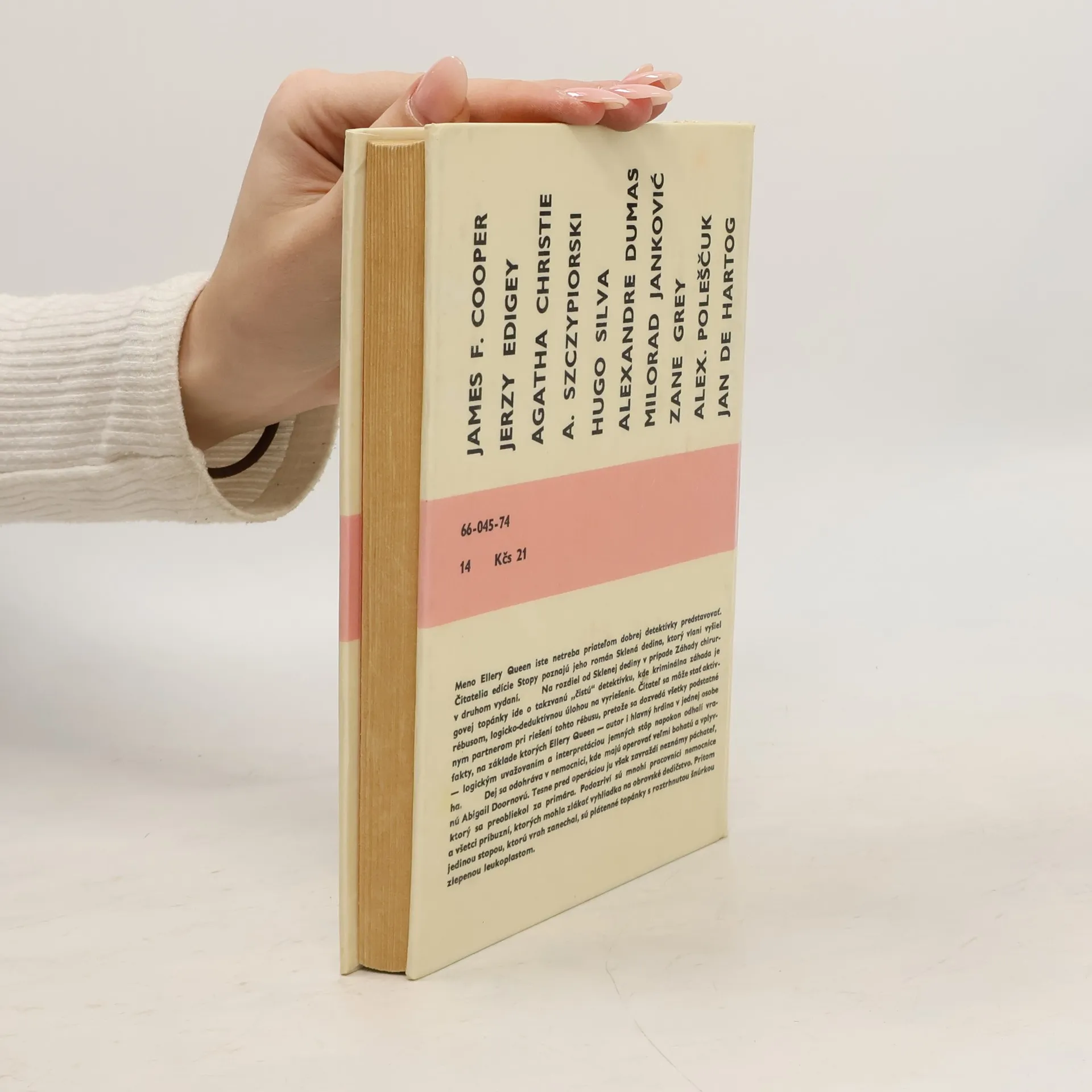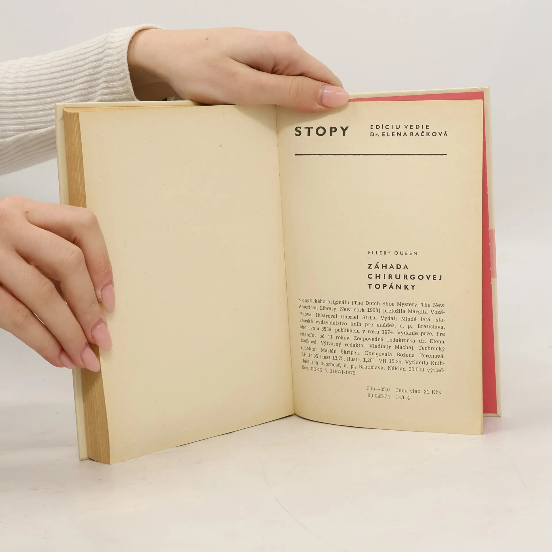 Meno Ellery Queen iste netreba priateľom dobrej detektívky predstavovať. Čitatelia edície Stopy poznajú jeho román Sklená dedina, ktorý vlani vyšiel v druhom vydaní. Na rozdiel od Sklenej dediny v prípade Záhady chirurgovej topánky ide o takzvanú „čistú“ detektivku, kde kriminálna záhada jerébusom, logicko-deduktívnou úlohou na vyriešenie. Čitateľ sa môže stať aktívnym partnerom pri riešení tohto rébusu, pretože sa dozvedá všetky podstatné fakty, na základe ktorých Ellery Queen — autor i hlavný hrdina v jednej osobe — logickým uvažovaním a interpretáciou jemných stôp napokon odhalí vraha. Dej sa odohráva v nemocnici, kde majú operovať veľmi bohatú a vplyvnú Abigail Doornovú. Tesne pred operáciou ju však zavraždí neznámy páchateľ, ktorý sa preobliekol za primára. Podozriví sú mnohí pracovníci nemocnice a všetci príbuzní, ktorých mohla zlákať vyhliadka na obrovské dedičstvo. Pritom jedinou stopou, ktorú vrah zanechal, sú plátenné topánky s roztrhnutou šnúrkou zlepenou leukoplastom.