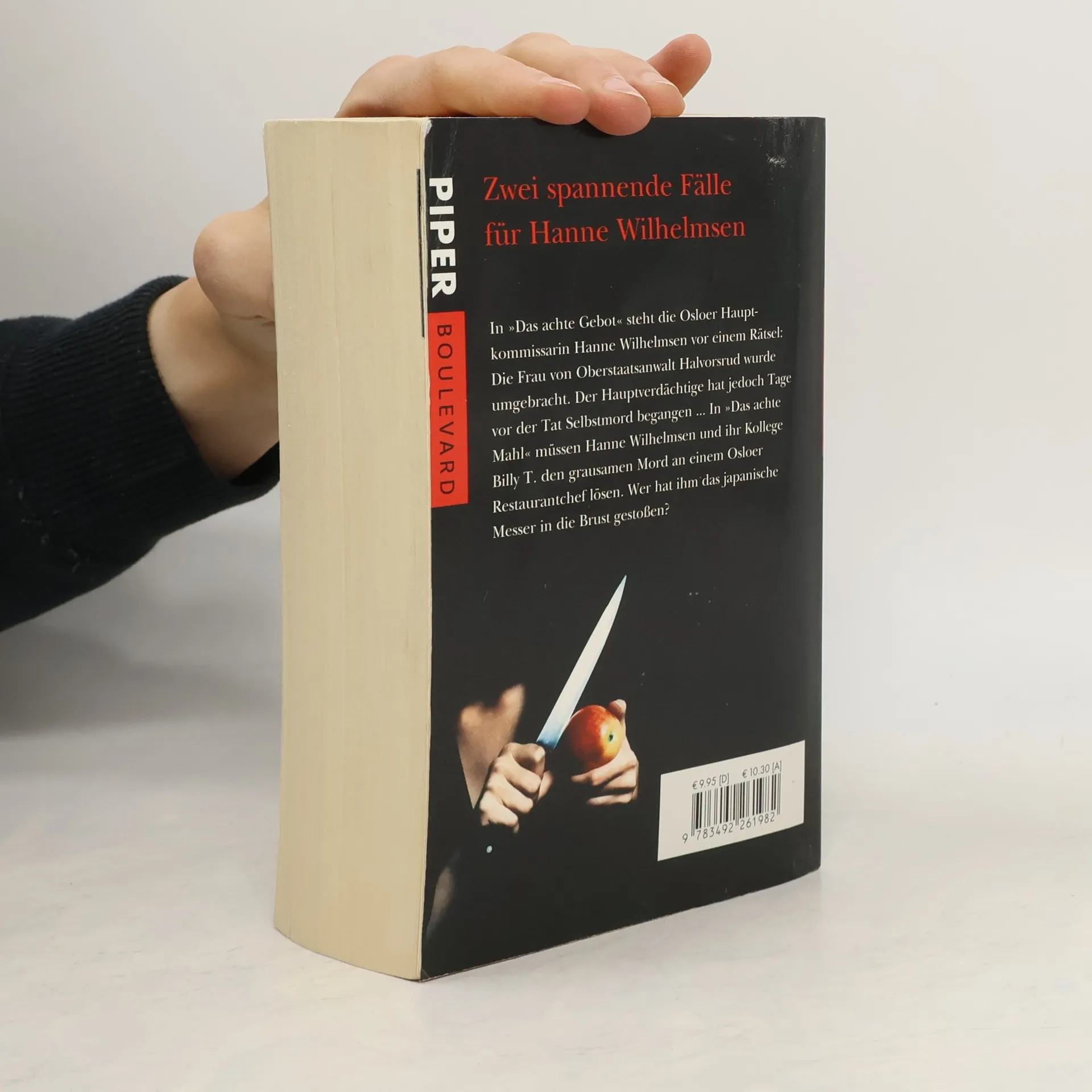 In Das achte Gebot steht die Osloer Hauptkommissarin Hanne Wilhelmsen vor einem Rätsel: Die Frau von Oberstaatsanwalt Halvorsrud wurde umgebracht. Hauptverdächtiger ist Stale Salvesen, doch der hat Tage vor der Tat Selbstmord begangen, dafür gibt es Zeugen. In Das achte Mahl müssen Hanne Wilhelmsen und ihr Kollege Billy T. den grausamen Mord an einem Osloer Restaurantchef lösen. Wer hat ihm das japanische Messer in die Brust gestoßen