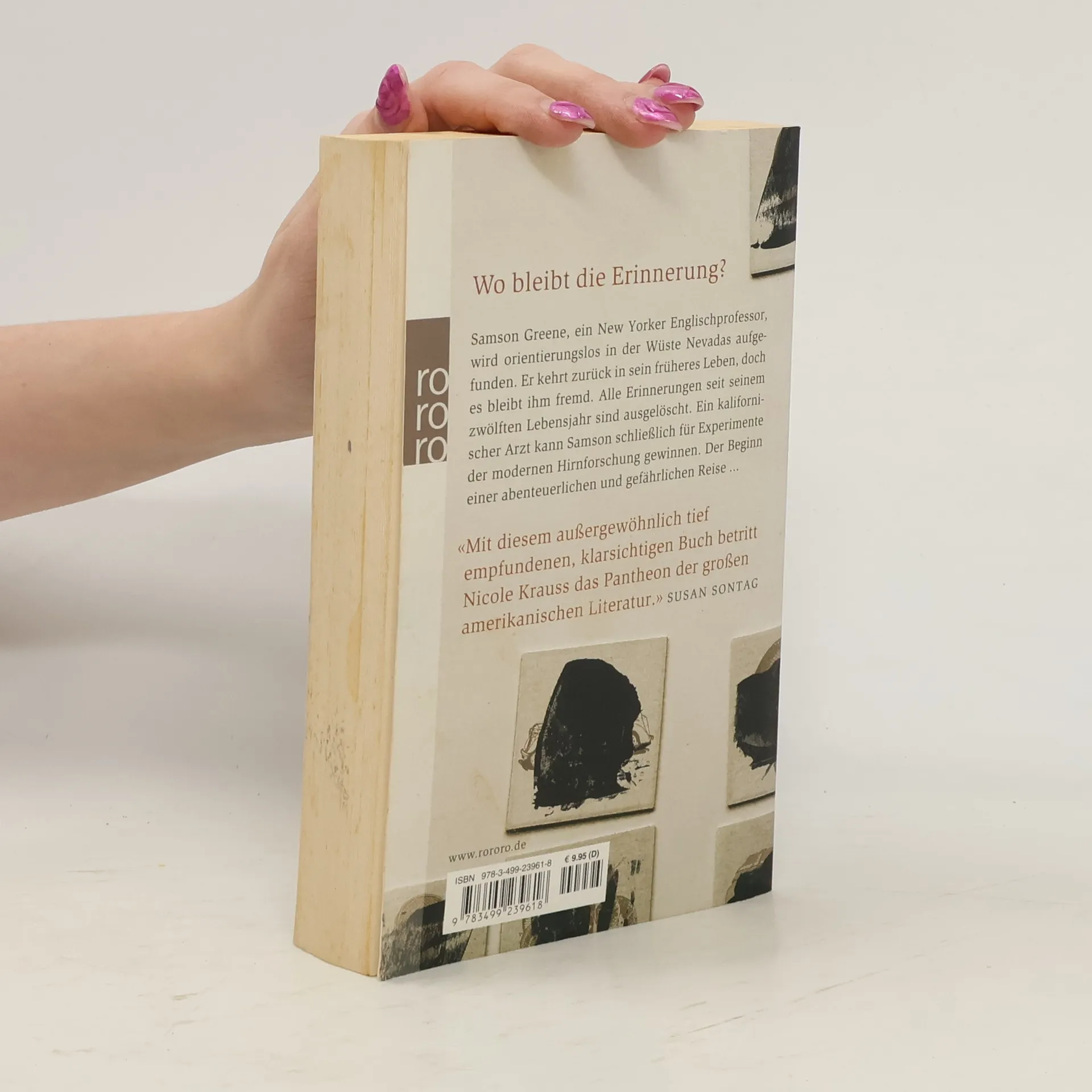 Wo bleibt die Erinnerung?Samson Greene, ein New Yorker Englischprofessor, wird orientierungslos in der Wüste Nevadas aufgefunden. Er kehrt zurück in sein früheres Leben, doch es bleibt ihm fremd. Alle Erinnerungen seit seinem zwölften Lebensjahr sind ausgelöscht. Ein kalifornischer Arzt kann Samson schließlich für Experimente der modernen Hirnforschung gewinnen. Der Beginn einer abenteuerlichen und gefährlichen Reise ...„Mit diesem außergewöhnlich tief empfundenen, klarsichtigen Buch betritt Nicole Krauss das Pantheon der großen amerikanischen Literatur.“ (Susan Sontag)