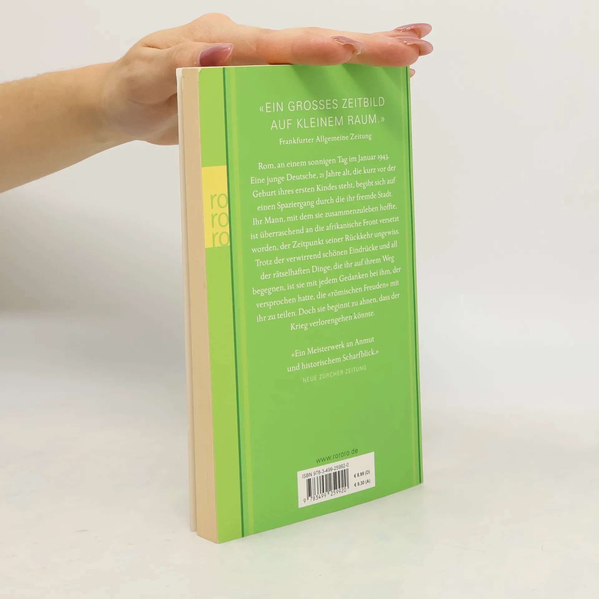 Rom, an einem sonnigen Tag im Januar 1943. Eine junge Deutsche, 21 Jahre alt, die kurz vor der Geburt ihres ersten Kindes steht, begibt sich auf einen Spaziergang durch die ihr fremde Stadt. Ihr Mann, mit dem sie zusammenzuleben hoffte, ist überraschend an die afrikanische Front versetzt worden, der Zeitpunkt seiner Rückkehr ungewiss. Trotz der verwirrend schönen Eindrücke und all der rätselhaften Dinge, die ihr auf ihrem Weg begegnen, ist sie mit jedem Gedanken bei ihm, der versprochen hatte, die «römischen Freuden» mit ihr zu teilen. Doch sie beginnt zu ahnen, dass der Krieg verloren gehen könnte.