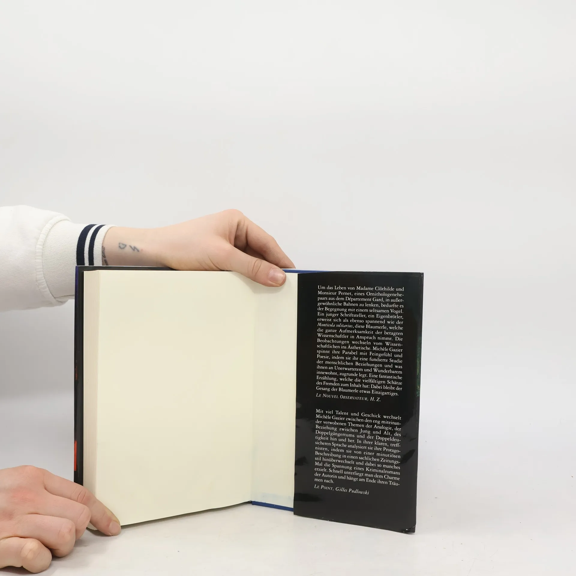 Die Blaumerle ist ein seltsamer Vogel. Ein Eigenbrötler, ein unauffälliger Wanderer diesseits und jenseits der mediterranen Küstenzonen, in deren felsige, mit zahlreichen Ruinen bestandenen Gebiete er sich gerne zurückzieht. Dennoch besitzt dieser Vogel die Gabe, mit seinem Gesang die Herzen der Menschen zu rühren und zu entzücken. Auch spröde, gefühlsarme Herzen wie die der Pernets. René und Clôthilde Pernet sind ein betagtes Ornithologenehepaar, das in der Abgeschiedenheit der Provinzstadt Uzès seinen friedlichen, sich im täglichen Einerlei erschöpfenden Ruhestand verlebt und das Studium der Blaumerle zur letzten Leidenschaft seines irdischen Daseins gemacht hat. Das unvermittelte Auftauchen des scheuen, kleinen Vogels deckt sich mit dem Erscheinen eines jungen Mannes, eines Fremden unbekannter Herkunft. Er nennt sich Alain, gibt sich als Schriftsteller aus. Er nistet sich ein, in ihrem Heim, in ihrem Leben. Im engen Kontakt mit den beiden Alten ändert er sich und zugleich sich selbst. Und so entdecken der frustrierte Professor, die autoritäre Vertreterin der „petite Bourgeoisie“ und der verführerische Unbekannte, ein jeder auf seine Weise, eine vollkommen neue und ungeahnte Fähigkeit zum Glücklichsein. In diesem Roman verleiht Michèle Gazier dem Thema der Identitätsfindung, das sie in all ihren bisherigen Werken behandelt hat, eine neue Dimension. Hier sind die Grenzen verinnerlicht, die Zugehörigkeiten vom Herzen bestimmt. Die Last alles Vergangenen weicht dem Zauber der Träume, die Wahrheit verblasst vor den magischen Kräften einer sich ständig entziehenden Wirklichkeit.