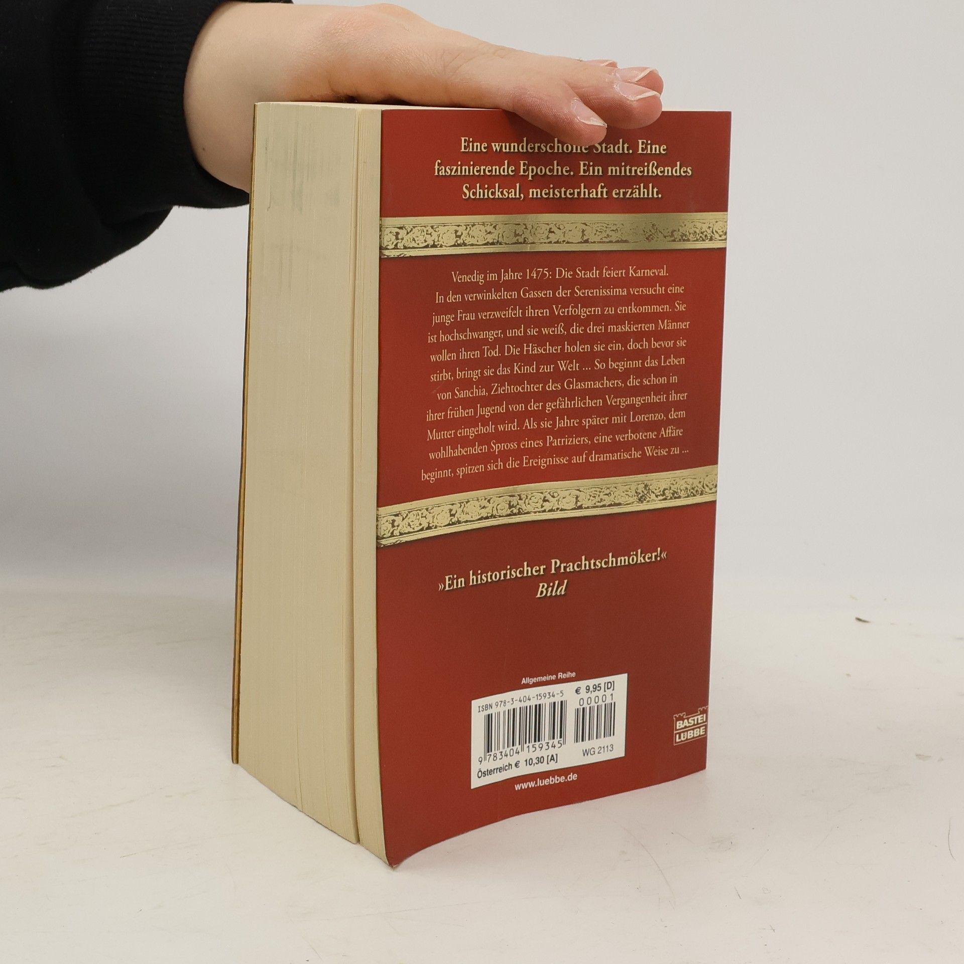 Venedig im Jahre 1475: Die Stadt feiert Karneval. In den verwinkelten Gassen der Serenissima versucht eine junge Frau verzweifelt, ihren Verfolgern zu entkommen. Sie ist hochschwanger, und sie weiß, die drei maskierten Männer wollen ihren Tod. Die Häscher holen sie ein, doch bevor sie stirbt, bringt sie das Kind zur Welt ... So beginnt das Leben von Sanchia, Ziehtochter des Glasmachers, die schon in ihrer frühen Jugend von der gefährlichen Vergangenheit ihrer Mutter eingeholt wird. Als sie Jahre später mit Lorenzo, dem wohlhabenden Spross eines Patriziers, eine verbotene Affäre beginnt, spitzen sich die Ereignisse auf dramatische Weise zu ... Ein prächtiger historischer Bilderbogen voller Abenteuer, Intrigen und Leidenschaft – ausgebreitet vor der einzigartigen Kulisse Venedigs