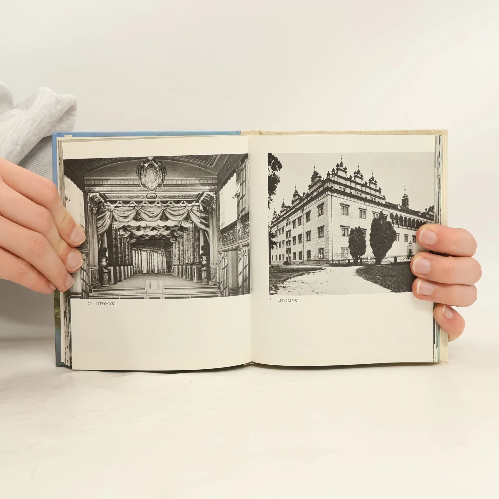Černobílé a barevné fotografie hradů a zámků.