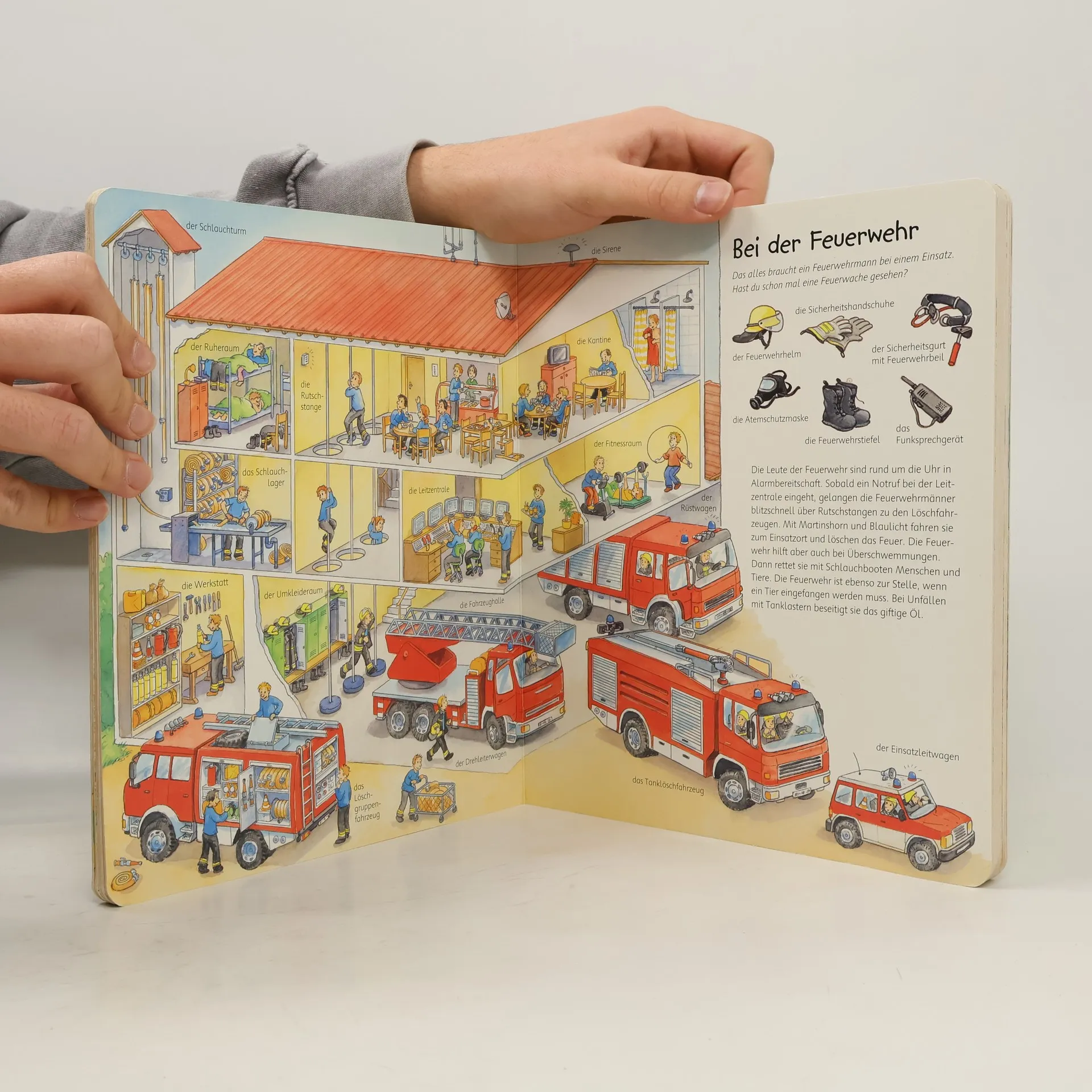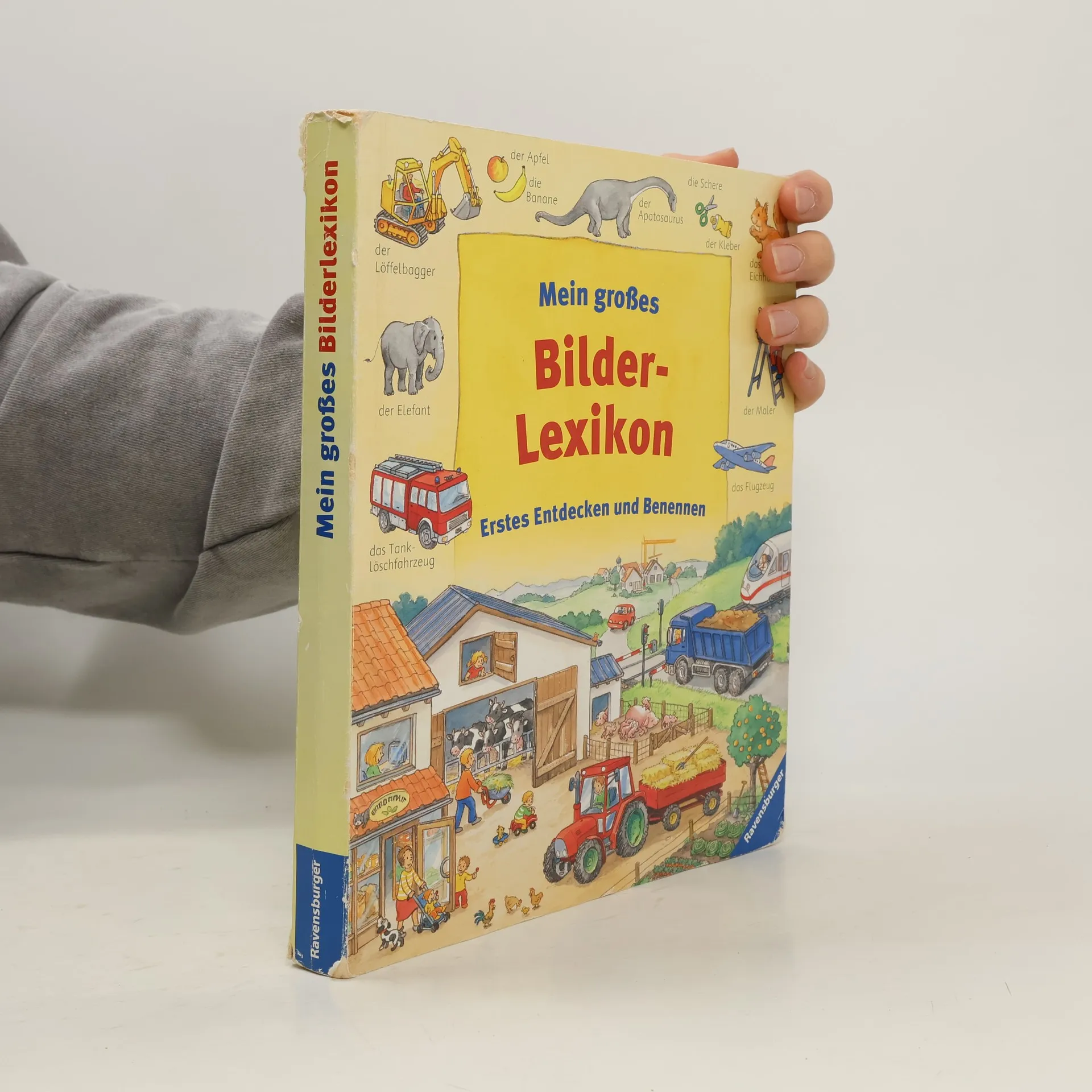 "Mein großes Bilderlexikon" zeigt auf 17 Doppelseiten detailgetreue Illustrationen zu allen Sachthemen, die kleine Kinder interessieren (u. a. Kindergarten, Baustelle, Feuerwehr, Polizei, Einkaufen). Ein kurzer Text führt jeweils in das Thema ein.