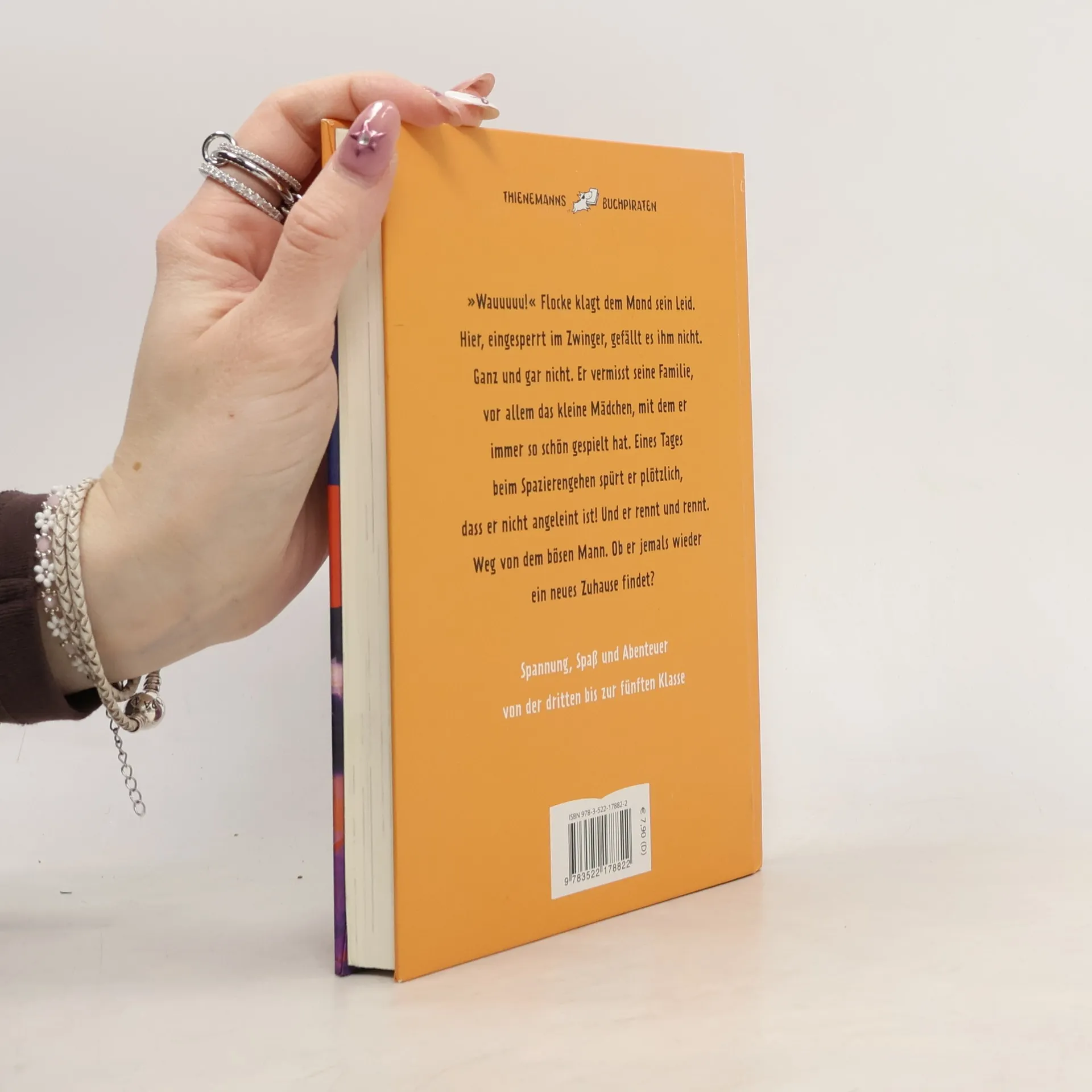 Aus dem Leben eines Hundes. „Wauuuuu!“ Flocke klagt dem Mond sein Leid. Hier, eingesperrt im Zwinger, gefällt es ihm nicht. Ganz und gar nicht. Er vermisst seine Familie, vor allem das kleine Mädchen, mit dem er immer so schön gespielt hat. Eines Tages beim Spazierengehen spürt er plötzlich, dass er nicht angeleint ist! Und er rennt und rennt. Weg von dem bösen Mann. Ob er jemals wieder ein neues Zuhause findet? Reihe „Thienemanns Buchpiraten“ - Spannung, Spaß und Abenteuer von der dritten bis zur fünften Klasse