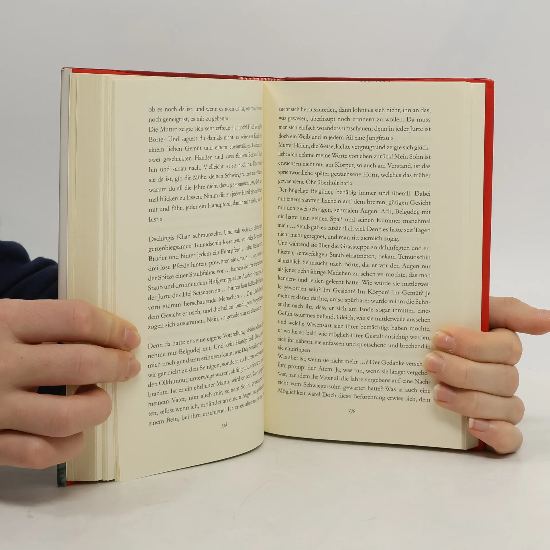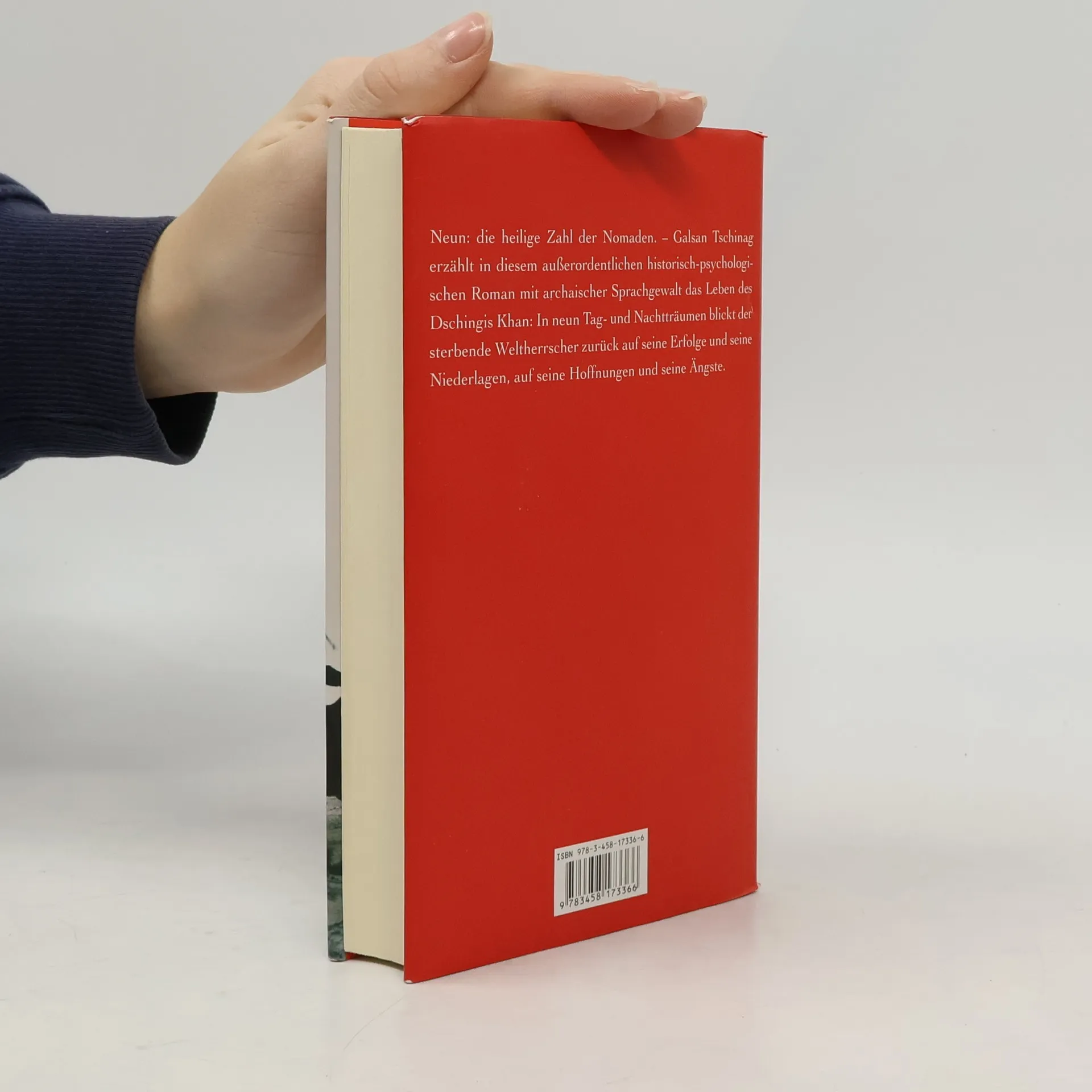 Neun: die heilige Zahl der Nomaden. – Galsan Tschinag erzählt in diesem außerordentlichen historisch-psychologischen Roman mit archaischer Sprachgewalt das Leben des Dschingis Khan: In neun Tag- und Nachtträumen blickt der sterbende Weltherrscher zurück auf seine Erfolge und seine Niederlagen, auf seine Hoffnungen und seine Ängste. Längst ist Dschingis Khan ein Mythos geworden, in der Mongolei wird der »ozeangleiche Khan« noch heute fast als Gott verehrt. Er starb im Jahr 1227, nicht durch Feindeshand, sondern – für einen Reiterfürsten schmachvoll – nach einem Sturz vom Pferd. Er, den seine Diener noch zur letzten Schlacht tragen, versinkt in Fieberträumen von Krieg, Verrat und Mord – Bilder, in tiefes Rot getaucht. Sein Blick geht nach innen, denn »auch die tausendjährige Eiche hat eines Tages mit dem end- und sinnlosen Weiterwuchern in die Ungewißheit aufzuhören«. Erinnerungen an seine Kindheit werden wach, an seine Getreuen, an seine Frauen und an die Liebe, die er empfunden hat: ein Weltenbeherrscher am Ende seines Lebens, getrieben von Halluzinationen, bekenntnisbereit, aber nicht sentimental, unerbittlich auch gegen sich selbst: »Jeder Tropfen Blut, geflossen über den Rand der Kelle, jede Handvoll Asche, geflogen über den Rand der Schaufel, jeder Armvoll Fleisch und Knochen, gerutscht über den Rand des Troges – jedes anderen zugefügte Leid mußte auf meinem Weg gelegen und auf die Stunde der Vergeltung gewartet haben ...«