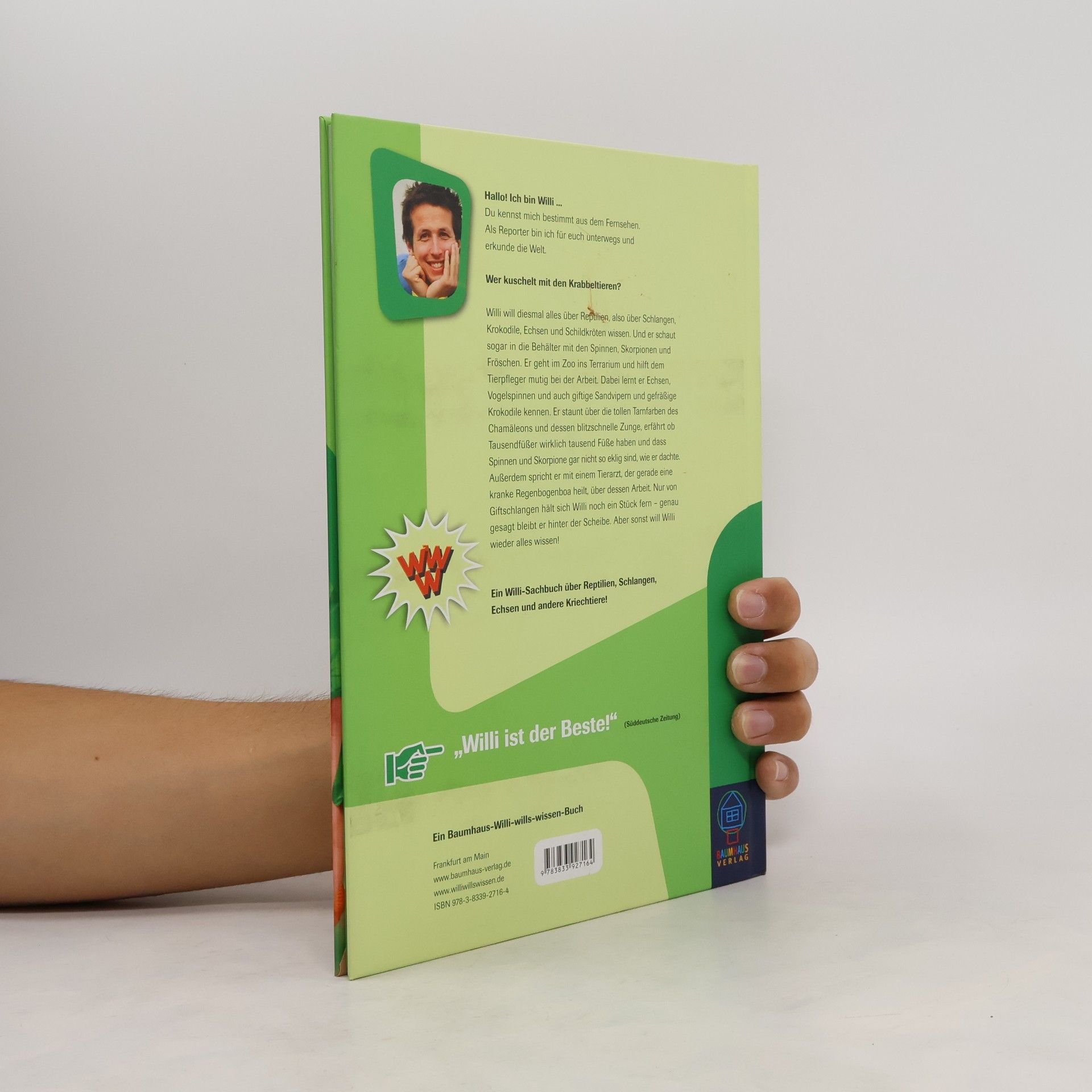 Willi will diesmal alles über Reptilien und Spinnentiere herausfinden und besucht ein Schlangen-Terrarium. Mutig hilft er Tierpfleger Christian bei der Arbeit und muss unvermutet eine 3,20 Meter lange Würgeschlange umquartieren. Neben den Schlangen lernt Willi auch Tannenzapfenechsen, Chamäleons, eine giftige Sandviper und gefräßige Nilkrokodile und Vogelspinnen kennen. Außerdem verabredet sich der Reporter im Institut für Zoologie der Ludwig- Maximilians-Universität in München bei Tierarzt Dr. Markus Baur. Der untersucht gerade eine Regenbogenboa, die Kreislauf- und Häutungsprobleme hatte. Nach einer Blutabnahme und einer Milbenbehandlung darf die Schlange wieder nach Hause. In der Reptilien-Auffangstation sieht Willi Kaimane und eine riesige Geierschildkröte und eine Gabunviper mit zwei tödlichen Giftzähnen. Und dann darf Willi noch bei einer Operation dabei sein. Eine Schildechse hat ein Lege-problem. Ihr viel zu großes Ei muss ihr aus dem Bauch herausgenommen werden. Ein Willi-Sachbuch über Reptilien, Schlangen, Echsen und andere Kriechtiere.