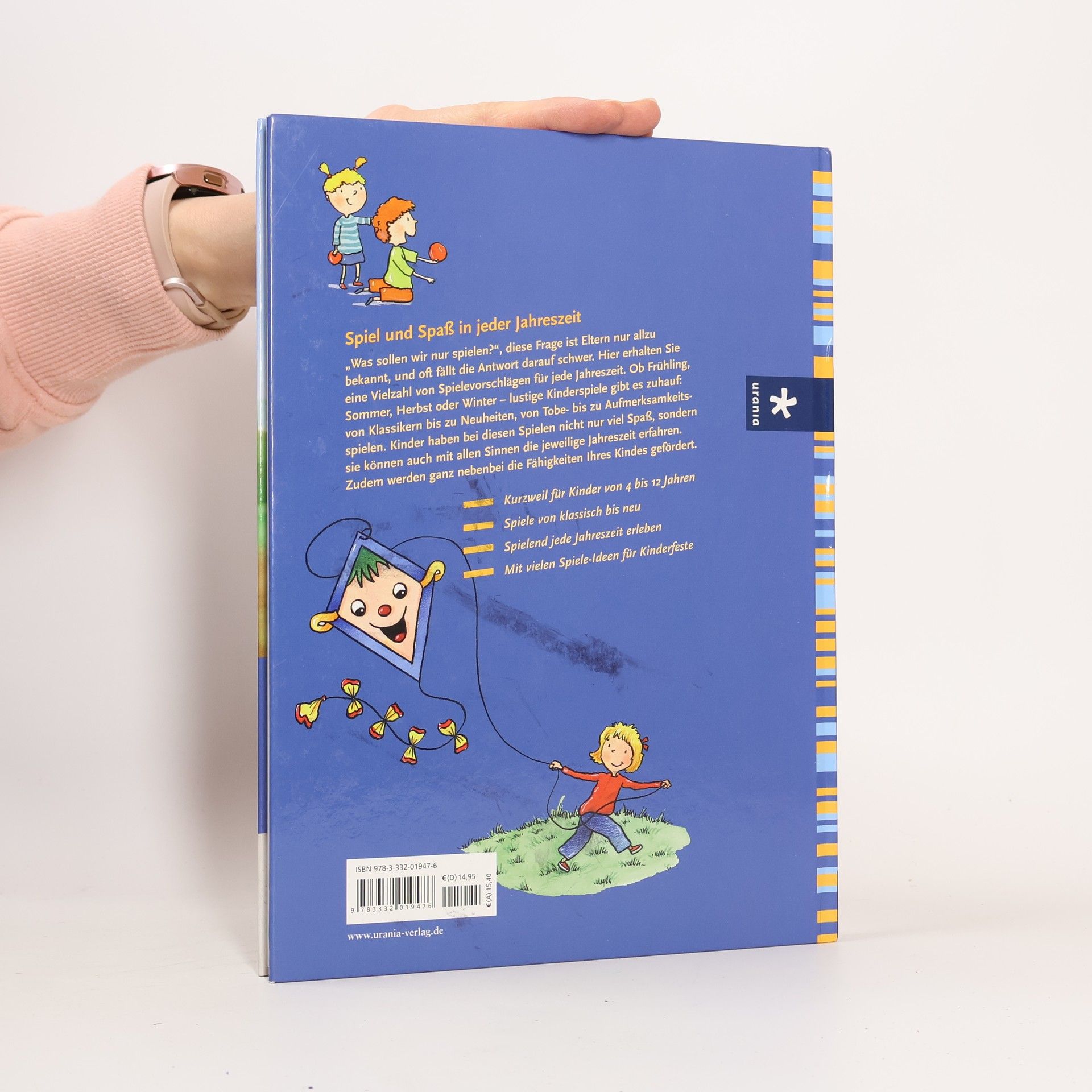 Wer der Meinung war, dass sich Kinder nur im Sommer beim Spielen austoben können, der wird mit diesem liebevoll illustrierten Buch eines besseren belehrt. Es beinhaltet alte bekannte und neue spannende Spiele für jede Jahreszeit, damit Ihr Kind egal ob bei Sonnenschein, Regen, Wind oder Schnee immer ein passendes Spiel findet. Die einzelnen Spiele richten sich ganz nach den Bedürfnissen der Kinder im Alter von 4 bis 12 Jahren und sind nicht nur Spiele für Kinder mit Kindern, sondern auch für Kinder mit Eltern, falls gerade kein anderes Kind zum Spielen da ist. Zudem steht bei jedem Spiel, welche Fähigkeiten beim Kind gefördert werden. Das Buch ist unterteilt in verschieden Spielearten wie Tobespiele, ruhige Spiele usw. und enthält zudem Specials über Spiele bei Festen in den einzelnen Jahreszeiten.