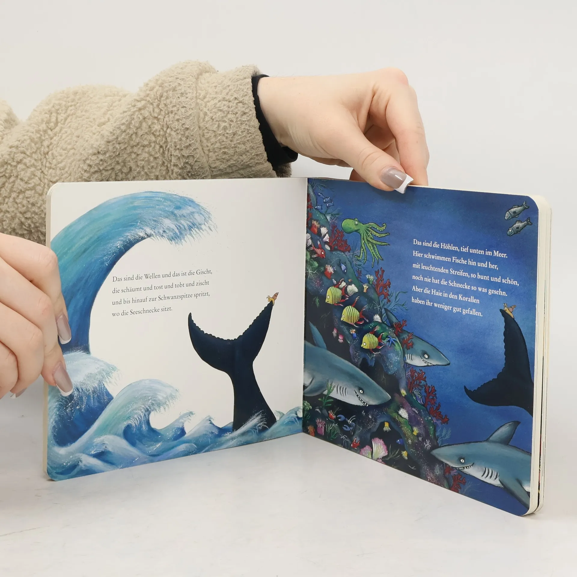 Die abenteuerliche Reise der kleinen Schnecke und des Wals, der ihr die Wunder dieser Welt zeigt. Doch, wie man weiß, steckt die Welt auch voller Gefahren, und da ist es nur gut, wenn man einen Freund hat, der einen in höchster Not rettet - auch wenn der so klein ist wie eine Seeschnecke. »Hier vereinen sie die Themen Freundschaft, Fernweh, Gefahr und Rettung in einer zauberhaften Geschichte, wie immer genial gereimt von Donaldson und grandios gezeichnet von Scheffler.« Brigitte
