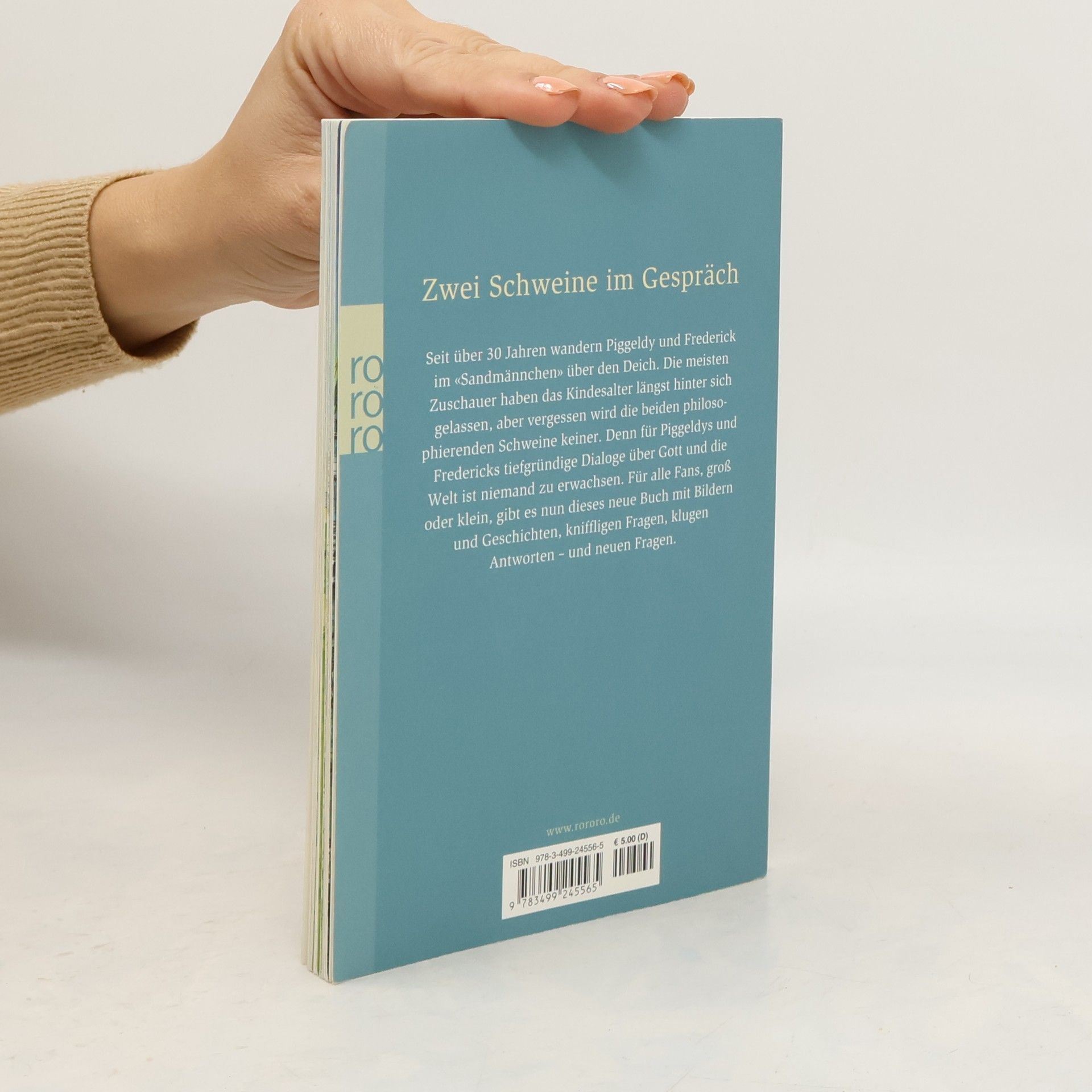 Zwei Schweine im Gespräch Seit über 30 Jahren wandern Piggeldy und Frederick im „Sandmännchen“ über den Deich. Die meisten Zuschauer haben das Kindesalter längst hinter sich gelassen, aber vergessen wird die beiden philosophierenden Schweine keiner. Denn für Piggeldys und Fredericks tiefgründige Dialoge über Gott und die Welt ist niemand zu erwachsen. Für alle Fans, groß oder klein, gibt es nun dieses neue Buch mit Bildern und Geschichten, kniffligen Fragen, klugen Antworten – und neuen Fragen.