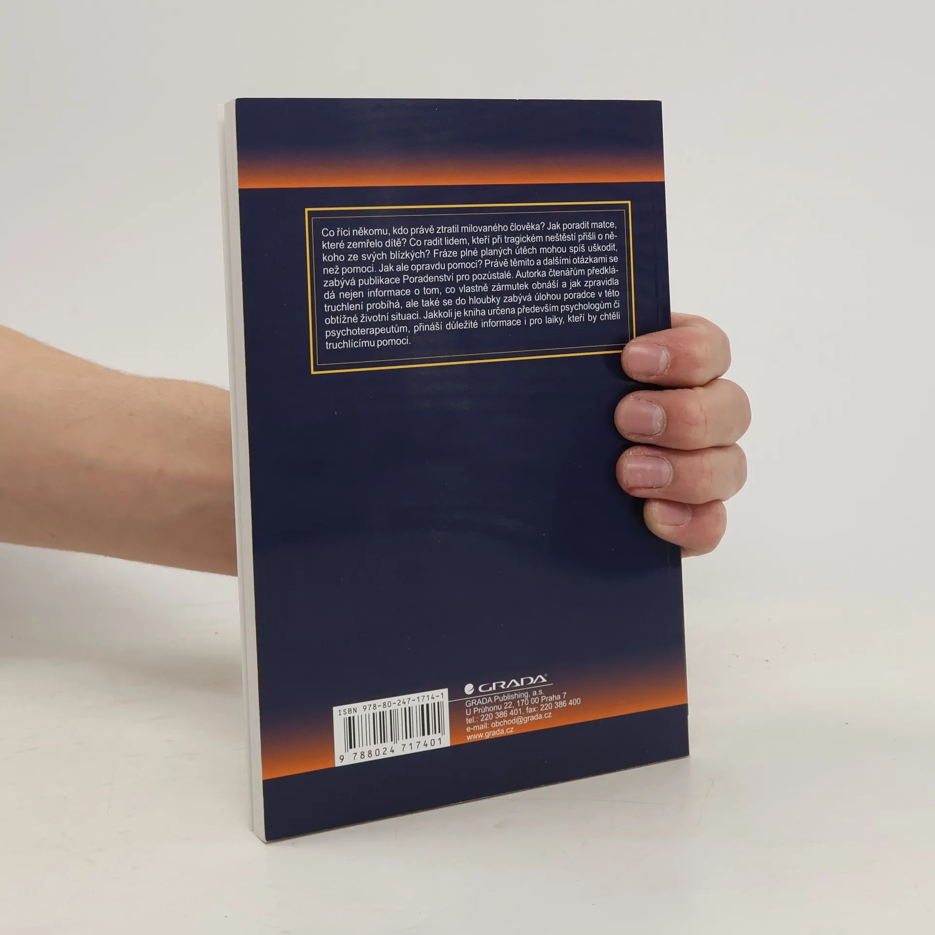 Co říci někomu, kdo právě ztratil milovaného člověka? Jak poradit matce, které zemřelo dítě? Co radit lidem, kteří při tragickém neštěstí přišli o někoho ze svých blízkých? Fráze plné planých útěch mohou spíš uškodit, než pomoci. Jak ale opravdu pomoci? Právě těmito a dalšími otázkami se zabývá publikace Poradenství pro pozůstalé Autorka čtenářům předkládá nejen informace o tom, co vlastně zármutek obnáší a jak zpravidla truchlení probíhá, ale také se do hloubky zabývá úlohou poradce v této obtížné životní situaci. Jakkoli je kniha určena především psychologům či psychoterapeutům, přináší důležité informace i pro laiky, kteří by chtěli truchlícímu pomoci.