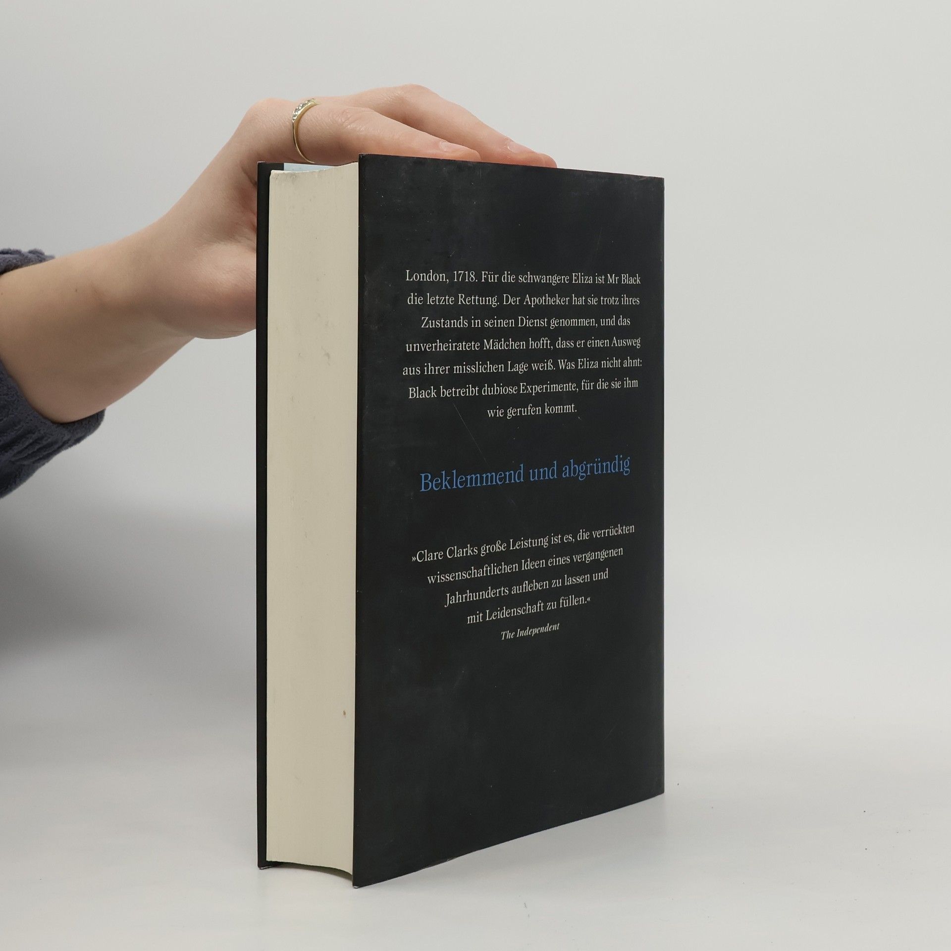 'Clare Clark beschwört die Atmosphäre einer anderen Zeit und kreiert Figuren, die ausgesprochen modern wirken.' The Guardian Beklemmend und abgründig – wie in ihrem Roman Der Vermesser erweist sich Clare Clark als Meisterin historischer Spannung. London, 1718. Als die unverheiratete, schwangere Eliza die Stadt erreicht, ist sie verzweifelt. Sie setzt alle Hoffnung auf Apotheker Black, der sie großmütig in seinen Dienst nimmt. Doch Black betreibt unheimliche Studien. Was geht in dem Haus vor sich, und welche Rolle soll Eliza dabei spielen? Eliza lebt mit ihrer Mutter, einer Kräuterheilerin, auf einem Dorf im ländlichen England. Dort würde ihre Schwangerschaft sofort einen Skandal heraufbeschwören. Deshalb wird sie von ihrer Mutter nach London geschickt, wo ein Apotheker namens Black sie als Hausmädchen aufnimmt. Eliza erhofft sich von Black eine Lösung für ihr 'kleines Problem'. Sie ahnt nicht, dass der geheimnisvolle, stets mit einem Schleier verhüllte Hausherr ganz andere Pläne mit ihr hat. Eliza kommt ihm sehr gelegen für seine Experimente, die ihm, so hofft er, endlich Anerkennung als Wissenschaftler verschaffen. Als Eliza schließlich erkennt, welches Geheimnis der Apotheker wirklich hütet, ist es für sie schon fast zu spät.