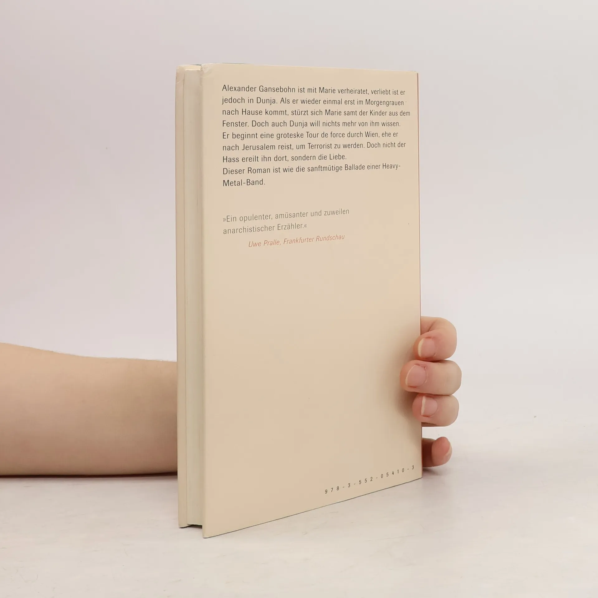 Alexander Gansebohn ist mit Marie verheiratet, verliebt ist er jedoch in Dunja. Als er wieder einmal erst im Morgengrauen nach Hause kommt, stürzt sich Marie samt der Kinder aus dem Fenster. Auch Dunja will nichts mehr von ihm wissen. Er beginnt eine groteske Tour de force, die Alexander zuerst durch Wien führt, ehe er nach Jerusalem reist, um Terrorist zu werden. Doch nicht der Hass ereilt ihn dort, sondern die Liebe. Leidenschaftlich fabuliert Franzobel von der großen Liebe, diesem fragwürdig gewordenen, doch unersetzbaren Konzept des Abendlandes. Ein Roman wie die sanftmütige Ballade einer Heavy-Metal-Band.