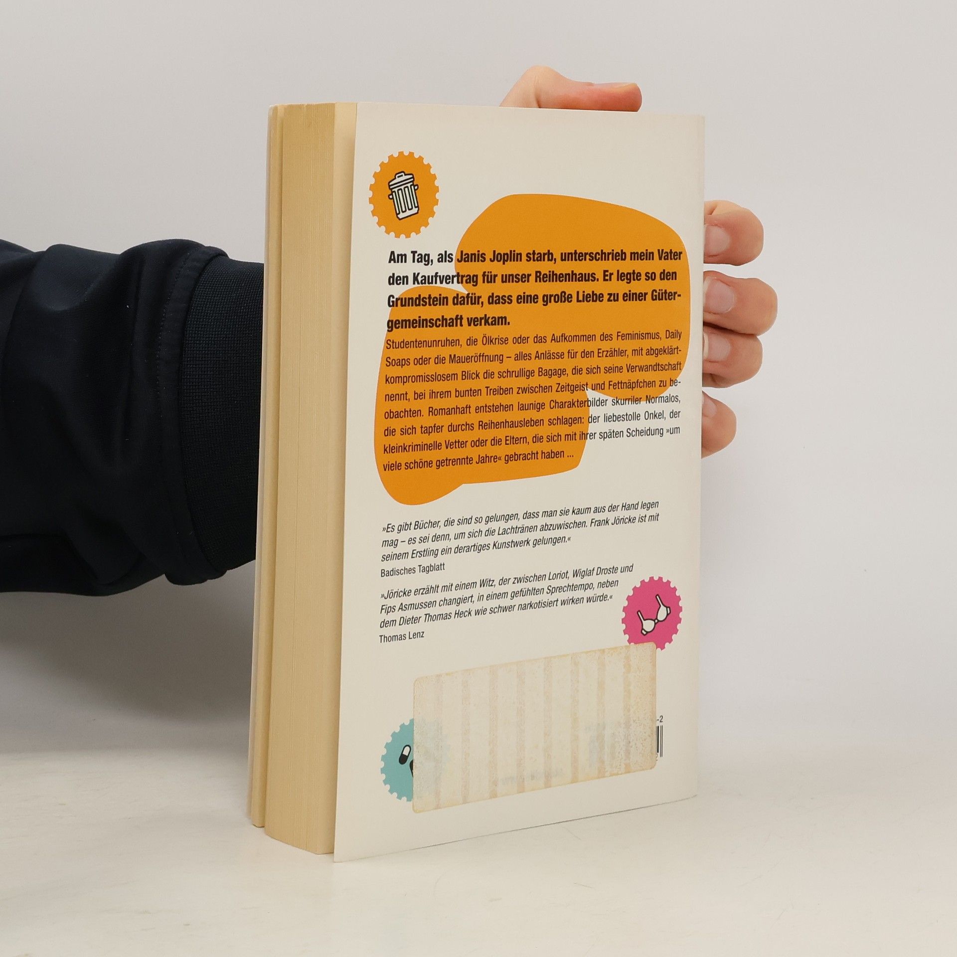 „Am Tag, als Janis Joplin starb, unterschrieb mein Vater den Kaufvertrag für unser Reihenhaus. Er legte so den Grundstein dafür, dass eine große Liebe zu einer Gütergemeinschaft verkam.“ Frank Jöricke präsentiert romanhaft eine witzige Zeitreise durch die verschiedenen Dekaden der jüngeren bundesrepublikanischen Geschichte. Wie sich die schräge Verwandschaft des Protagonisten durchs Leben schlägt, spiegelt die Einflüsse der jeweiligen gesellschaftlichen Ereignisse und Entwicklungen auf äußerst kurzweilige Weise. Seien es die Studentenunruhen, die Ölkrise oder das Aufkommen des Feminismus, Daily Soaps oder die Maueröffnung, alles Anlässe für den Erzähler, mit abgeklärt-kompromisslosem Blick die schrullige Bagage, die sich Verwandschaft nennt, bei ihrem bunten Treiben zwischen Zeitgeist und Fettnäpfchen zu beobachten. Es entstehen typische Charakterbilder skurriler Normalos, die sich tapfer durchs Reihenhausleben schlagen: Onkel, Tante, die Eltern, die sich mit ihrer späten Scheidung „um viele schöne getrennte Jahre“ gebracht haben.