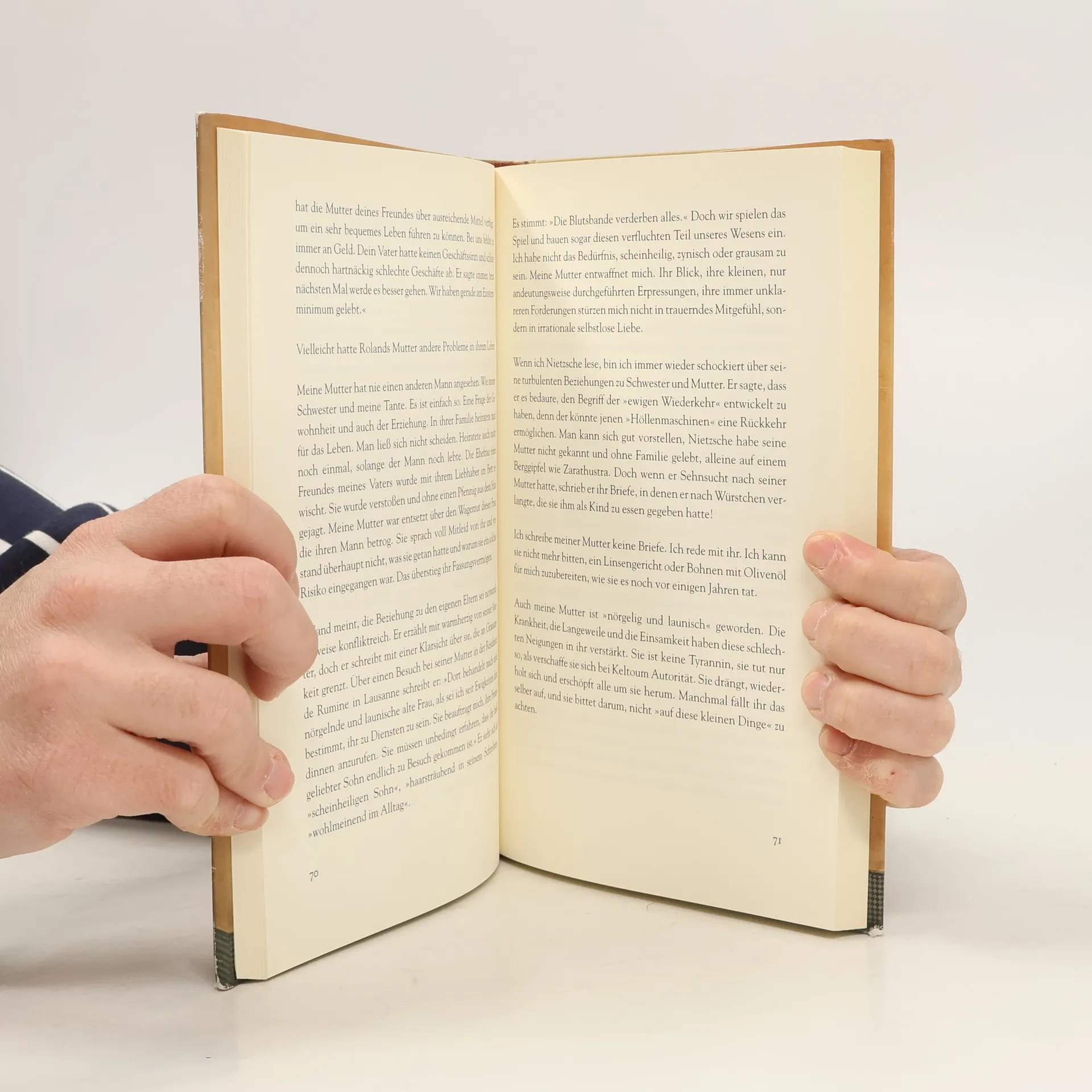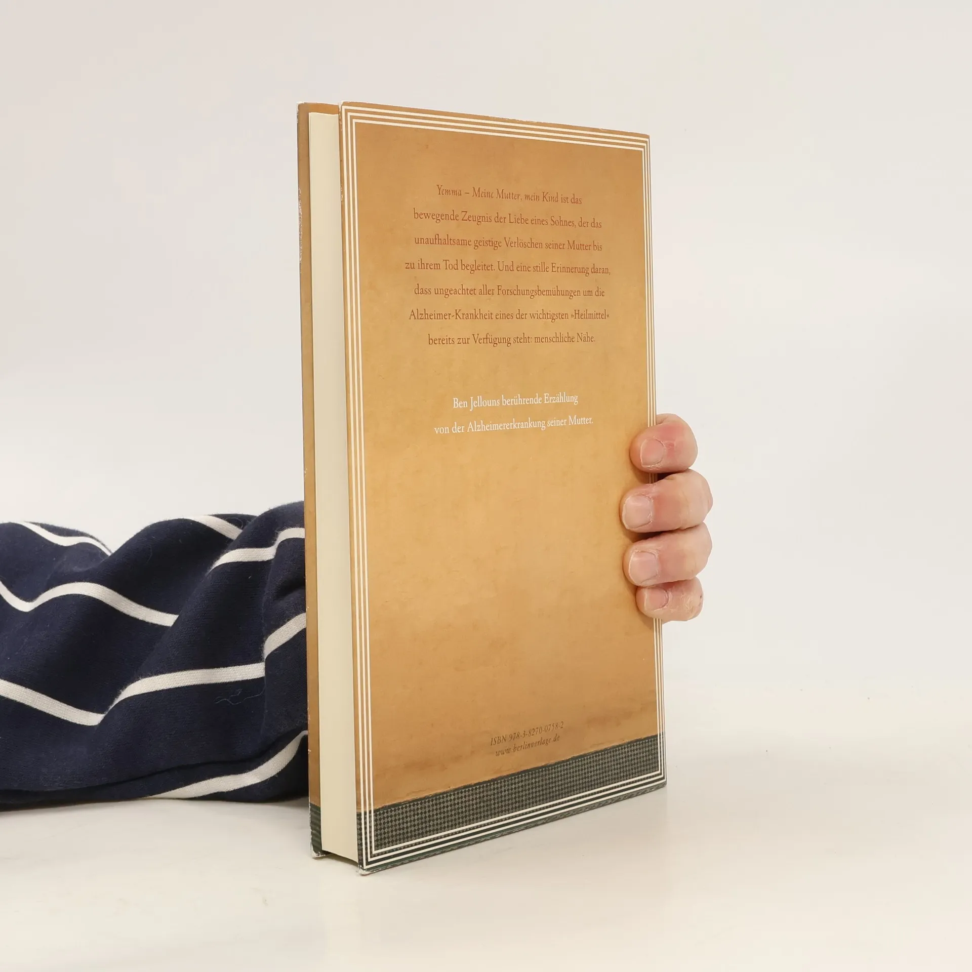 „Ich habe meiner Mutter zu essen gegeben. Meiner Mutter, meinem Kind. Einen Löffel Milch mit Käse. Wie einem Kind, das mit geschlossenen Augen isst, und meine Hand zittert vor Rührung.“ Der hier seine an Alzheimer erkrankte Mutter füttert, ist Tahar Ben Jelloun. Und das Kind ist Lalla Fatma, seine alte Mutter, die mit einer Pflegerin zurückgezogen in ihrem Haus in Tanger lebt. Mal verwechslet sie ihn mit ihrem vor dreißig Jahren gestorbenen jüngeren Bruder. Dann mit ihrem ältesten Sohn Mustafa aus ihrer ersten Ehe mit fünfzehn. Oder sie sieht in ihm nur den kleinen kranken Tahar, den sie in Fès hätschelte. Oder beklagt sich, dass er sie seit seiner (!) Beerdigung nicht besucht hat. Dazwischen Momente von großer Klarsichtigkeit: Von ihrem Bett aus erinnert sie sich an ihre Jugend, ihre Ehen, die Hochzeitsfeste, die Vorbereitungen im Hamman. Eines Morgens bestellt sie Handwerker, die ihr Haus für die Beerdigung schmücken sollen. Dann wieder lacht sie und schminkt sich für ihre drei (verstorbenen) Ehemänner, die sie zum Essen erwartet. Lalla Fatma bevölkert ihr Haus mit Fantomen, Erinnerungen und Halluzinationen. Doch eines Tages bleiben auch die aus. Sie redet nur noch mit sich, singt leise vor sich hin, sagt nichts mehr. Ihr Blick ist leer. Und der Sohn hält ihre Hand, erzählt ihr von seiner Kindheit mit ihr, ihrer Schönheit als junger Mutter - bis auch diese Hautberührung zuviel ist, ihr unerträgliche Schmerzen bereitet.