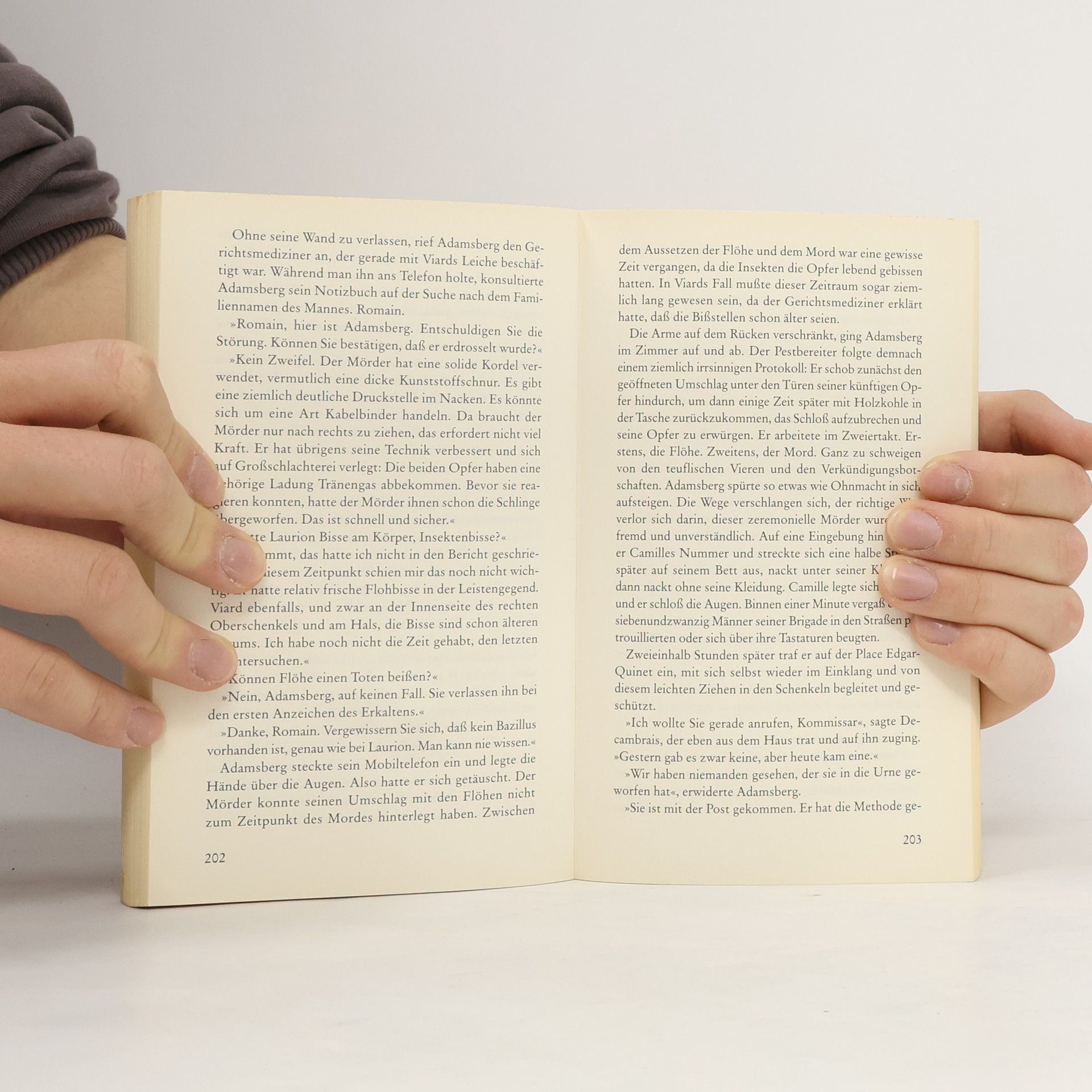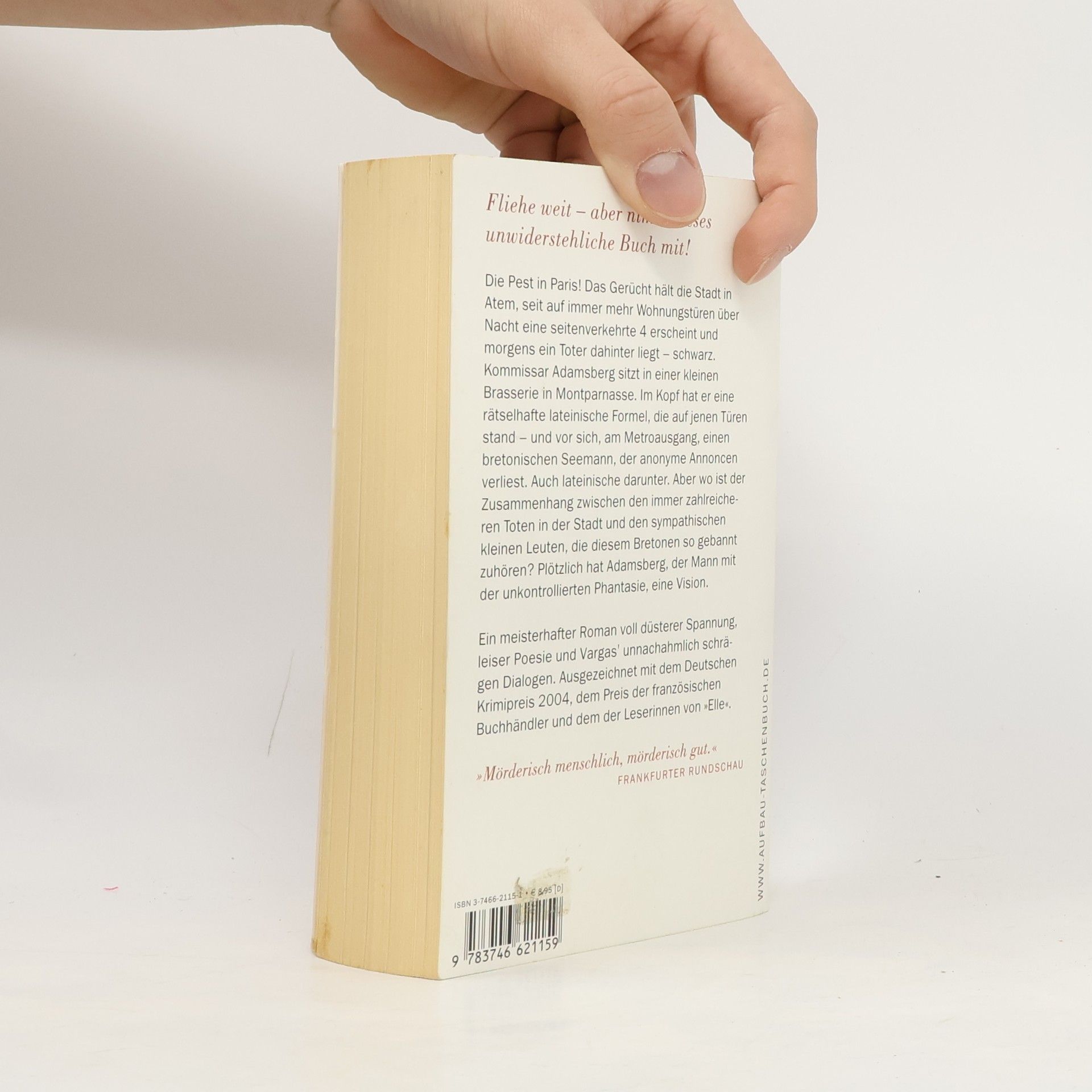 Fliehe weit und schnell Die Pest in Paris! Das Gerücht hält die Stadt in Atem, seit auf immer mehr Wohnungstüren über Nacht eine seitenverkehrte 4 erscheint und morgens ein Toter auf der Straße liegt - schwarz. Kommissar Adamsberg sitzt in einer kleinen Brasserie in Montparnasse. Im Kopf hat er eine rätselhafte lateinische Formel, die auf jenen Türen stand - und vor sich, am Metroausgang, einen bretonischen Seemann, der anonyme Annoncen verliest. Auch lateinische darunter. Aber wo ist der Zusammenhang zwischen den immer zahlreicheren Toten in der Stadt und den sympathischen kleinen Leuten, die dem Bretonen so gebannt zuhören? Plötzlich hat Adamsberg, der Mann mit der unkontrollierten Phantasie, eine Vision. Ein meisterhafter Roman voll düsterer Spannung, leiser Poesie und Vargas' unnachahmlich schrägen Dialogen. Ausgezeichnet mit dem Deutschen Krimipreis 2004, dem Preis der französischen Buchhändler und dem der Leserinnen von „Elle“. „Mörderisch menschlich, mörderisch gut.“ Frankfurter Rundschau