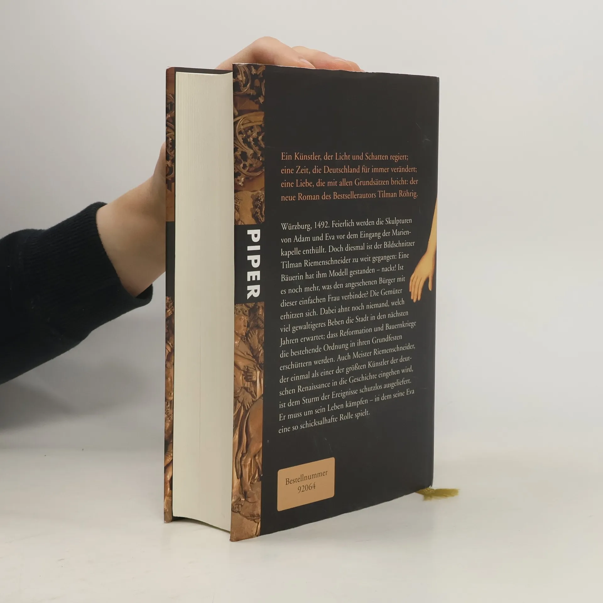 Wochenlang schon war Tilman Riemenschneider nach ihr auf der Suche gewesen: seiner Eva. Es war ein bedeutender Auftrag für die Stadt: die Skulpturen des ersten Menschenpaars vor dem Eingang der Marienkapelle. Doch nun geht der Bildschnitzer zu weit: eine Bäuerin, die ihm Modell steht – nackt! Im Würzburg des Jahres 1492 ein Skandal. Dabei ahnt noch niemand, welch viel gewaltigeres Beben die Stadt in den nächsten Jahren erwartet. Dass Reformation und Bauernkriege die bestehende Ordnung in ihren Grundfesten erschüttern werden. Auch Meister Riemenschneider, der einmal als einer der größten Künstler der deutschen Renaissance in die Geschichte eingehen wird, ist dem Sturm der Ereignisse schutzlos ausgeliefert. Er muss um sein Leben kämpfen, das so aussichtsreich begann – und in dem seine Eva eine schicksalhafte Rolle spielt.