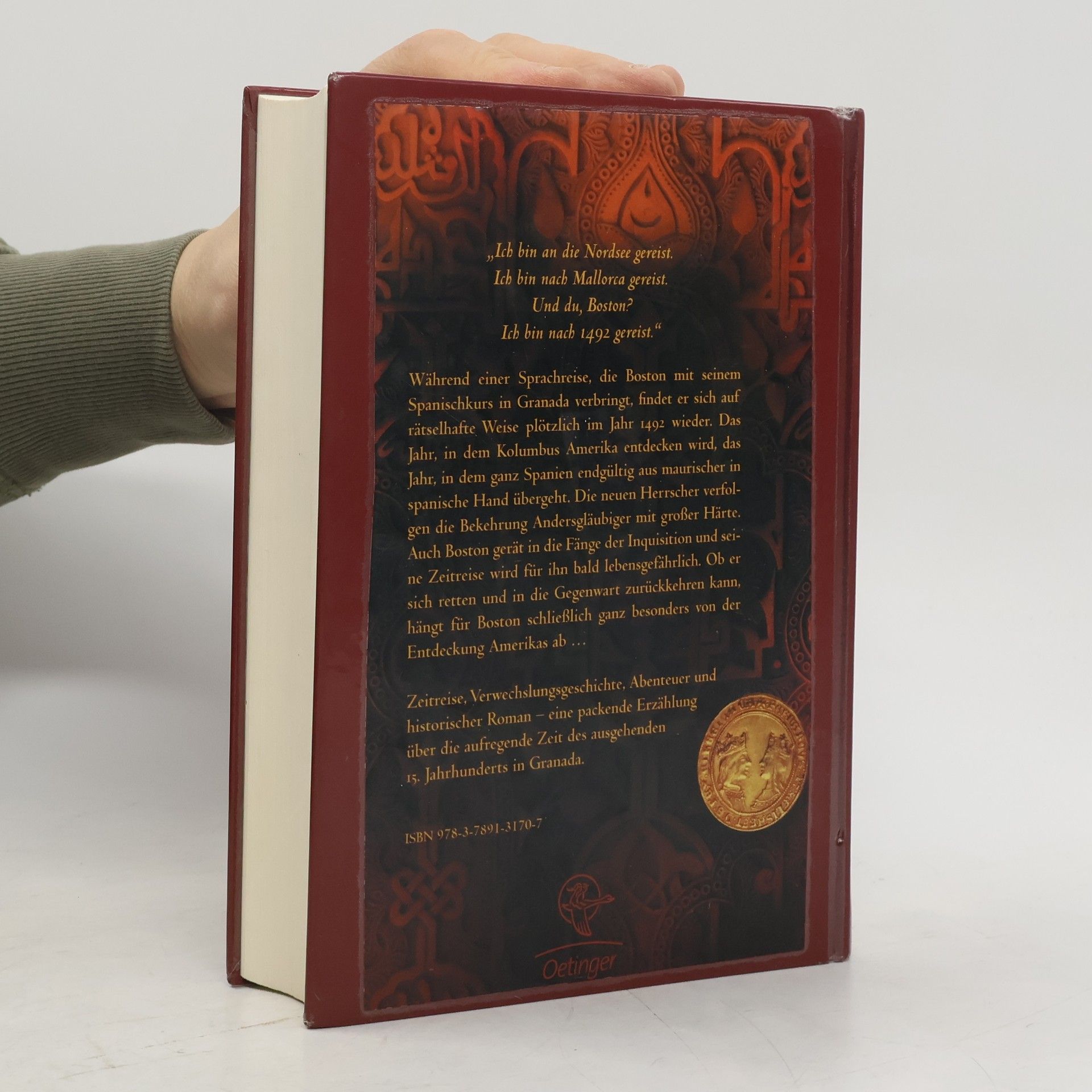 Granada, 1492. Ein Tor in der Zeit und plötzlich verändert sich die Welt …Gerade war Boston noch mit seinen Mitschülern auf dem arabischen Seidenmarkt in Granada. Plötzlich ist alles anders: Durch ein Tor in der Zeit ist Boston im Jahr 1492 gelandet. Dort wird es für ihn lebensgefährlich. Er erweckt Misstrauen am spanischen Königshof und auf der Alhambra gerät er in die grausamen Fänge der Inquisition. Doch zwei neue Freunde, Tariq und Salomon, als Muslim und Jude selbst bedroht, stehen ihm in dieser fast ausweglosen Situation bei. Aber die Rückkehr Bostons hängt nicht nur davon ab, ob er den Schlüssel zur Gegenwart findet, sondern auch von der Entdeckung Amerikas …