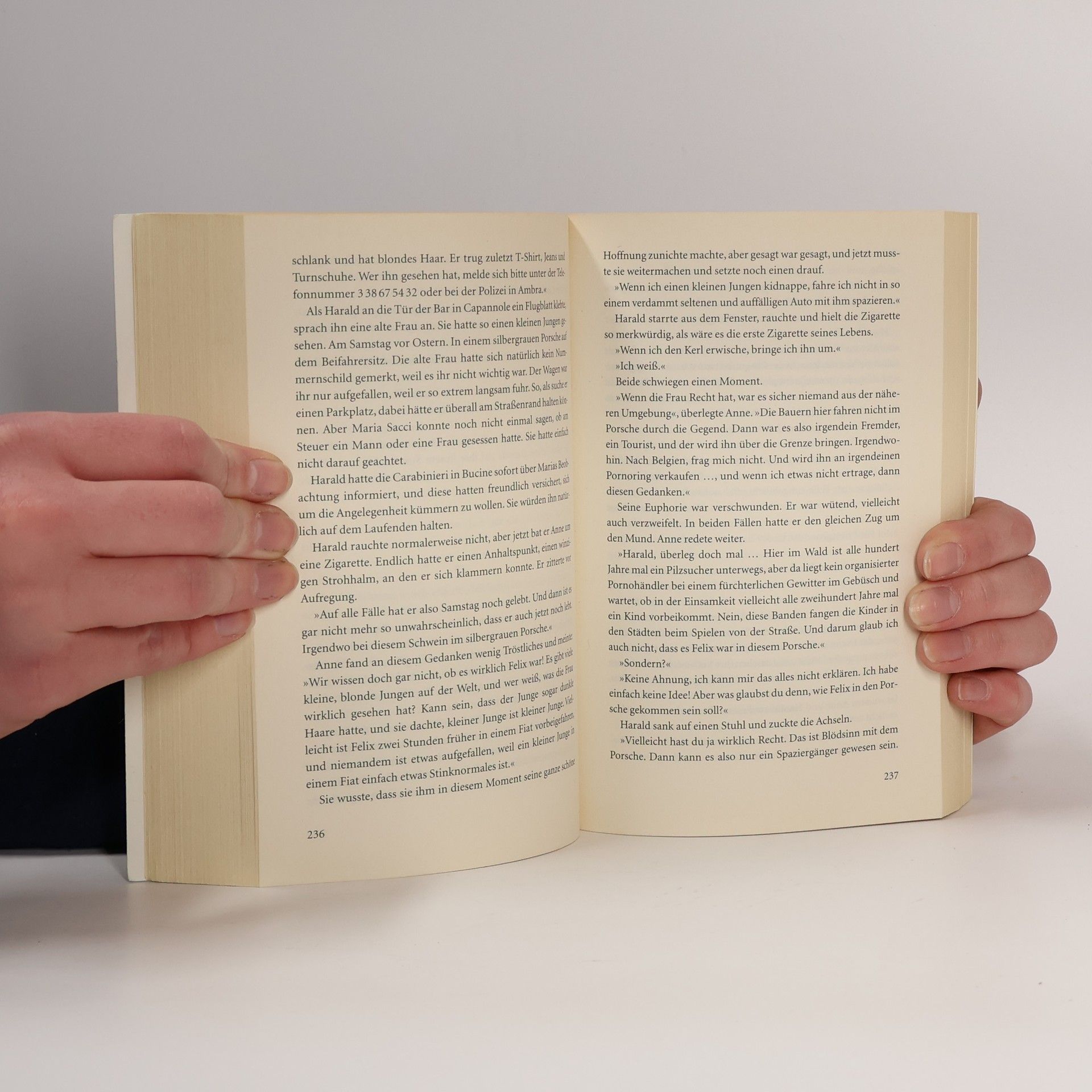Es geschieht am helllichten Tag Anne und ihr Mann Harald erleben den Albtraum aller Eltern: Während eines Toscana-Urlaubs verschwindet ihr Kind beim Spielen spurlos. Die Suche der Polizei verläuft ergebnislos, und sie müssen ohne ihren Sohn nach Hause fahren. Zehn Jahre später kehrt Anne an den Ort des Geschehens zurück, um herauszufinden, was damals passiert ist. Sie ahnt nicht, wie nah sie dem Täter kommt – und er ihr. Ein Roman, der einem zuweilen den Hals abschnürt, so schrecklich realistisch ist die Geschichte.