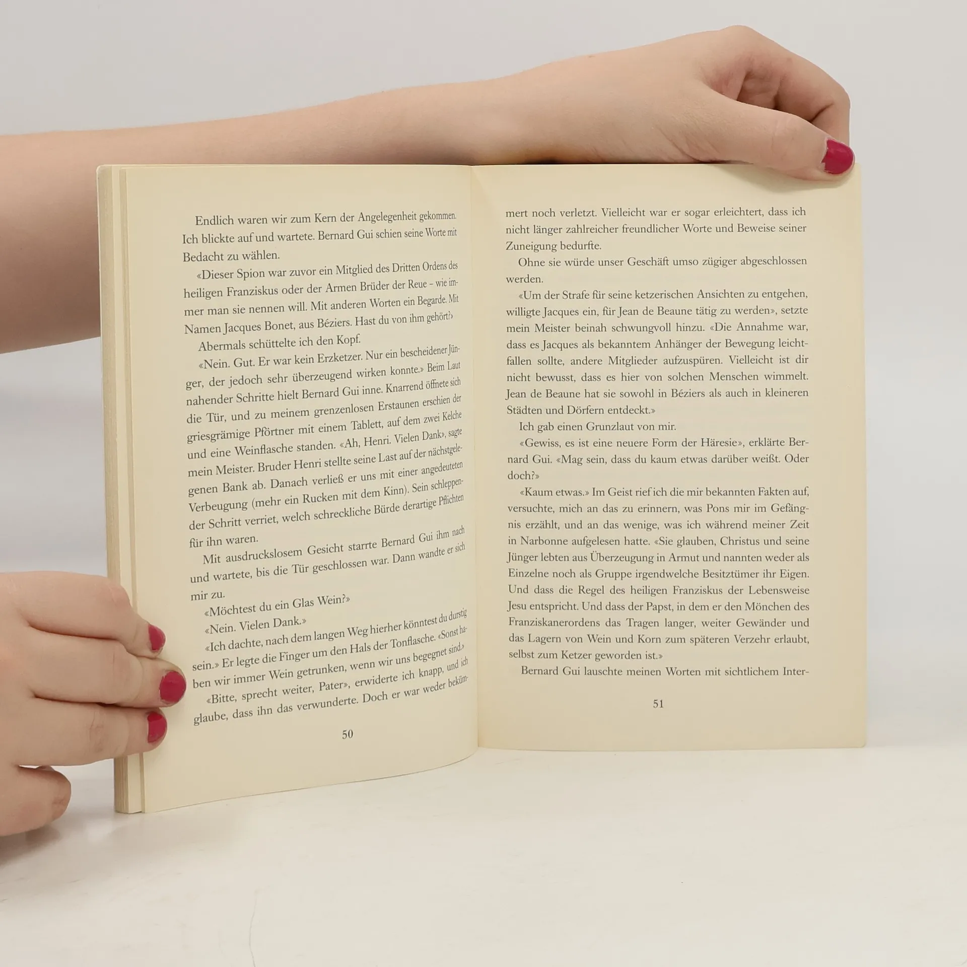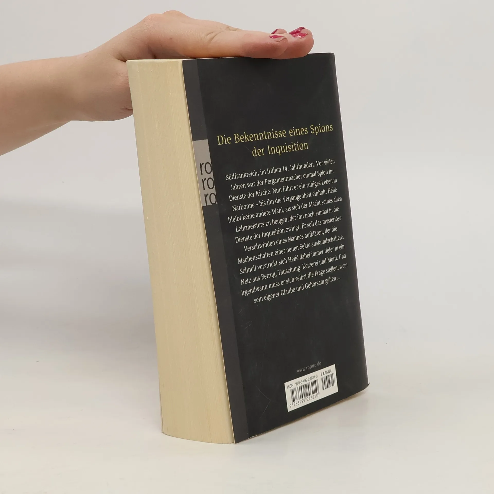 Die Bekenntnisse eines Spions der Inquisition Südfrankreich, im frühen 14. Jahrhundert. Vor vielen Jahren war der Pergamentmacher einmal Spion im Dienste der Kirche. Nun führt er ein ruhiges Leben in Narbonne – bis ihn die Vergangenheit einholt. Hélie bleibt keine andere Wahl, als sich der Macht seines alten Lehrmeisters zu beugen, der ihn noch einmal in die Dienste der Inquisition zwingt. Er soll das mysteriöse Verschwinden eines Mannes aufklären, der die Machenschaften einer neuen Sekte auskundschaftete. Schnell verstrickt sich Helié dabei immer tiefer in ein Netz aus Betrug, Täuschung, Ketzerei und Mord. Und irgendwann muss er sich selbst die Frage stellen, wem sein eigener Glaube und Gehorsam gelten…