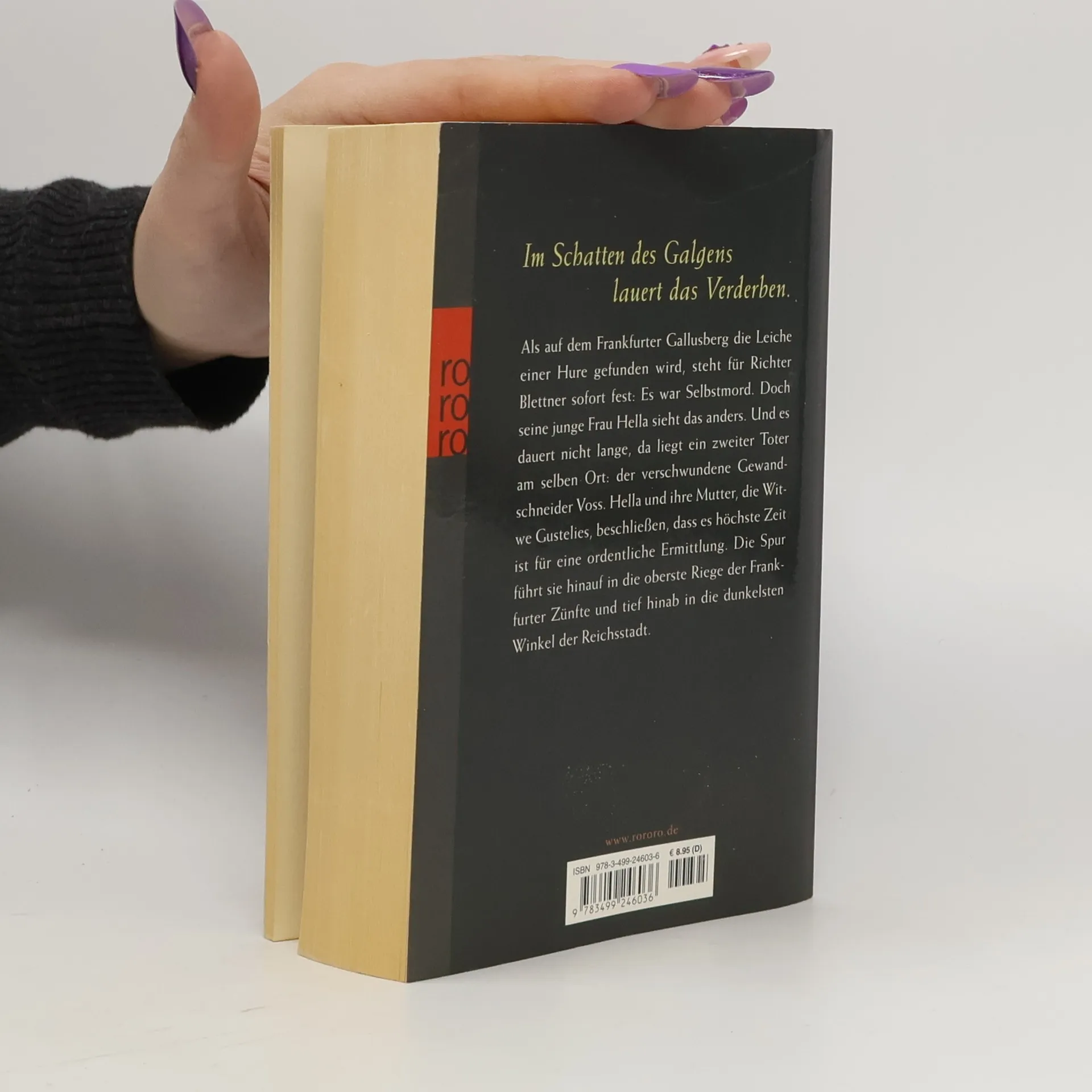 Im Schatten des Galgens lauert das Verderben.Als auf dem Frankfurter Gallusberg die Leiche einer Hure gefunden wird, steht für Richter Blettner sofort fest: Es war Selbstmord. Doch seine junge Frau Hella sieht das anders. Und es dauert nicht lange, da liegt ein zweiter Toter am selben Ort: der verschwundene Gewandschneider Voss. Hella und ihre Mutter, die Witwe Gustelies, beschließen, dass es höchste Zeit ist für eine ordentliche Ermittlung. Die Spur führt sie hinauf in die oberste Riege der Frankfurter Zünfte und tief hinab in die dunkelsten Winkel der Reichsstadt.