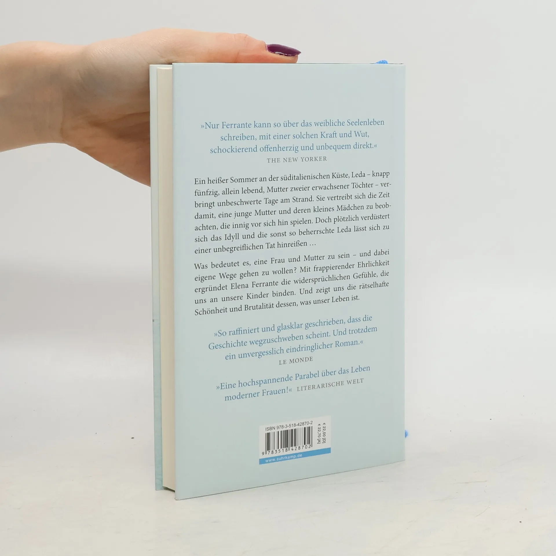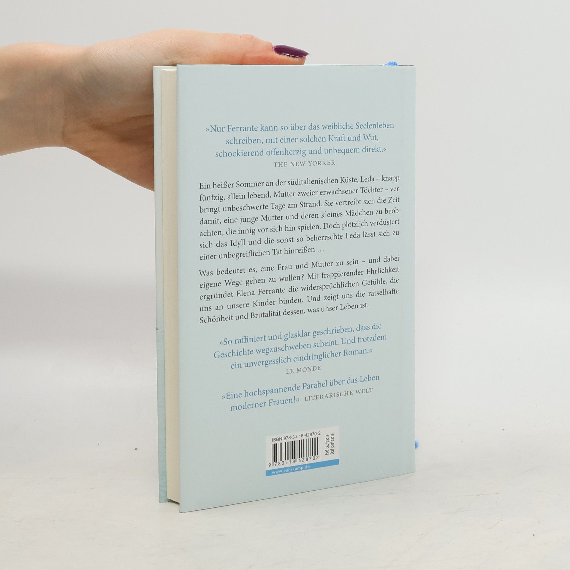 Leda ist fast fünfzig, geschieden, sie unterrichtet Englisch an der Universität in Florenz. Die erwachsenen Töchter sind jetzt beim Vater in Kanada, und Leda muss sich eingestehen, dass sie statt der erwarteten Sehnsucht vor allem Erleichterung empfindet. Den heißen Sommer verbringt sie in einem süditalienischen Küstenort: Bücher, Sonne, das Meer, was könnte friedlicher sein? Am Strand macht sich neben ihr allerdings eine übermütig lärmende neapolitanische Großfamilie breit, darunter eine noch junge Mutter und deren kleine Tochter. Leda beobachtet die beiden über Tage, zunächst fasziniert, wohlwollend. Allmählich aber schlägt ihre Stimmung um, irgendwann folgt sie einem Impuls und tut dem kleinen Mädchen und der Familie etwas Unbegreifliches an. Und wird selber heimgesucht, von lange verdrängten Erinnerungen – an gravierende Entscheidungen, die sie zu treffen hatte, ganz zum Leidwesen ihrer eigenen Töchter ... Was bedeutet es, eine Frau und Mutter zu sein? Mit frappierender Ehrlichkeit ergründet Elena Ferrante die widersprüchlichen Gefühle, die uns an unsere Kinder binden.