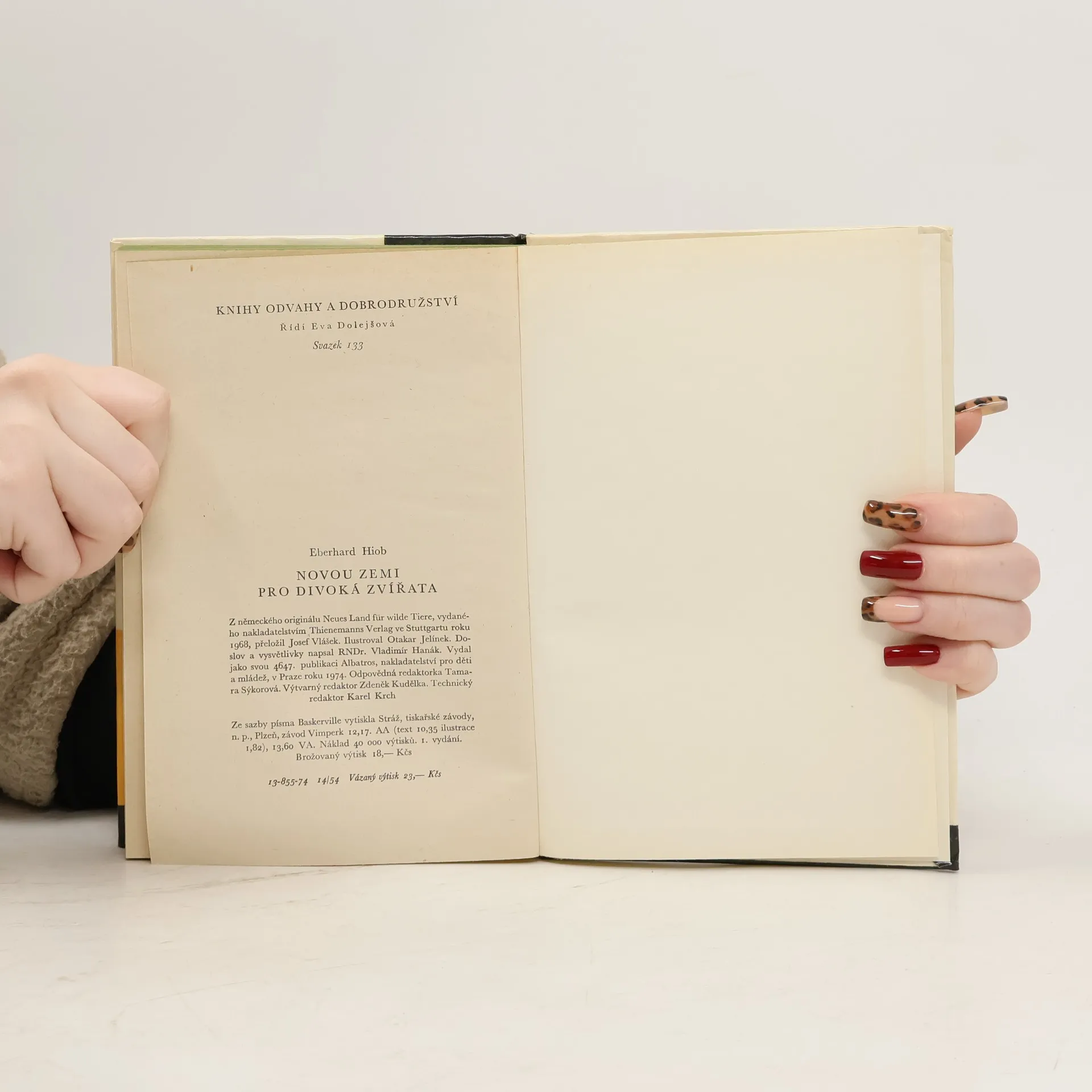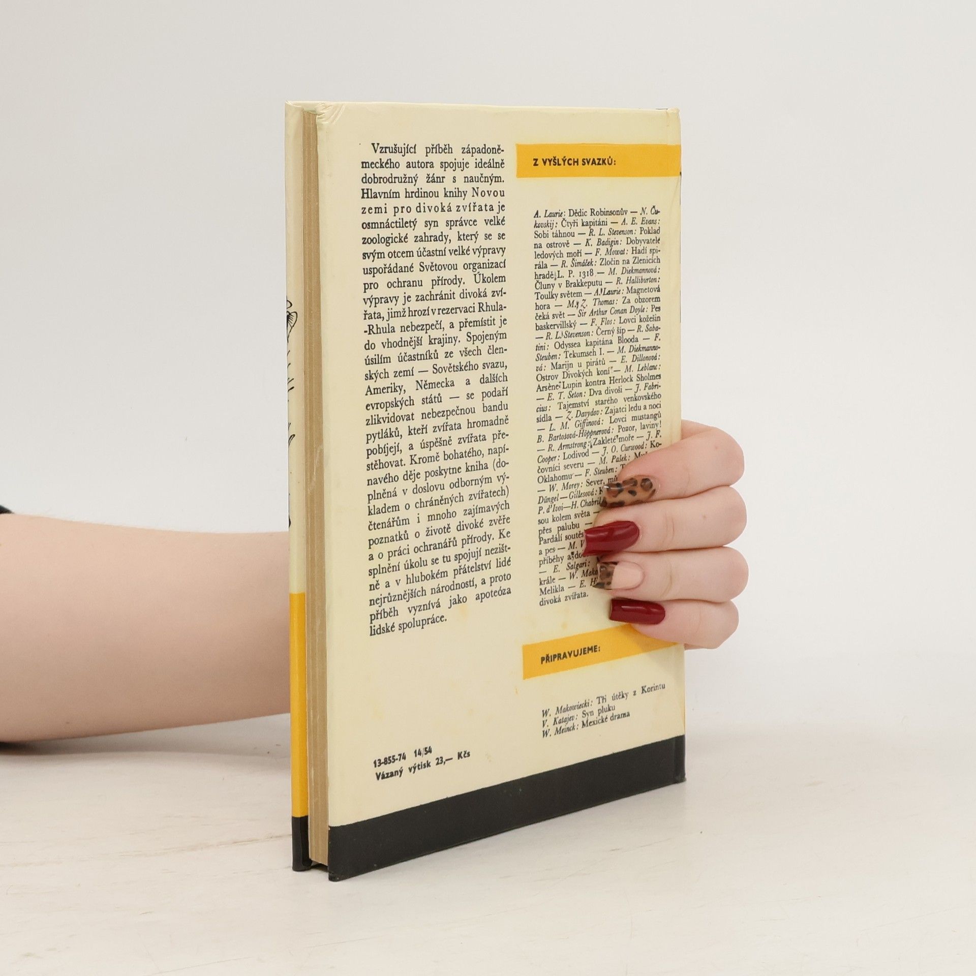 Vzrušující příběh západoněmeckého autora spojuje ideálně dobrodružný žánr s naučným. Hlavním hrdinou knihy Novou zemi pro divoká zvířata je osmnáctiletý syn správce velké zoologické zahrady, který se se svým otcem účastní velké výpravy uspořádané Světovou organizací pro ochranu přírody. Úkolem výpravy je zachránit divoká zvířata, jimž hrozí v rezervaci Rhula-Rhula nebezpečí, a přemístit je do vhodnější krajiny. Spojeným úsilím účastníků ze všech členských zemí – Sovětského svazu, Ameriky, Německa a dalších evropských států – se podaří zlikvidovat nebezpečnou bandu pytláků, kteří zvířata hromadně pobíjejí, a úspěšně zvířata přestěhovat. Kromě bohatého, napínavého děje poskytne kniha (doplněná v doslovu odborným výkladem o chráněných zvířatech) čtenářům i mnoho zajímavých poznatků o životě divoké zvěře a o práci ochranářů přírody. Ke splnění úkolu se tu spojují nezištně a v hlubokém přátelství lidé nejrůznějších národností, a proto příběh vyznívá jako apoteóza lidské spolupráce.Doslov, poznámku „O zvířatech, s kterými jsme se v této knize seznámili“ a vysvětlivky napsal RNDr. Vladimír Hanák.Edice: Knihy odvahy a dobrodružství – Svazek 133.Náklad 40 000 výtisků.ISBN 13-855-74.