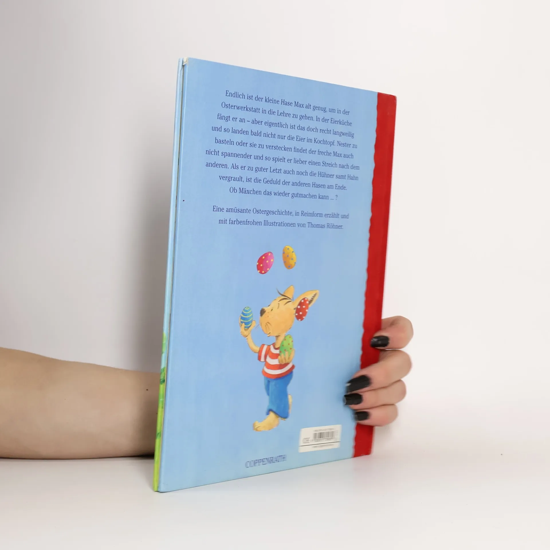 Endlich ist der kleine Hase Max alt genug, um in der Osterwerkstatt in die Lehre zu gehen. In der Eierküche fängt er an - aber eigentlich ist das doch recht langweilig und so landen bald nicht nur die Eier im Kochtopf. Nester zu basteln oder sie zu verstecken findet er auch nicht spannender und so spielt er lieber einen Streich nach dem anderen. Als er auch noch die Hühner samt Hahn vergrault, ist die Geduld der anderen Hasen am Ende. Ob Mäxchen das wieder gutmachen kann. ? Eine amüsante Ostergeschichte, in Reimform erzählt und mit farbenfrohen Illustrationen von Thomas Röhner.