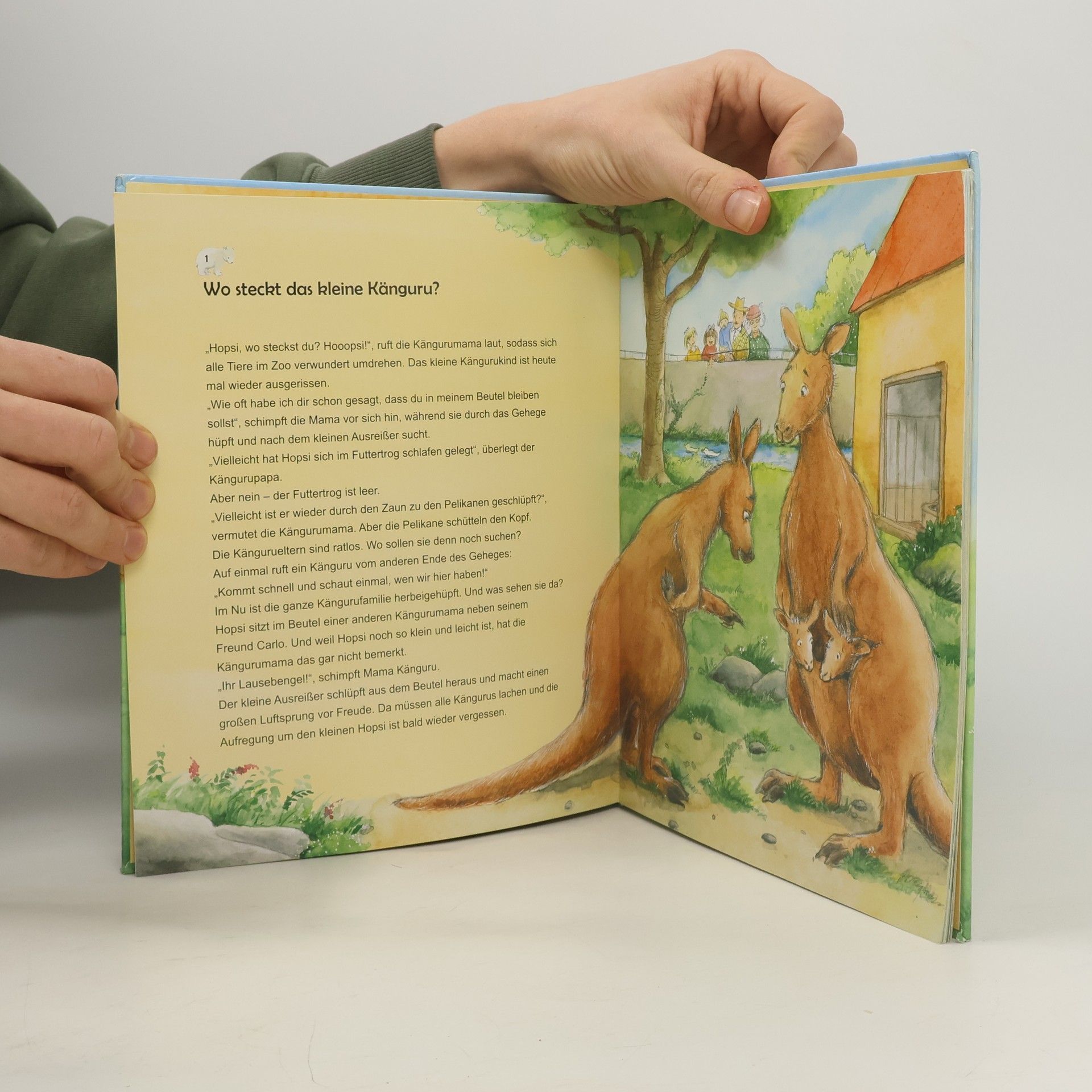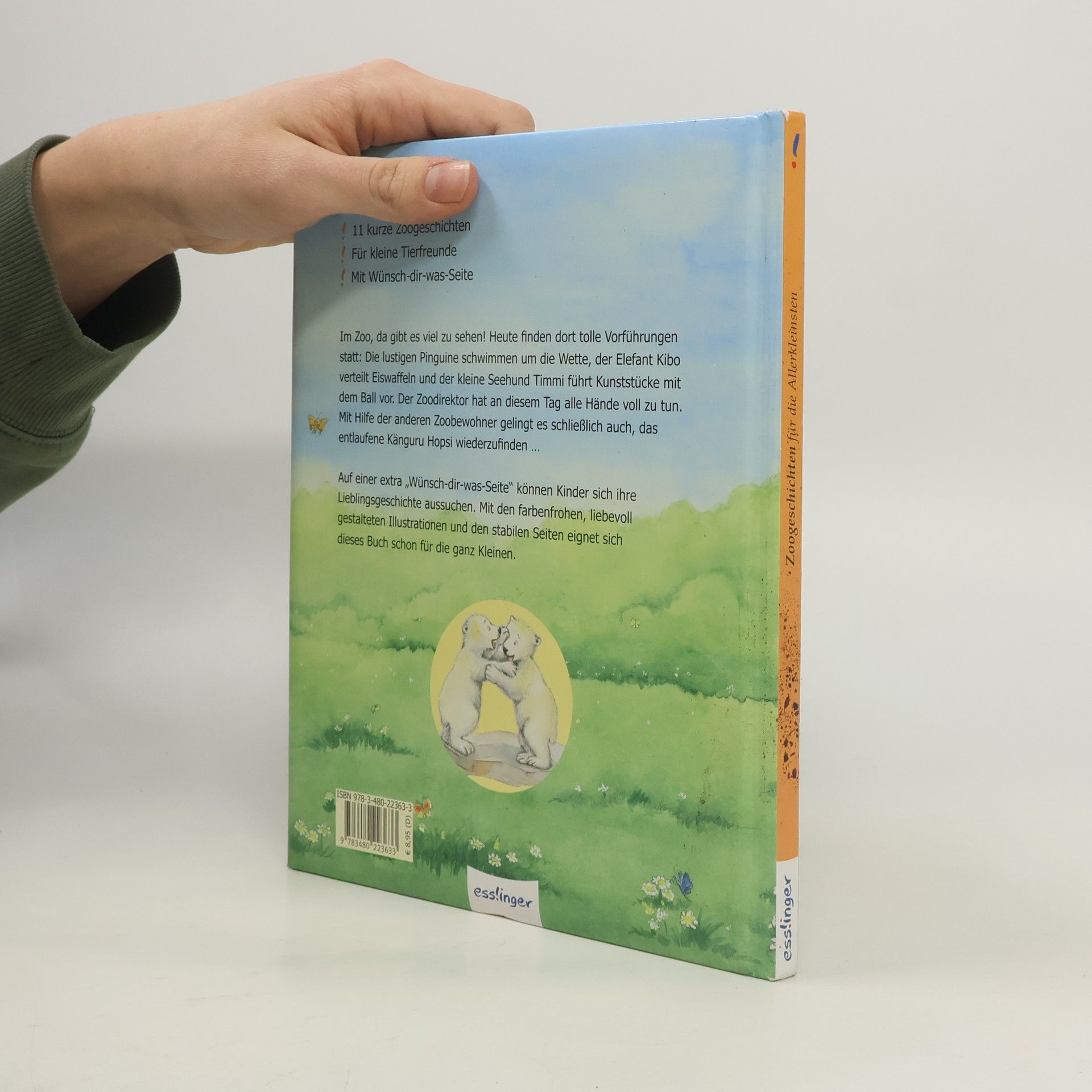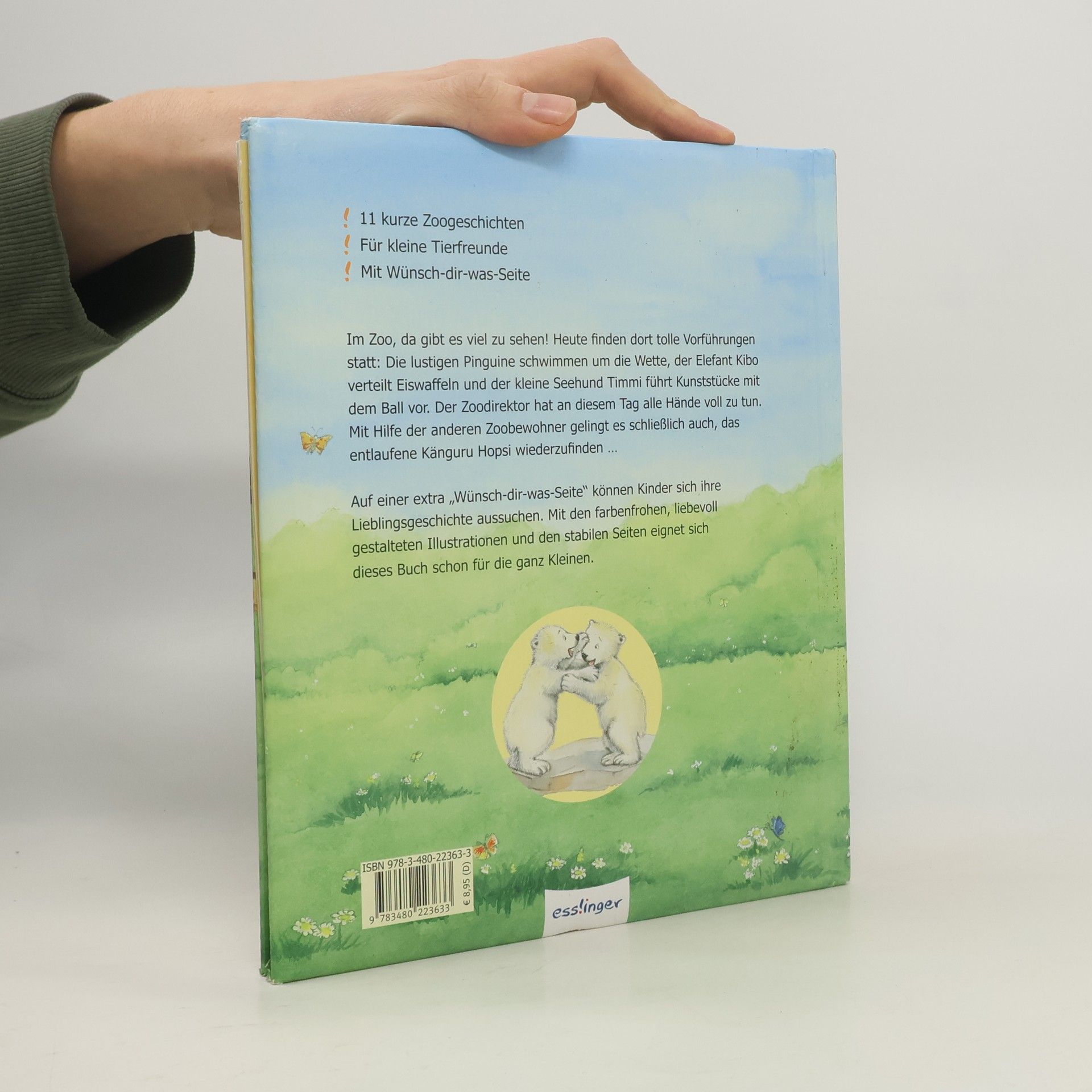 Im Zoo, da gibt es viel zu sehen! Heute finden dort tolle Vorführungen statt: Die lustigen Pinguine schwimmen um die Wette, der Elefant Kibo verteilt Eiswaffeln und der kleine Seehund Timmi führt Kunststücke mit dem Ball vor. Der Zoodirektor hat an diesem Tag alle Hände voll zu tun. Mit Hilfe der anderen Zoobewohner gelingt es schließlich auch, das entlaufene Känguru Hopsi wiederzufinden … Mit den farbenfrohen, liebevoll gestalteten Illustrationen und den stabilen Seiten eignet sich dieses Buch schon für die ganz Kleinen. Als besonderes Extra gibt es eine "Wünsch-dir-was-Seite": Die Kinder wählen selbst ihre Lieblingsgeschichte auf einer Geschichten-Übersichtsseite.