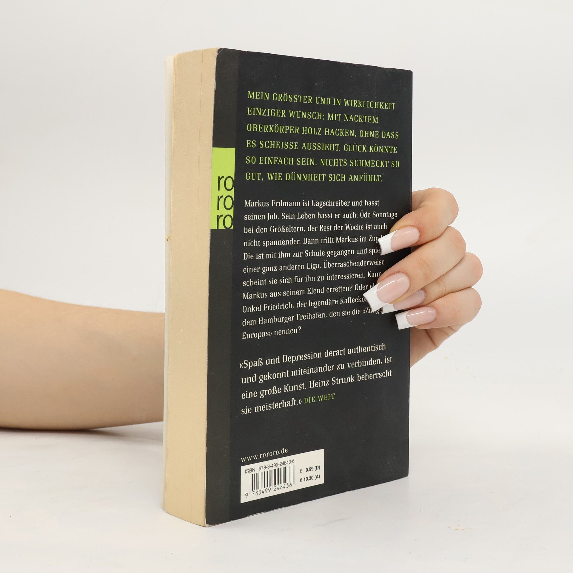 MEIN GRÖSSTER UND IN WIRKLICHKEIT EINZIGER WUNSCH: MIT NACKTEM OBERKÖRPER HOLZ HACKEN, OHNE DASS ES SCHEISSE AUSSIEHT. GLÜCK KÖNNTE SO EINFACH SEIN. NICHTS SCHMECKT SO GUT, WIE DÜNNHEIT SICH ANFÜHLT. Markus Erdmann ist Gagschreiber und hasst seinen Job. Sein Leben hasst er auch. Öde Sonntage bei den Großeltern, der Rest der Woche ist auch nicht spannender. Dann trifft Markus im Zug Janne. Die ist mit ihm zur Schule gegangen und spielt in einer ganz anderen Liga. Überraschenderweise scheint sie sich für ihn zu interessieren. Kann sie Markus aus seinem Elend erretten? Oder eher Onkel Friedrich, der legendäre Kaffeekoster aus dem Hamburger Freihafen, den sie die «Zunge Europas» nennen? «Spaß und Depression derart authentischund gekonnt miteinander zu verbinden, ist eine große Kunst. Heinz Strunk beherrscht sie meisterhaft.» (Die Welt)
