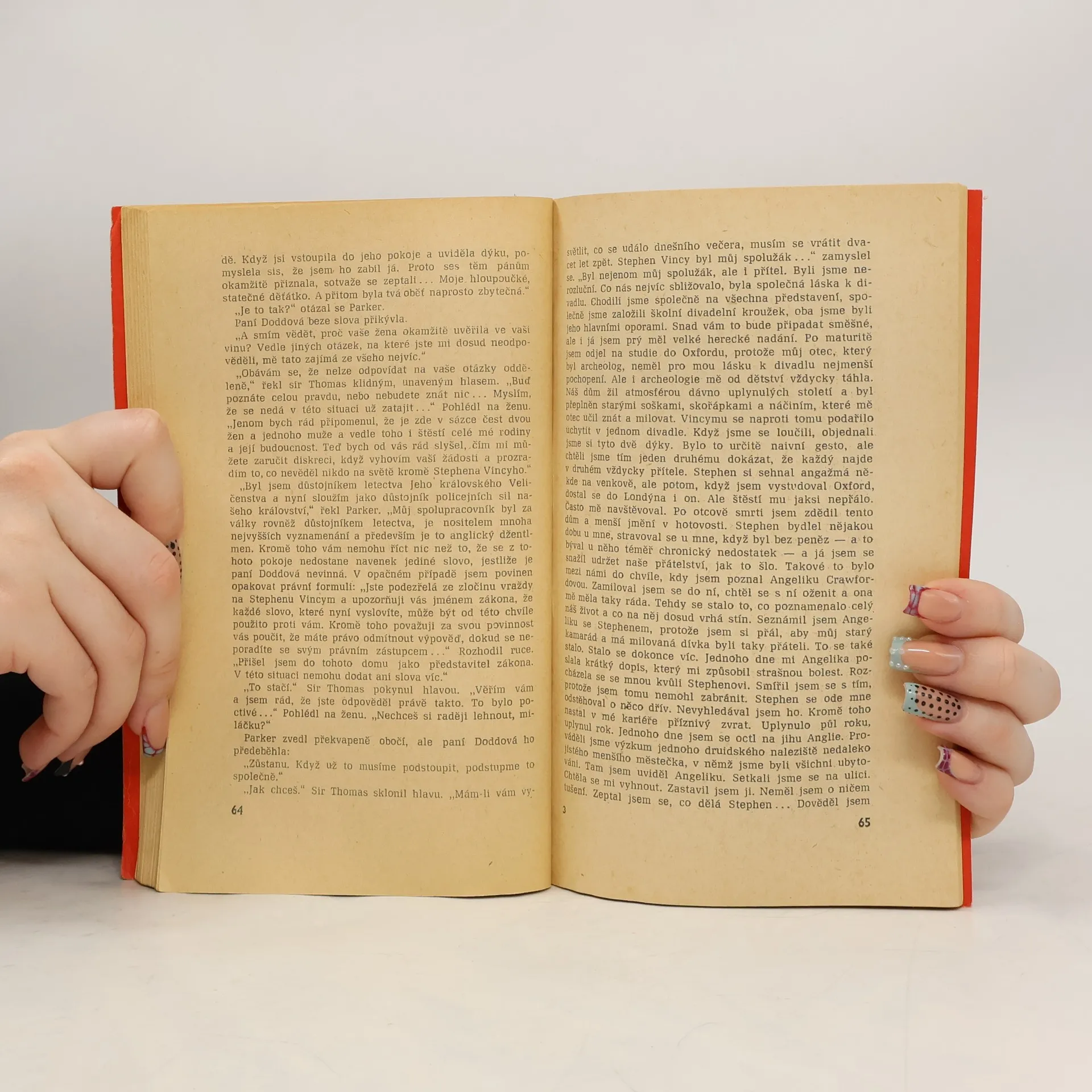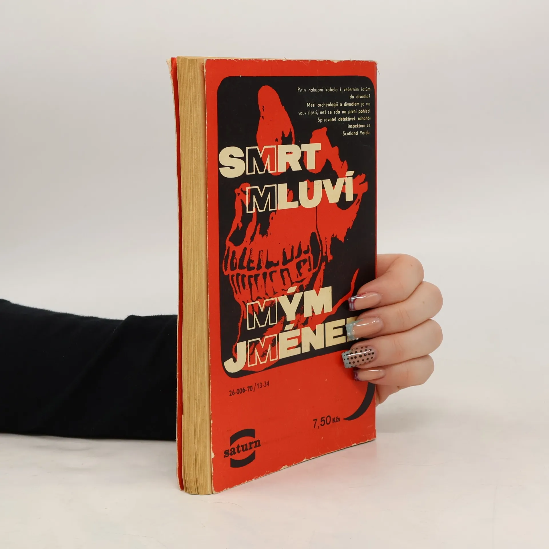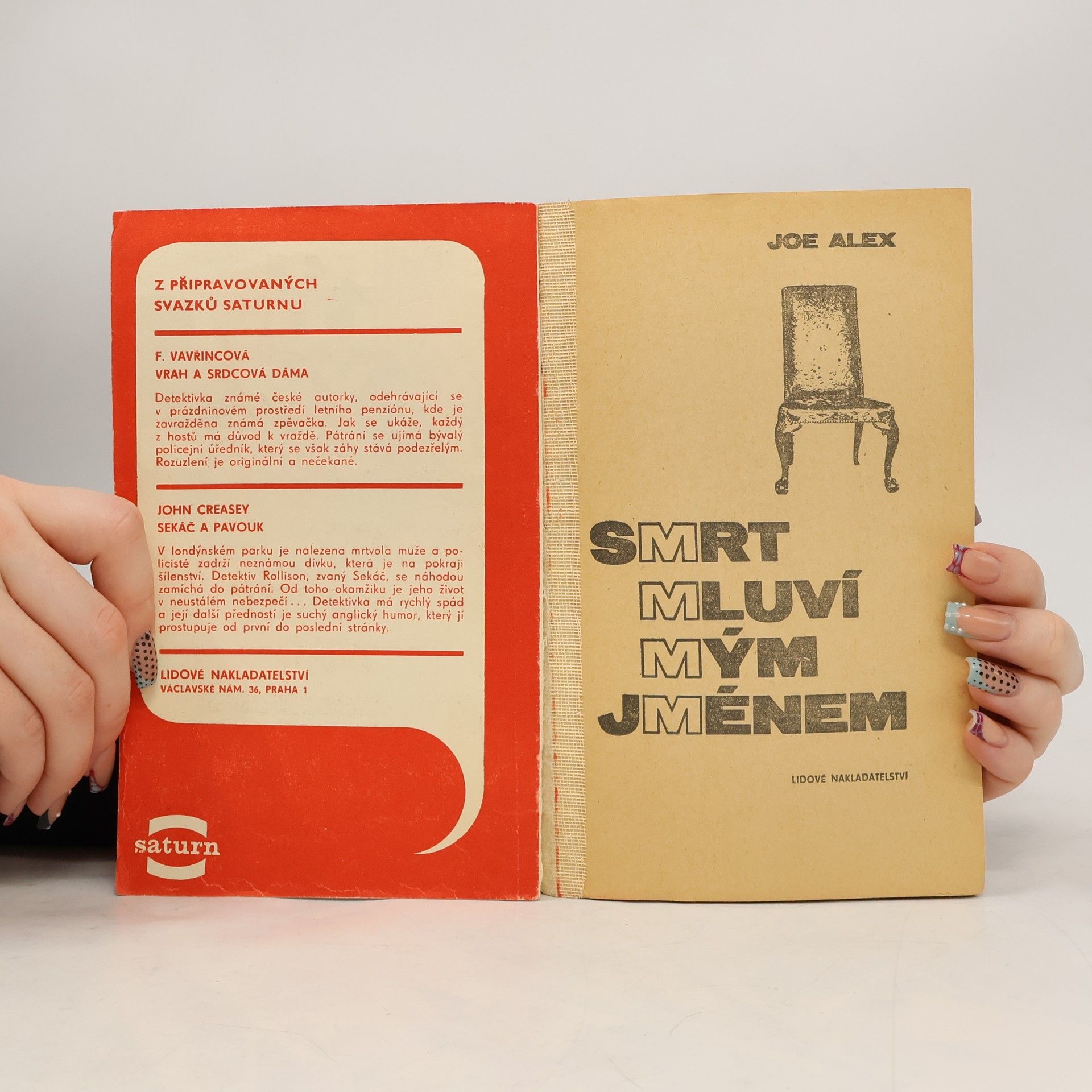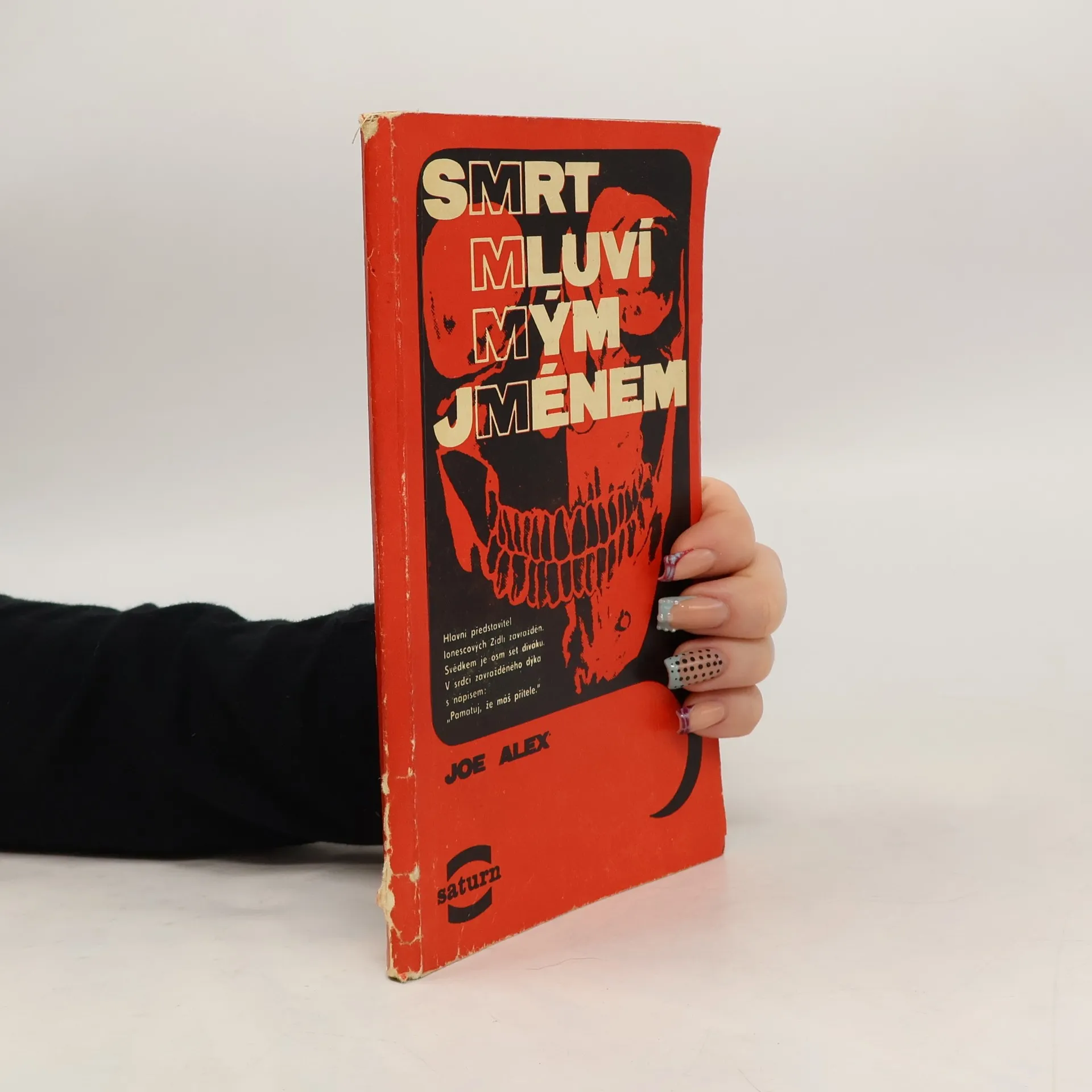 Originální zápletku v detektivním románě z poválečného anglického prostředí tvoří skutečnost, že divadelní herec, který je po představení nalezen ve své šatně mrtev s dýkou v srdci, zemřel podle pitvy a lékařského posudku dříve, než skončilo představení, ve kterém podle divákůa dvou náhodně přítomných pozdějších detektivů hrál až do konce. Tuto záhadu se podaří rozluštit dvěma přátelům, z nichž první, Benjamín Parker, inspektor Scotland Yardu, se v pátrání dobrovolně podřizuje druhému, spisovateli detektivních románů Joe Alexovi. Z polského originálu „Śmierć mówi w moim imieniu“, vydaného nakladatelstvím Iskry, Warszawa 1960, přeložila Anetta Balajková. 1. vydání.