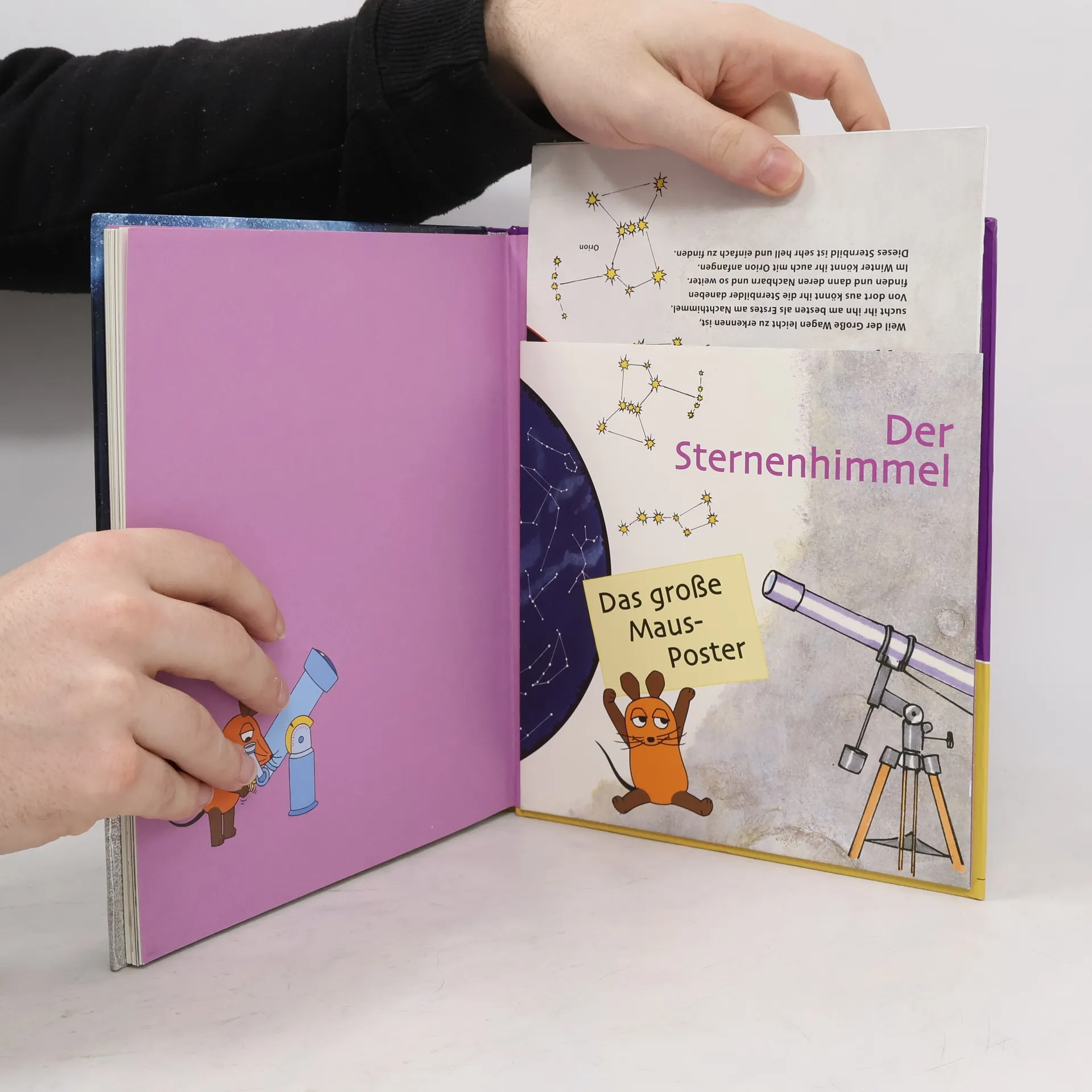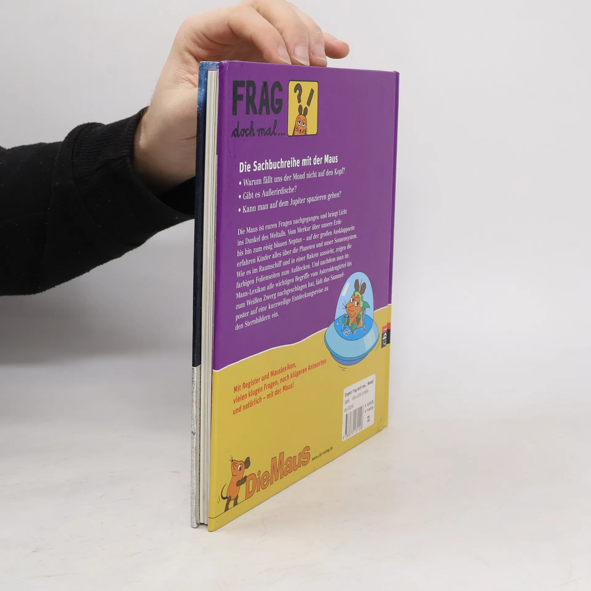 Wenn Kinder Fragen stellen und Erwachsene nicht weiter wissen, heißt es: „Frag doch mal die Maus!“ Seit 35 Jahren haben die „Sachgeschichten“ in vielen Familien einen besonderen Stellenwert: Sowohl Kinder als auch Erwachsene sind fasziniert, wenn die „MAUS“ die Welt erklärt. Die Sendung hat Kultstatus, weil sie Kinderfragen ernst nimmt und intensiv darauf eingeht. Diese Sachbuchreihe folgt diesem Prinzip, indem sie einfache, verblüffende Fragen aufgreift und komplexe Themen Schritt für Schritt erklärt – spielerisch, sachlich fundiert und kindgerecht. Warum fällt uns der Mond nicht auf den Kopf? Gibt es Außerirdische? Woraus besteht die Milchstraße? Anschaulich wird unser Sonnensystem auf einer großen Panorama-Aufklappseite dargestellt. Farbig illustrierte Folienseiten zeigen, wie es in Raumschiffen und Raketen aussieht. Das Maus-Lexikon bietet Erklärungen zu wichtigen Begriffen, während ein großes Sammelposter zu einer spannenden Entdeckungsreise durch die Sternbilder einlädt. Jeder Band enthält: zentrale Themen, Antworten auf Kinderfragen, sorgfältig recherchierte Informationen von renommierten Autoren, kindgerechte Bebilderungen und eine enge Zusammenarbeit mit der MAUS-REDAKTION, die Qualität und Originalität garantiert. Hochwertige Ausstattung und zahlreiche Extras unterstreichen den spielerischen Charakter.