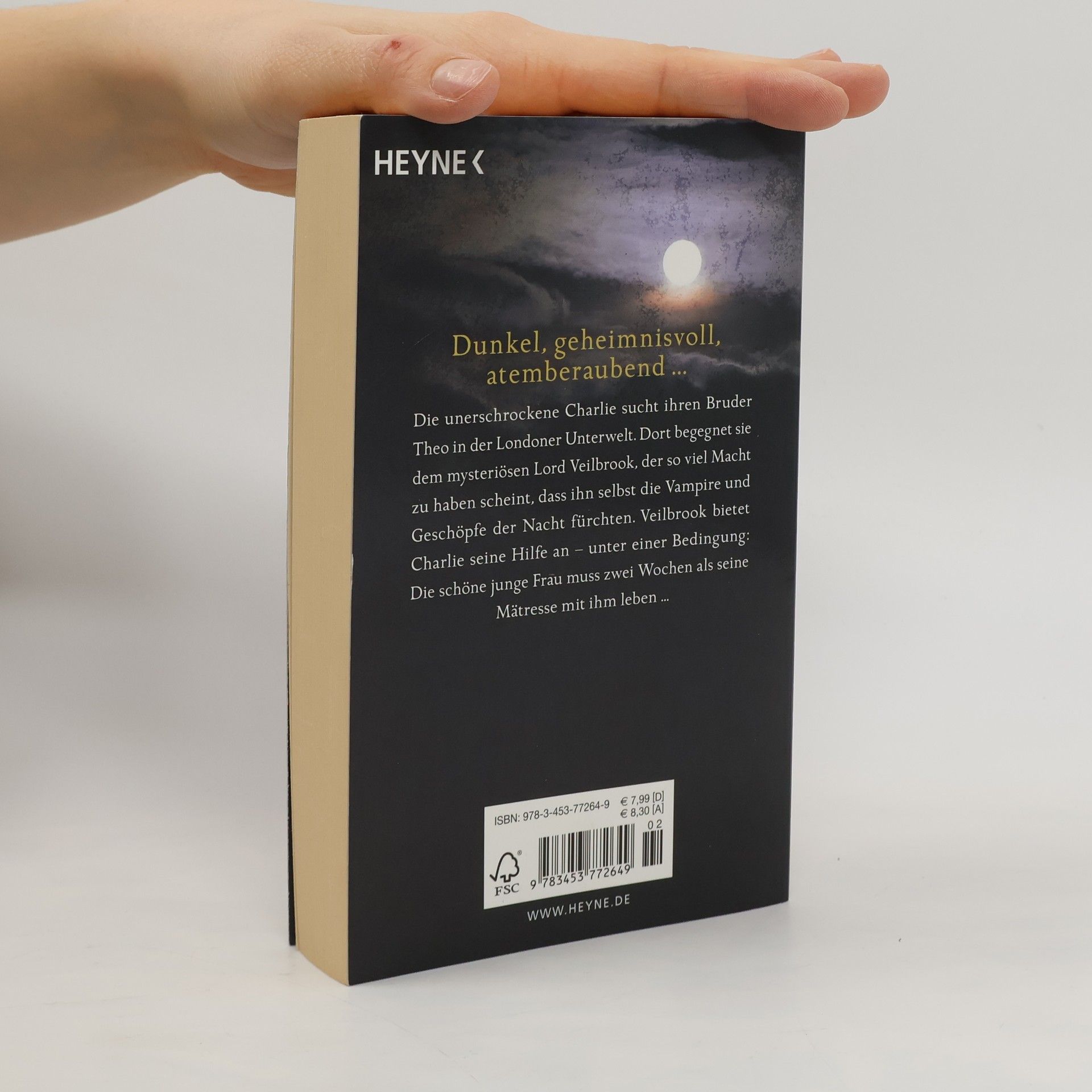 Ein Vampir zum Verlieben Die unerschrockene Charlie sucht ihren Bruder Theo in der Londoner Unterwelt. Dort begegnet sie dem mysteriösen Lord Veilbrook, der so viel Macht zu haben scheint, dass ihn selbst die Vampire und Geschöpfe der Nacht fürchten. Veilbrook bietet Charlie seine Hilfe an - unter einer Bedingung: Die schöne junge Frau muss zwei Wochen als seine Mätresse mit ihm leben.