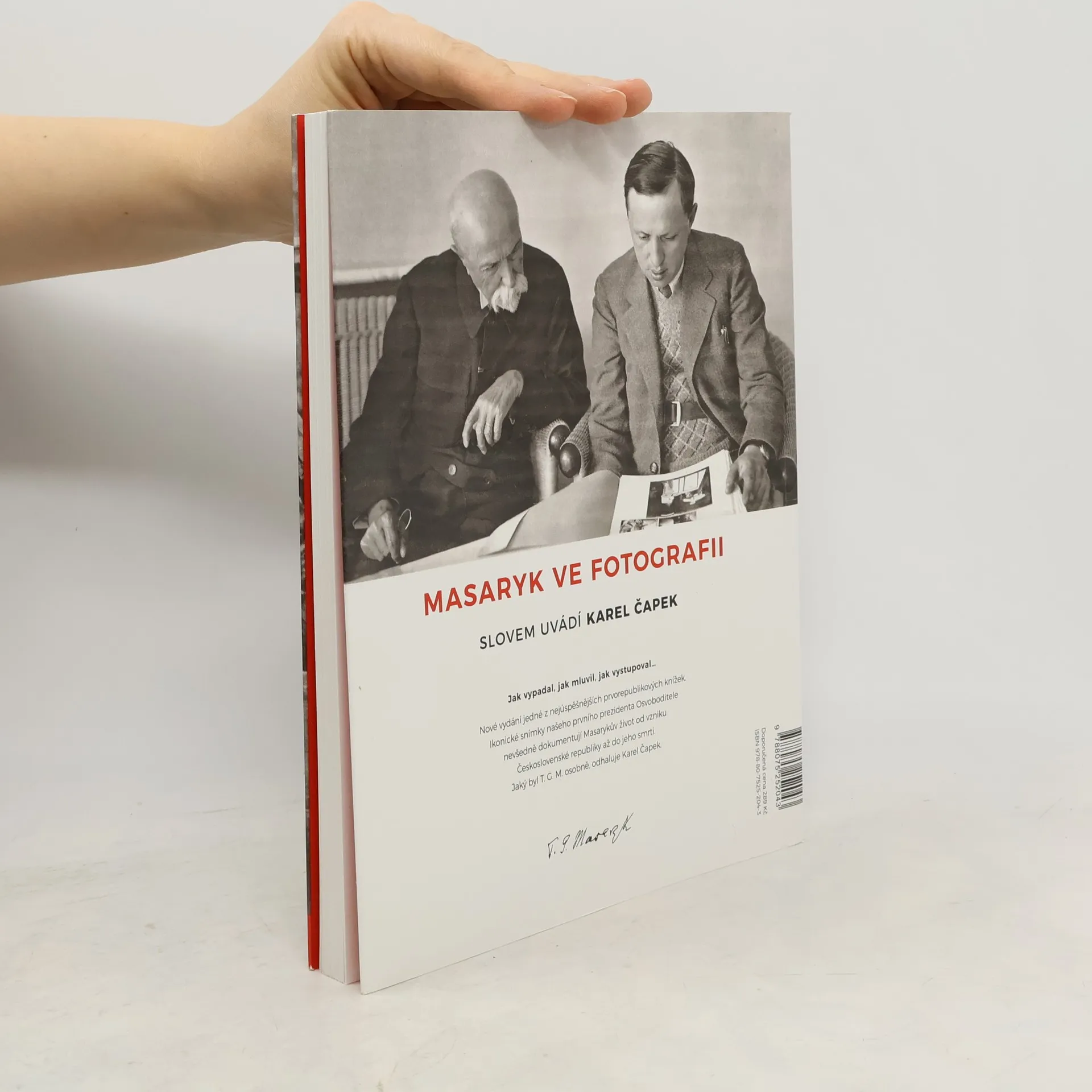 Jak vypadal, jak mluvil, jak vystupoval.... Nové vydání jedné z nejúspěšnějších prvorepublikových knížek. Ikonické snímky našeho prvního prezidenta Osvoboditele, které nevšedně dokumentují Masarykův život do vzniku Československé republiky až do jeho smrti. Jaký byl T. G. M. osobně, odhaluje Karel Čapek. Snímky ze života T. G. M. pořídil spisovatel Karel Čapek, fotograf Karel Plicka, osobní archivář prezidenta Vasil Škrach, oficiální hradní fotograf Jano Šrámek, prezidentův tajemník Jaroslav Císař, profesionální fotoateliéry jako Tomáš Vojta či architekt Jindřich Vaněk i neznámi fotografové pracující pro agentury Centropress, ČTK, Legie, Tatra Trenčín nebo Ministerstvo národní obrany.