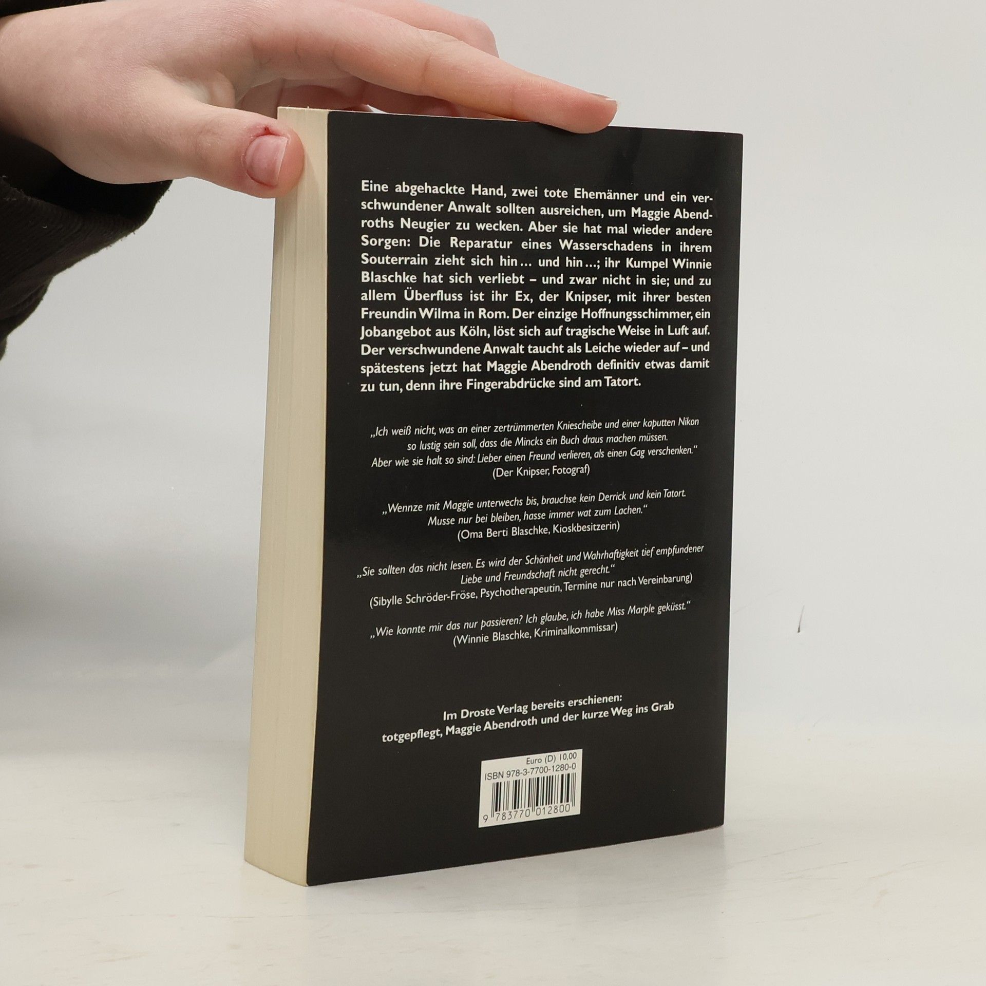 Ihr Aufenthalt im schönen Kurort Bad Camberg endet alles andere als entspannend. Bei einer Schnitzeljagd durch den Wald wird eine abgehackte Hand gefunden, die bei Maggie, wie üblich, zunächst nur mäßiges Interesse weckt. Zurück in Bochum gibt es statt erholsamer Nachkur noch mehr rätselhafte Todesfälle. Als auch noch ein alter Schulfreund von Maggie tot aufgefunden wird, muss sie sich ernsthaft Sorgen machen, denn ihre Fingerabdrücke sind am Tatort. - Mit ihrem Sinn für rabenschwarzen Humor schicken die beiden Bochumer Autorinnen ihre widerspenstige Maggie Abendroth auf eine aberwitzige "Tour de Force".