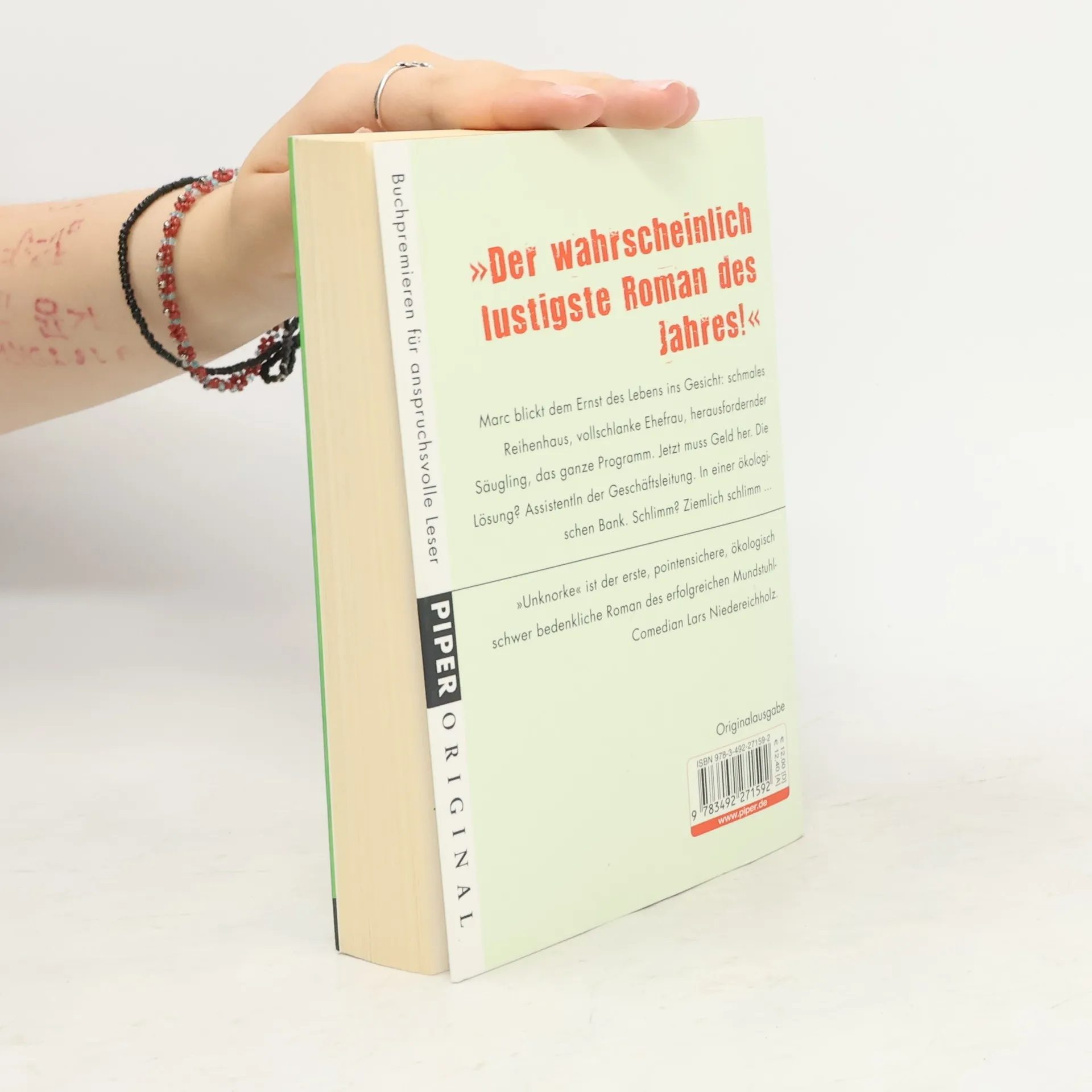'Das hört sich doch ganz knorke an.' – Arnulf und Almut von der Ökokreditbank suchen eine ›AssistentIn der Geschäftsleitung‹ und sind ganz entzückt von Marc. Nach 16 Semestern blickt der dem Ernst des Lebens ins Gesicht: Reihenhaus-schicksal, Frau schwanger. Jetzt muss Geld her. Deshalb beißt Marc die Zähne zusammen und sagt beim Vorstellungsgespräch den einzigen Satz, den die bescheuerten Ökos von ihm hören wollen: 'Ja, ich möchte die Welt ein kleines Stückchen besser machen.' Dass es eine Welt aus liebestollen Bongolehrern, heimatlosen Robben und indianischen Hochzeitszeremonien sein wird, ist ihm zu dem Zeitpunkt nicht bewusst. – 'Unknorke' ist der haarsträubende und pointensichere, haarscharf neben unserem eigenen Alltag liegende erste Roman des Comedian Lars Niedereichholz.