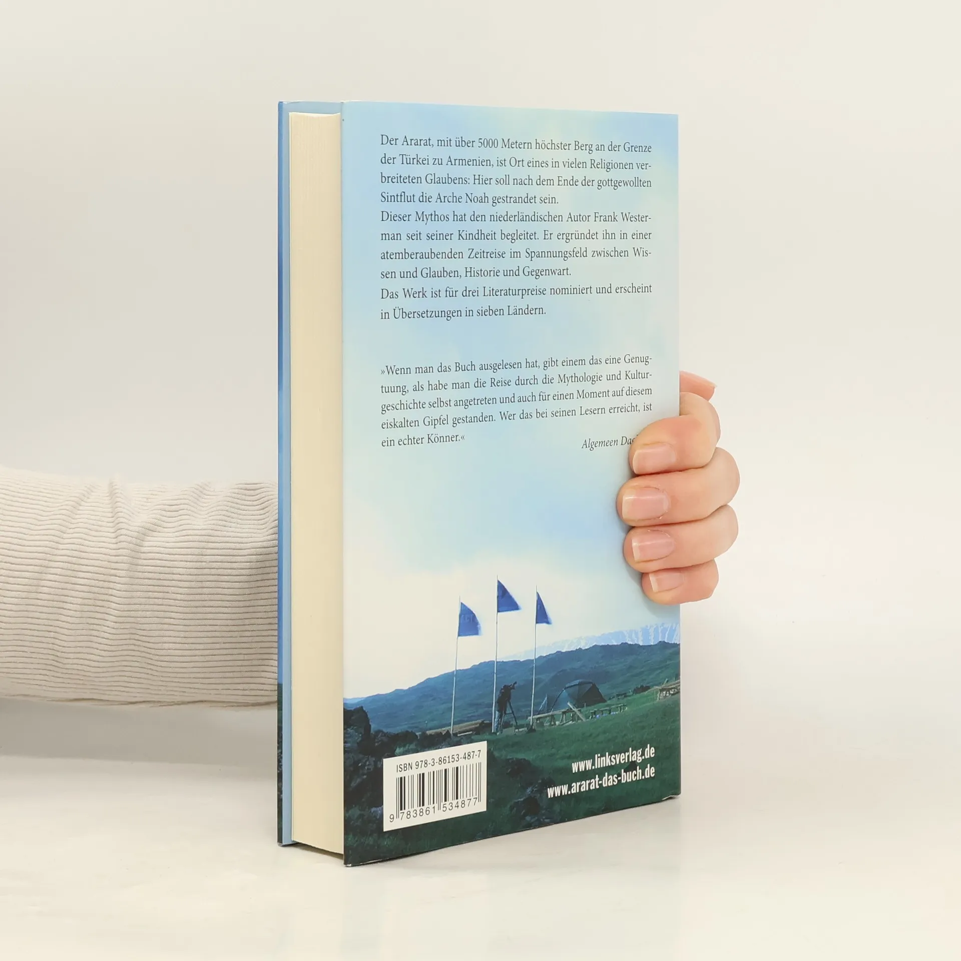 Der Ararat, mit über 5000 Metern höchster Berg an der Grenze der Türkei zu Armenien, ist Ort eines in vielen Religionen verbreiteten Glaubens: Hier soll nach dem Ende der gottgewollten Sintflut die Arche Noah gestrandet sein. Dieser Mythos hat den niederländischen Autor Frank Westerman seit seiner Kindheit begleitet. Er ergründet ihn in einer atemberaubenden Zeitreise im Spannungsfeld zwischen Wissen und Glauben, Historie und Gegenwart. Das Werk ist für drei Literaturpreise nominiert und erscheint in Übersetzungen in sieben Ländern.