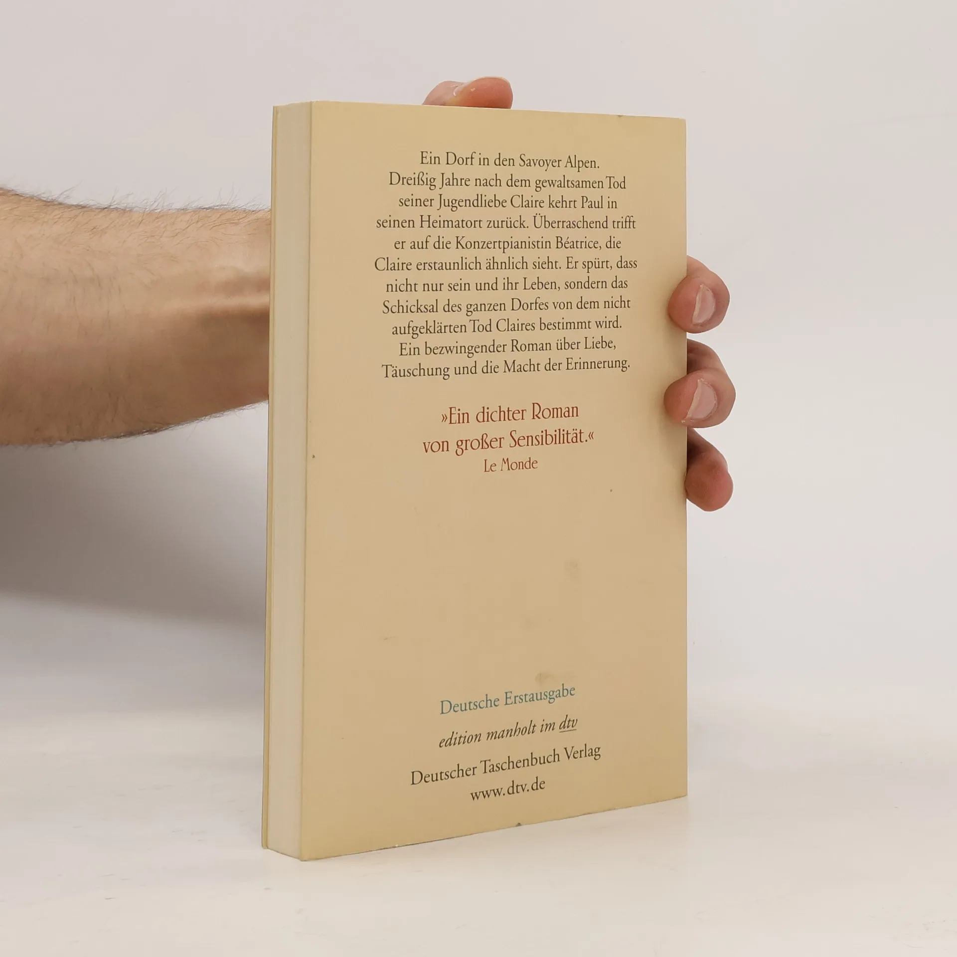 Ein Dorf in den Savoyer Alpen. Dreißig Jahre nach dem gewaltsamen Tod seiner Jugendliebe Claire kehrt Paul in seinen Heimatort zurück. Überraschend trifft er auf die Konzertpianistin Béatrice, die Claire erstaunlich ähnlich sieht. Er spürt, dass nicht nur sein und ihr Leben, sondern das Schicksal des ganzen Dorfes von dem nicht aufgeklärten Tod Claires bestimmt wird. Ein bezwingender Roman über Liebe, Täuschung, die Macht der Verdrängung sowie die Macht der Erinnerung. Ausgezeichnet mit dem Prix littéraire Rosine Perrier.